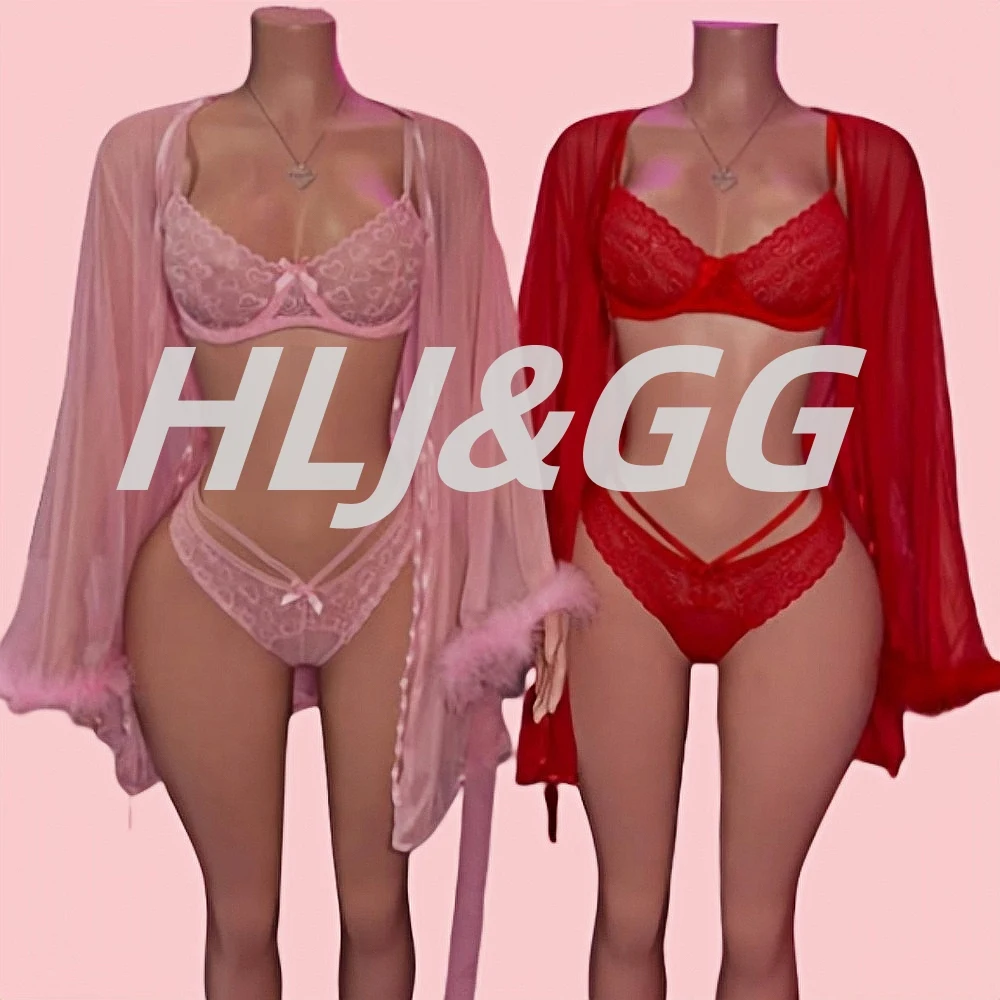 HLJ&GG Sexy Lace See Though 3 Pieces Home Nightgown Sets Women Bra + Thong + Feather Cuffs Long Sleeve Kimino Robe Outfits 2025