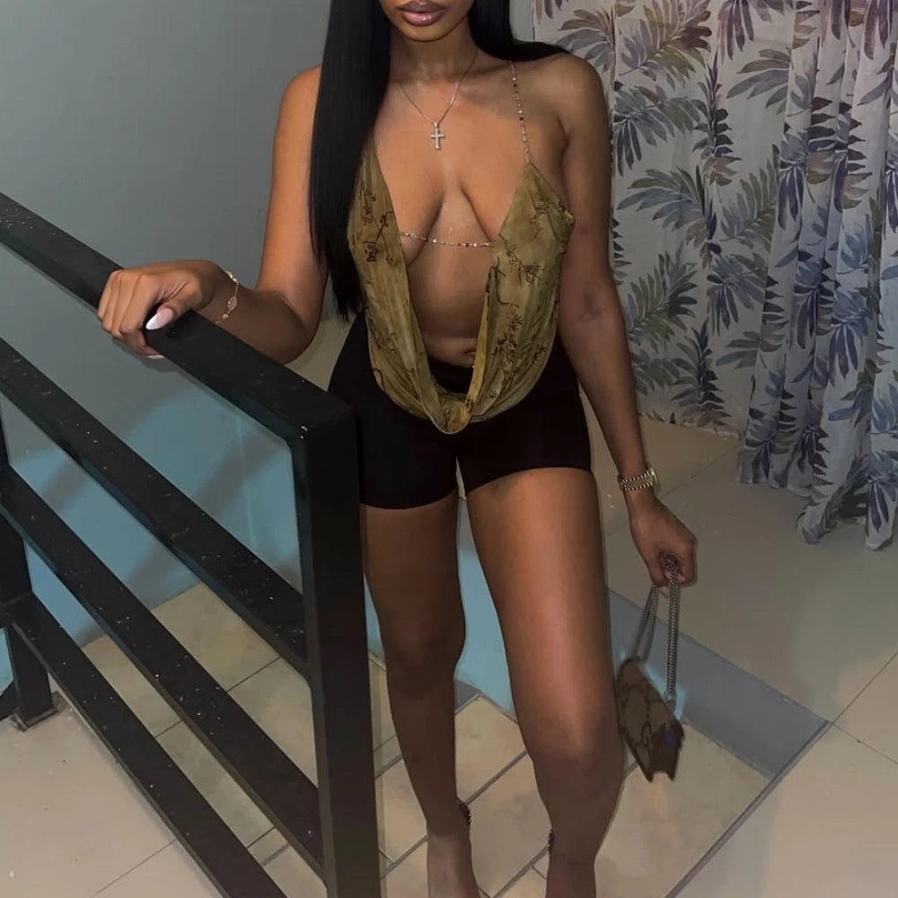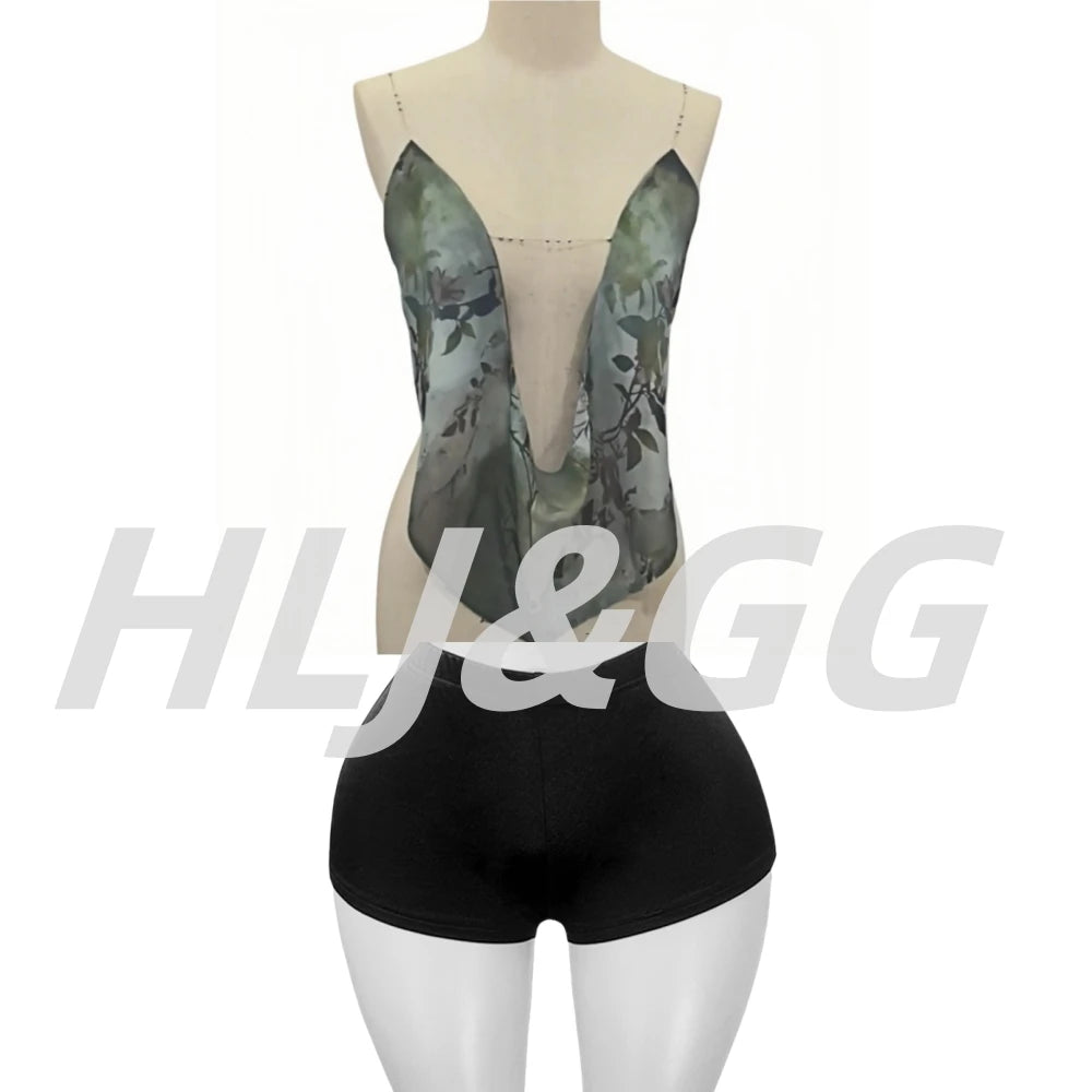 HLJ&GG Sexy Pattern Print Hollow Halter Two Piece Sets Women Deep V Backless Top And Shorts Outfits Fashion Y2K Streetwear Trend