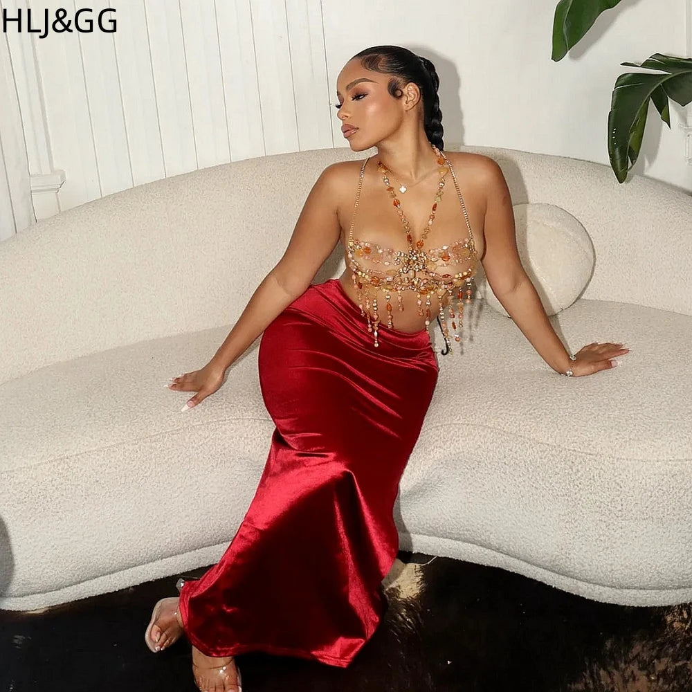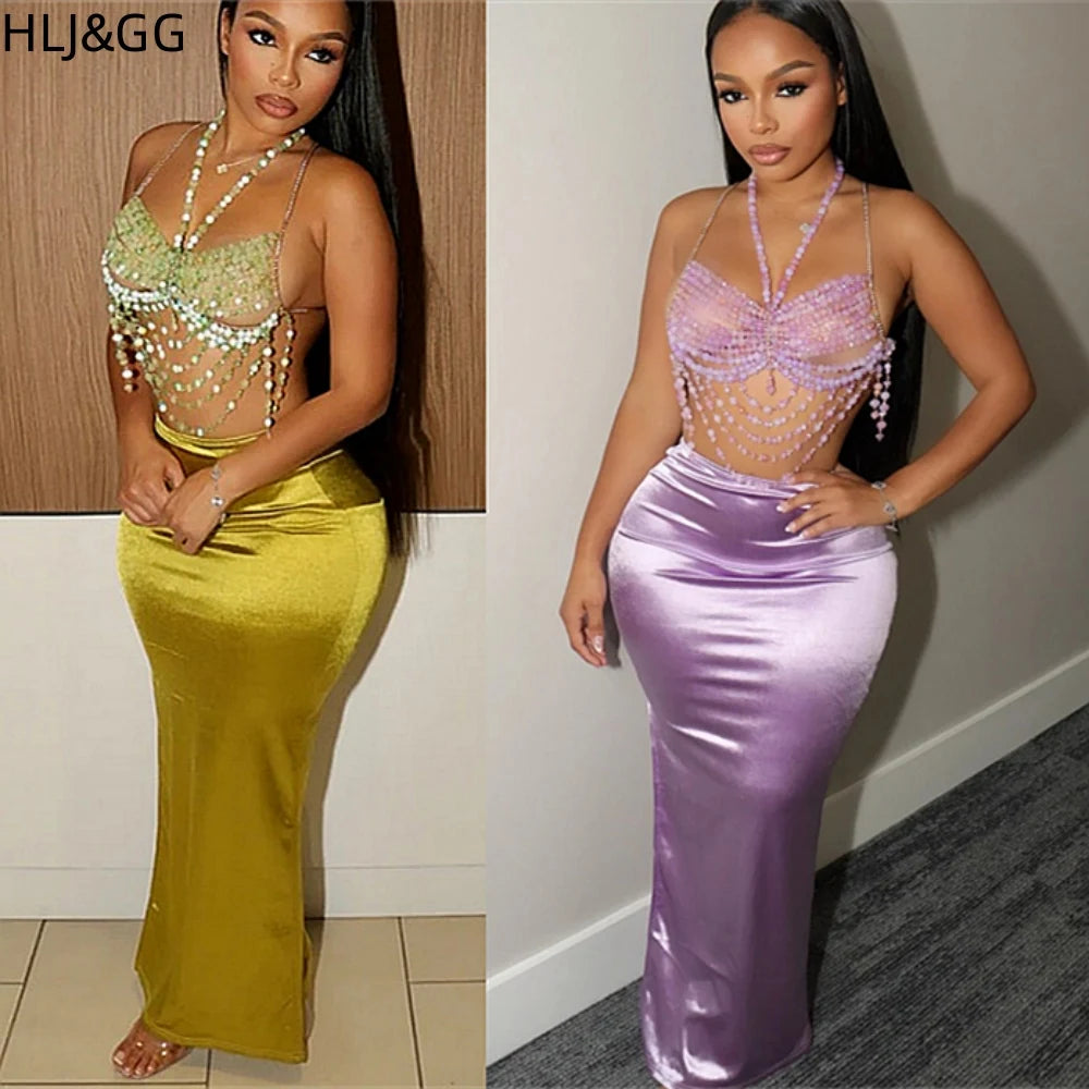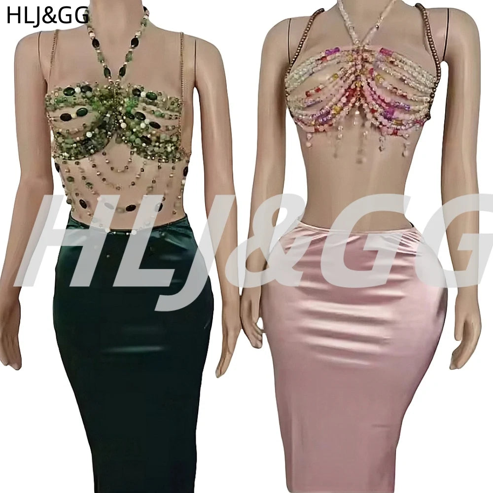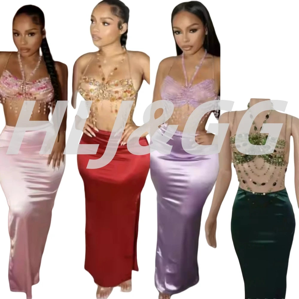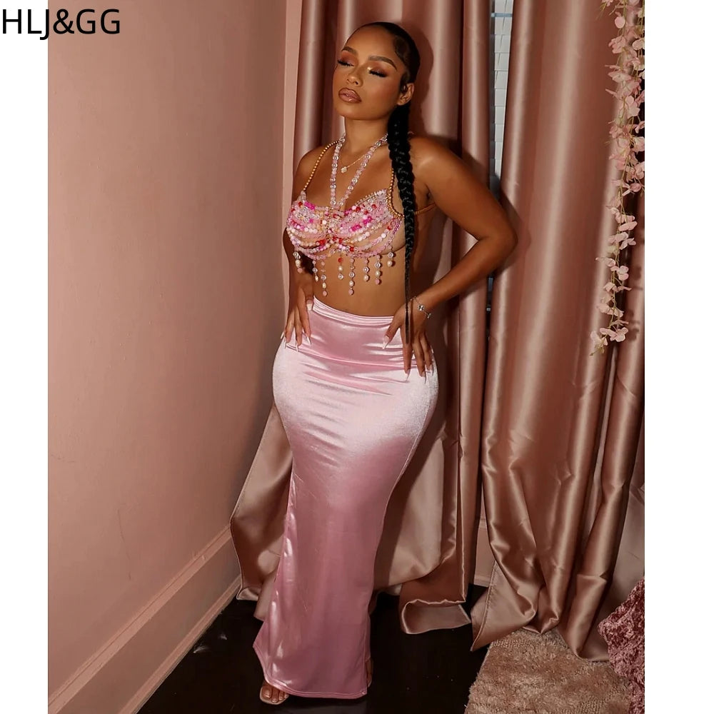 HLJ&GG Sexy Rhinestone Beads Halter Hollow Two Piece Sets Women Sleeveless Backless Top + Satin Skinny Skirts Outfits Streetwear