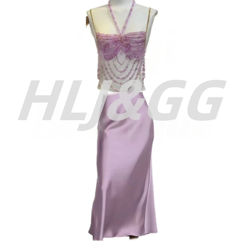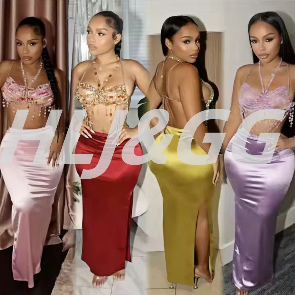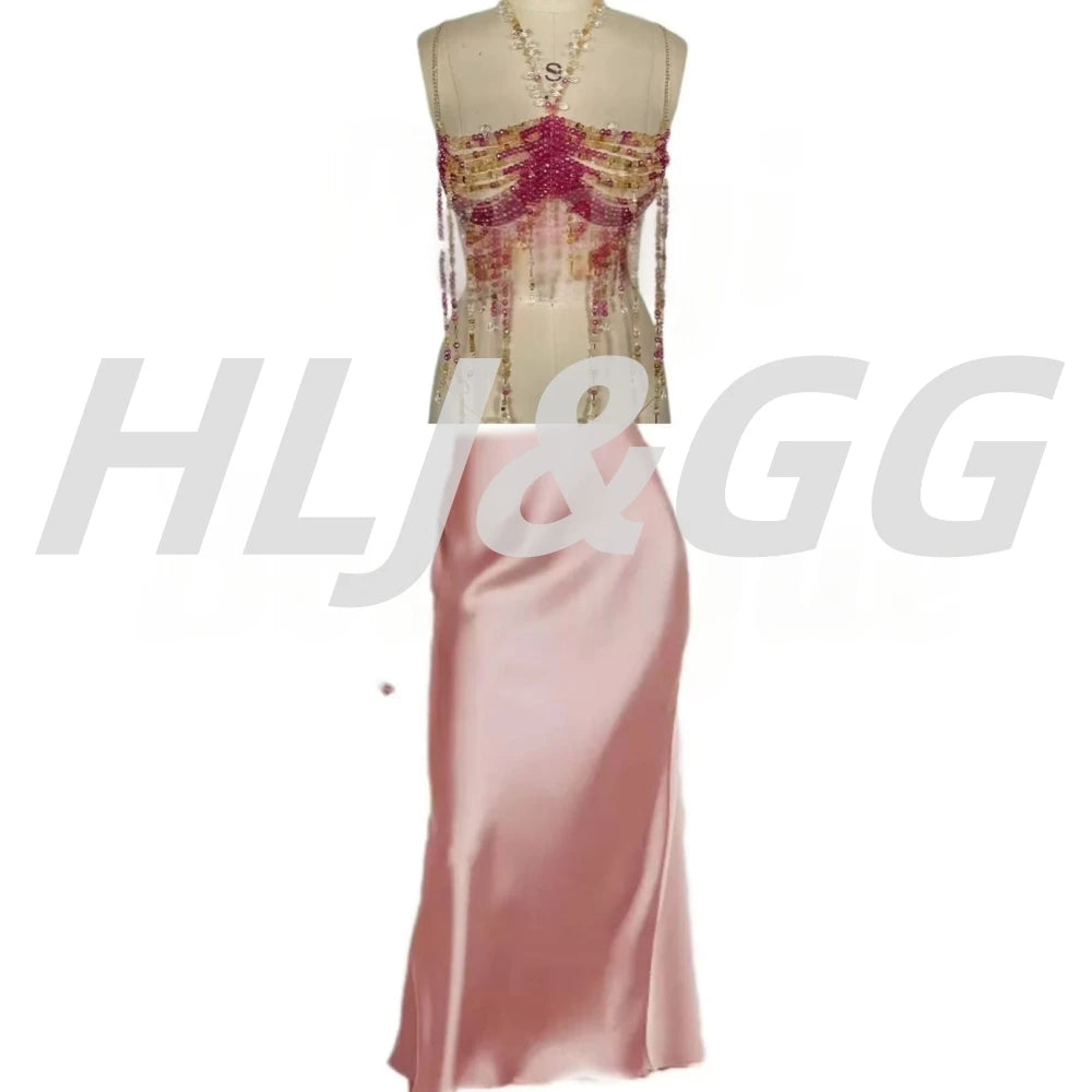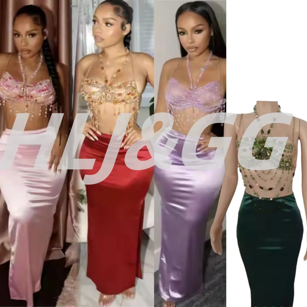 HLJ&GG Sexy Rhinestone Beads Halter Hollow Two Piece Sets Women Sleeveless Backless Top + Satin Skinny Skirts Outfits Streetwear