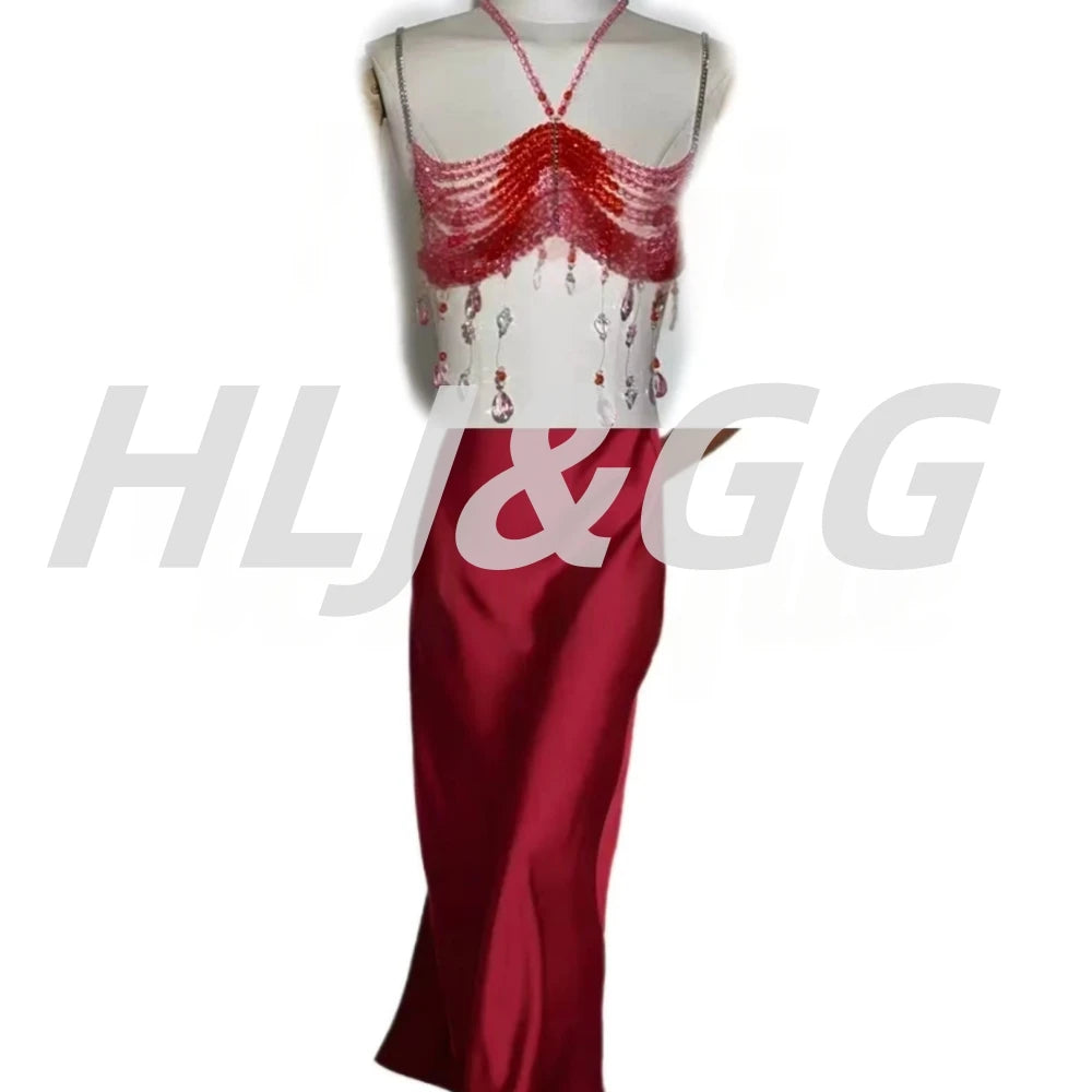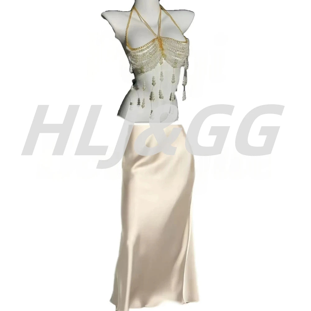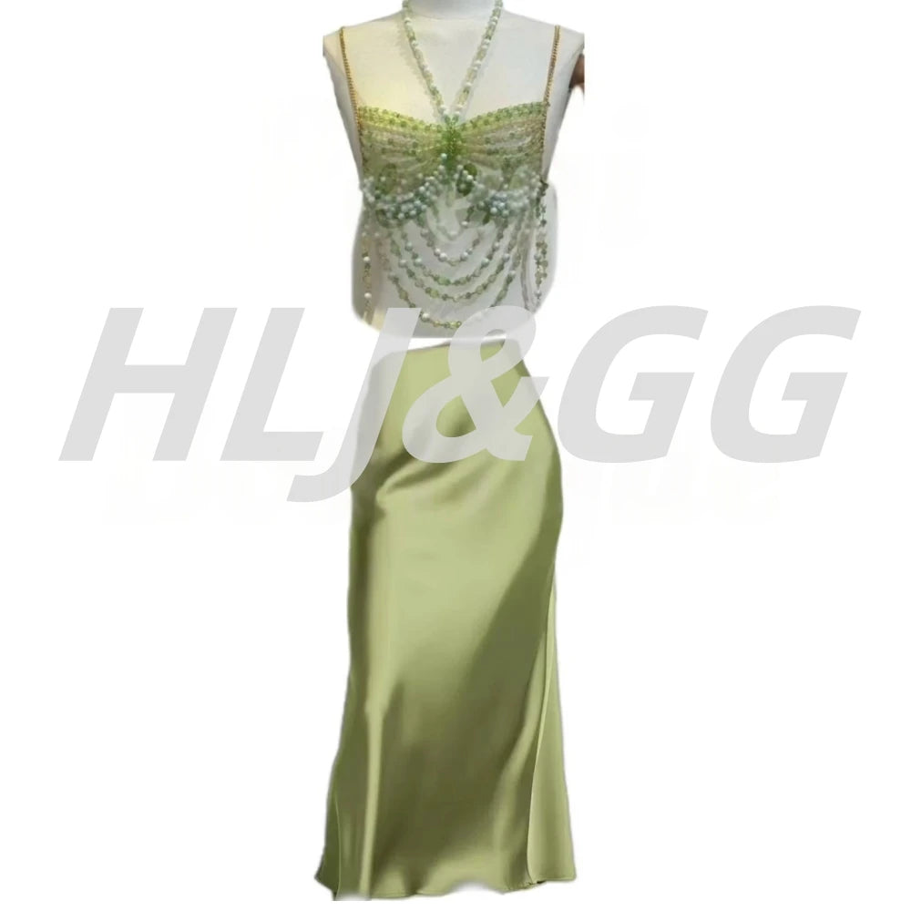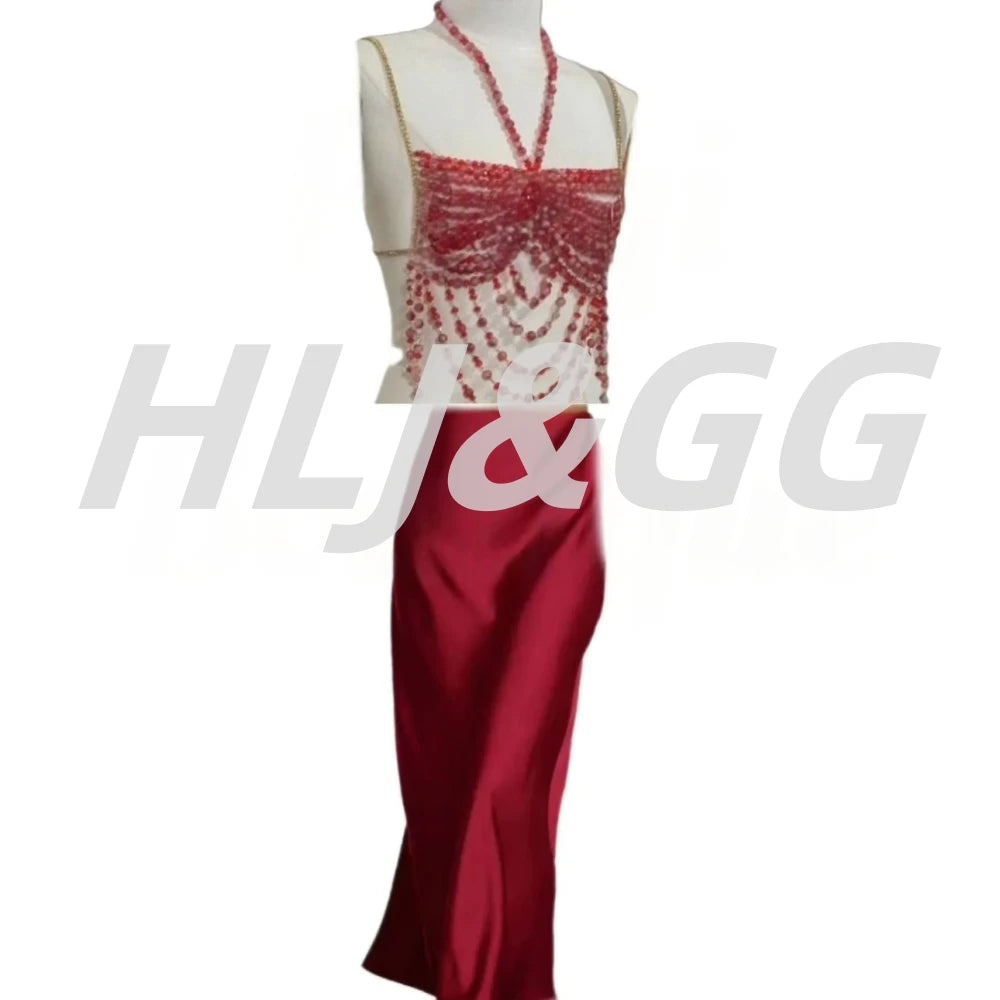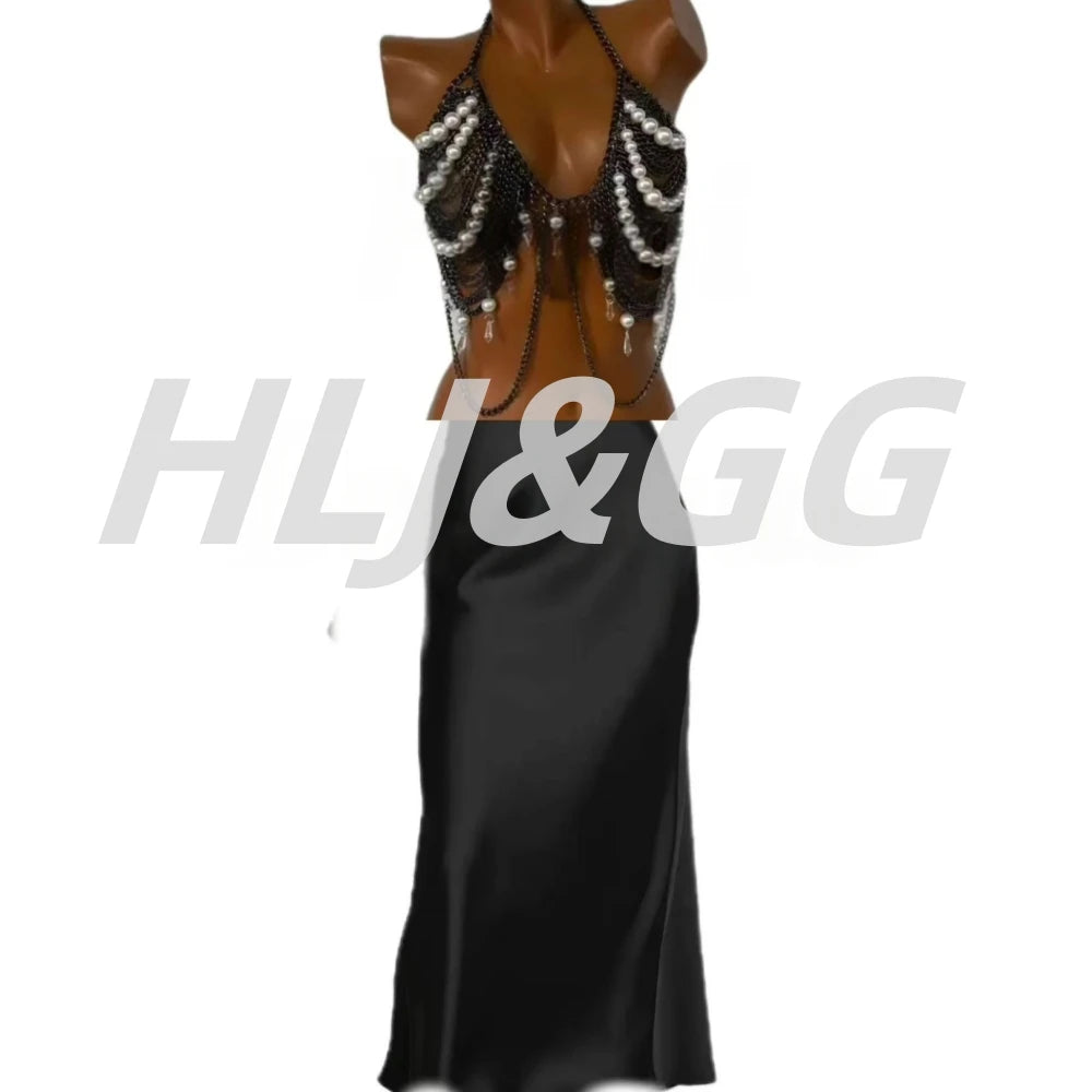 HLJ&GG Sexy Rhinestone Beads Halter Hollow Two Piece Sets Women Sleeveless Backless Top + Satin Skinny Skirts Outfits Streetwear