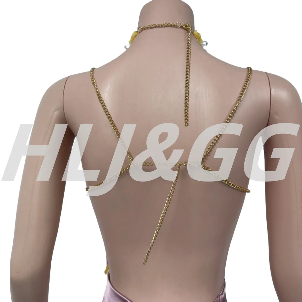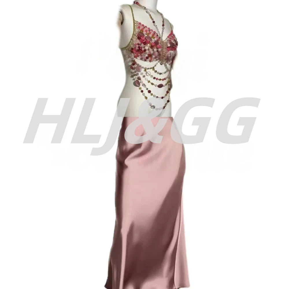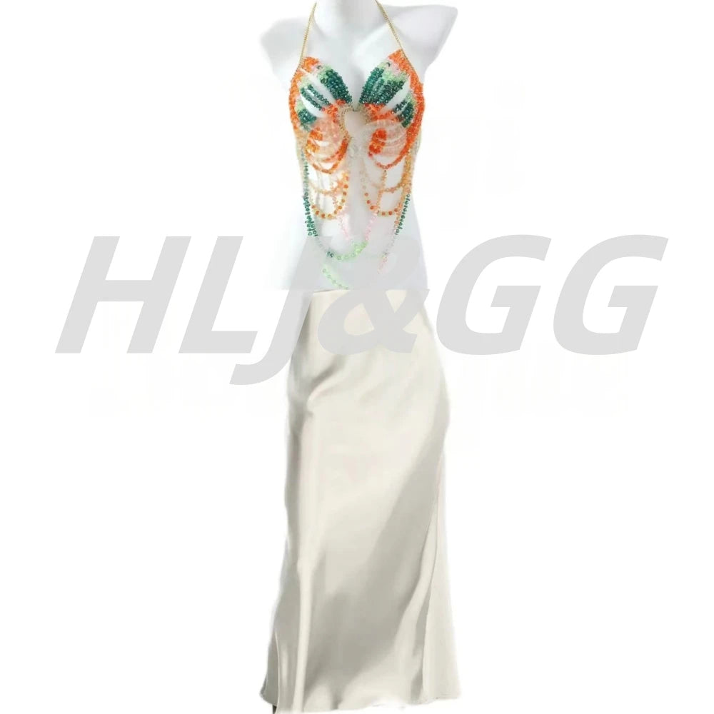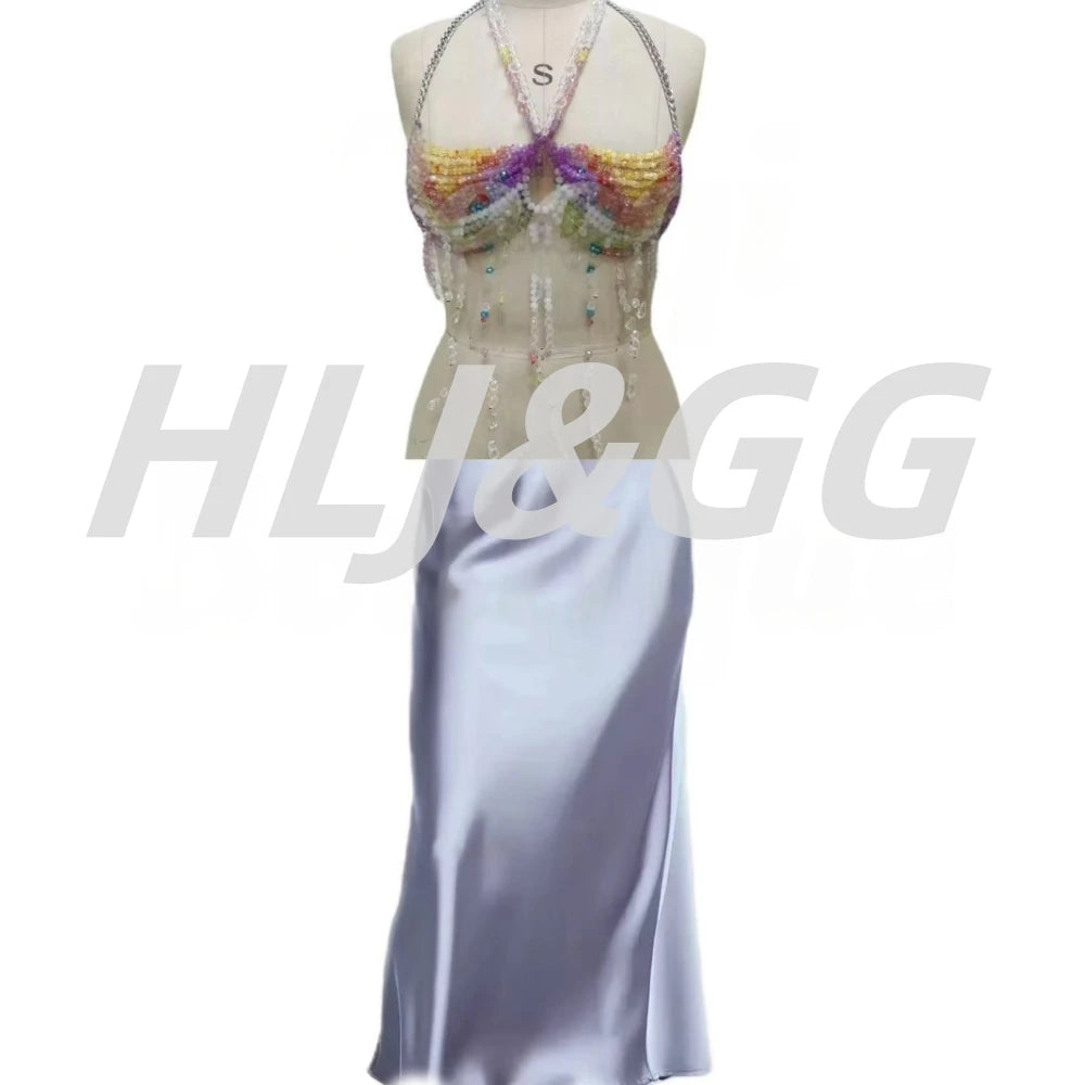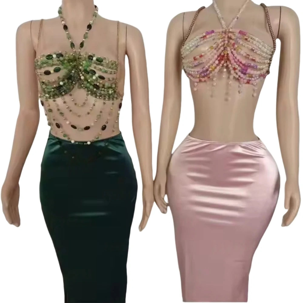 HLJ&GG Sexy Rhinestone Beads Halter Hollow Two Piece Sets Women Sleeveless Backless Top + Satin Skinny Skirts Outfits Streetwear