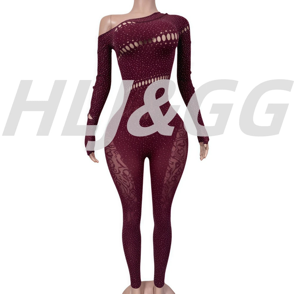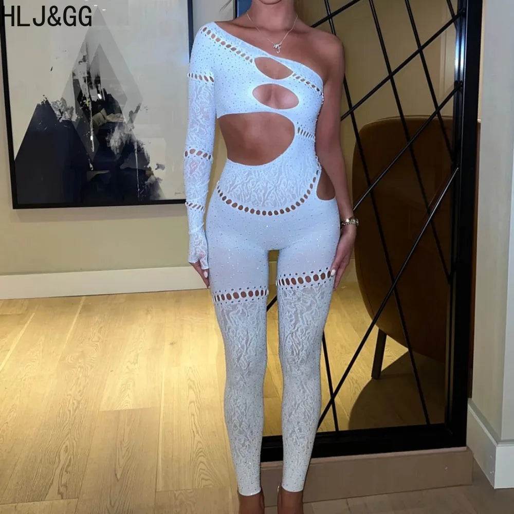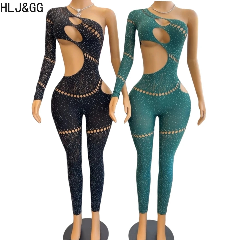 HLJ&GG Sexy Rhinestone Hollow Bodycon One Piece Jumpsuits Women One Shoulder Long Sleeve Slim Playsuit Fashion Clubwear Overalls