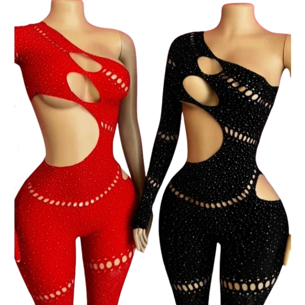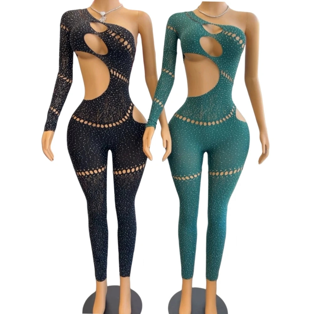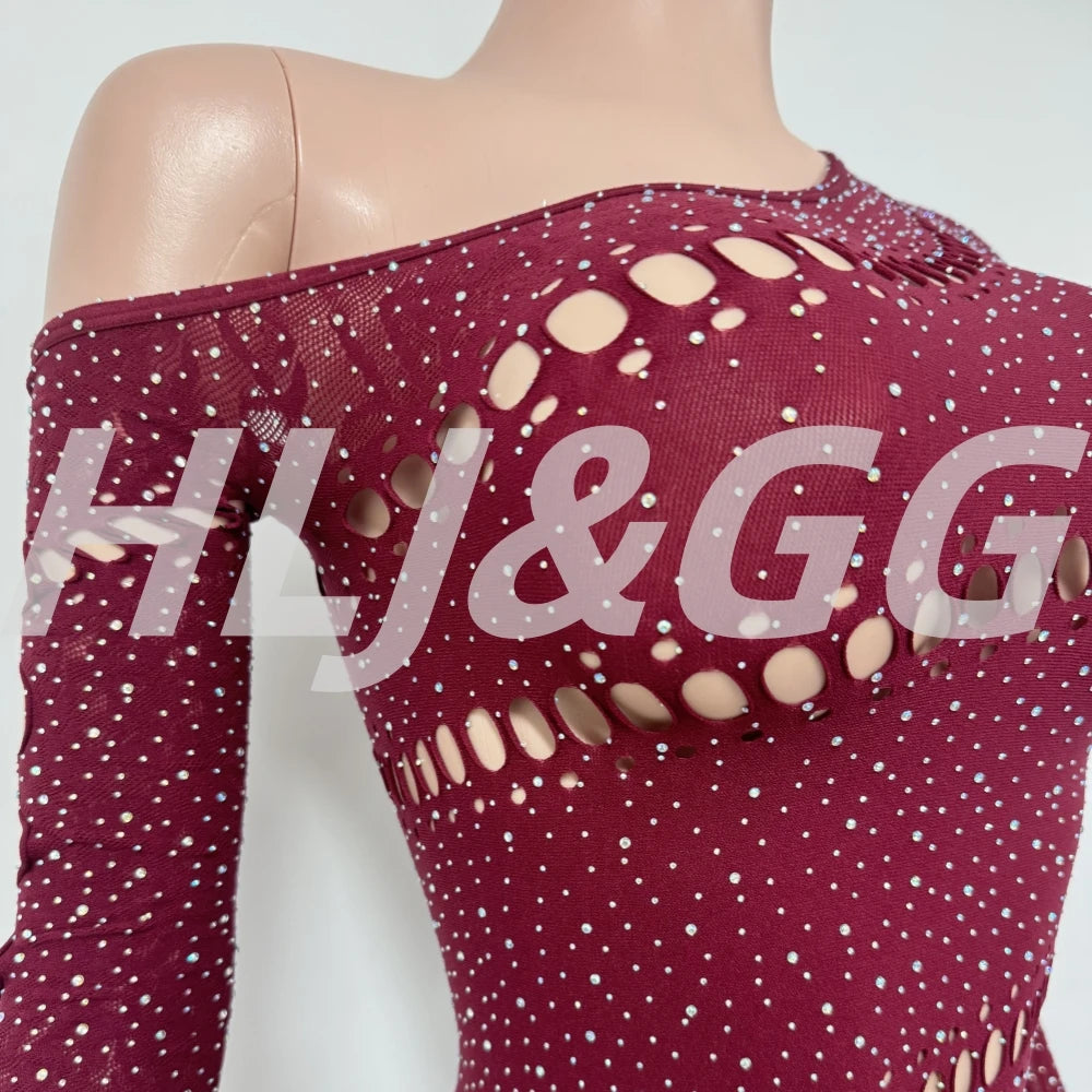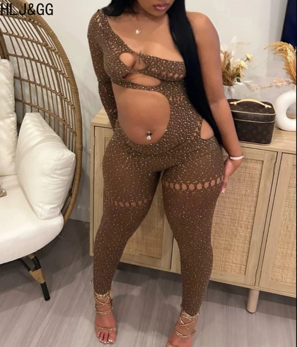 HLJ&GG Sexy Rhinestone Hollow Bodycon One Piece Jumpsuits Women One Shoulder Long Sleeve Slim Playsuit Fashion Clubwear Overalls