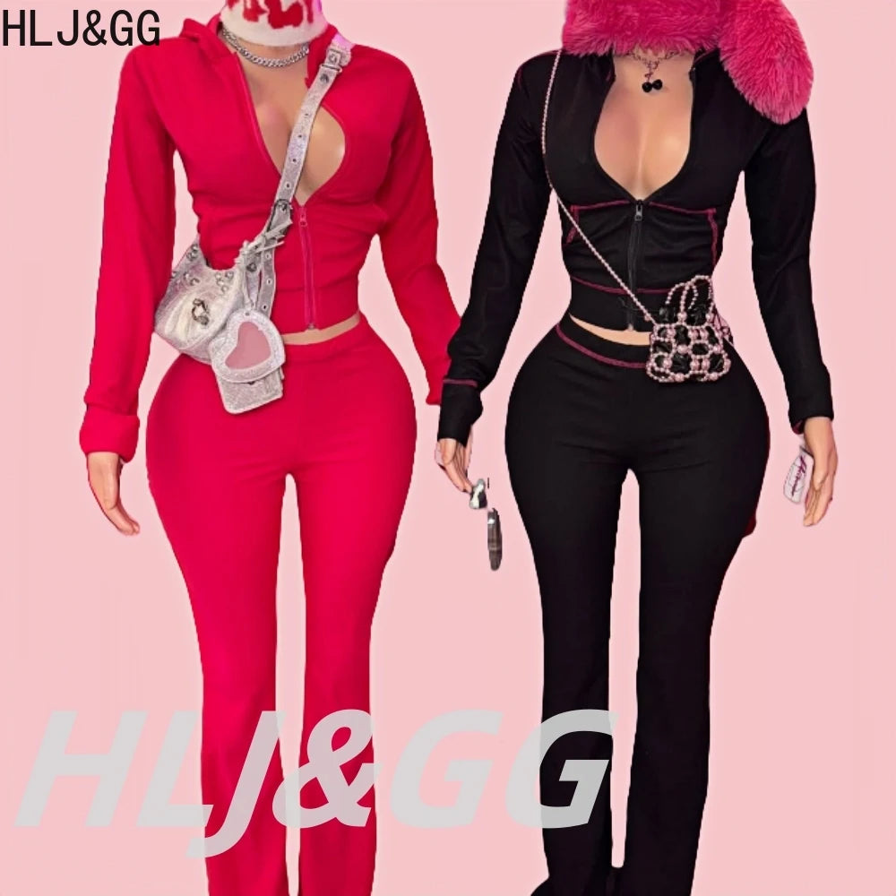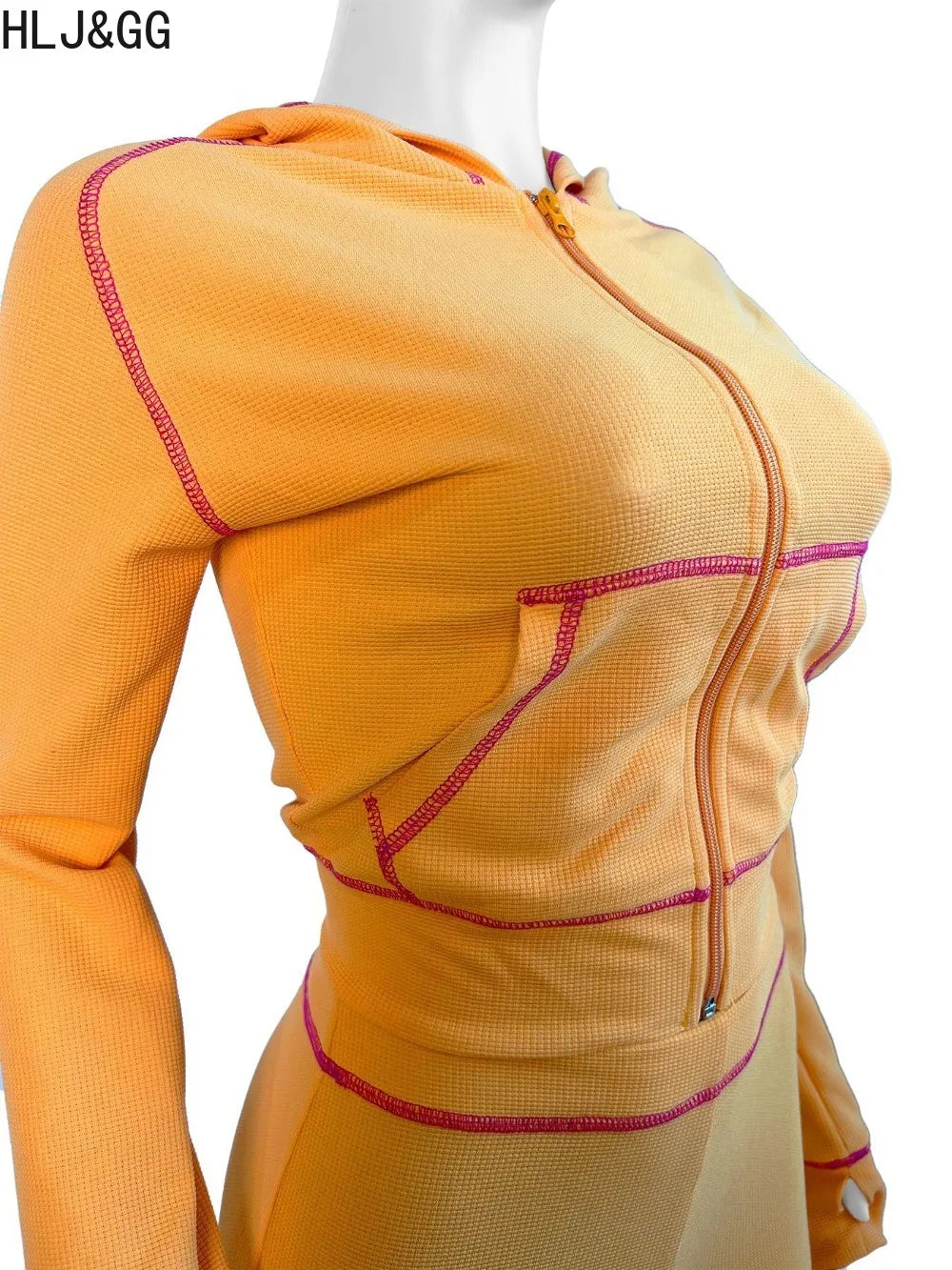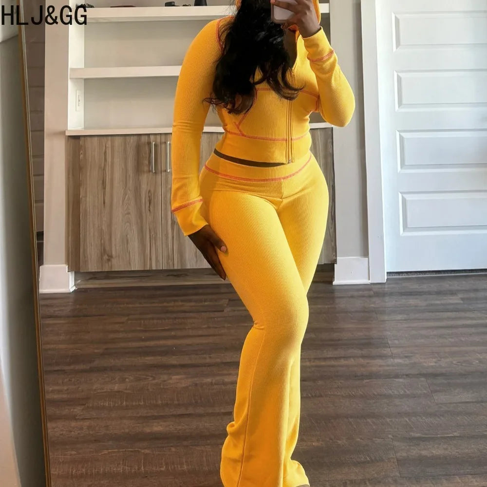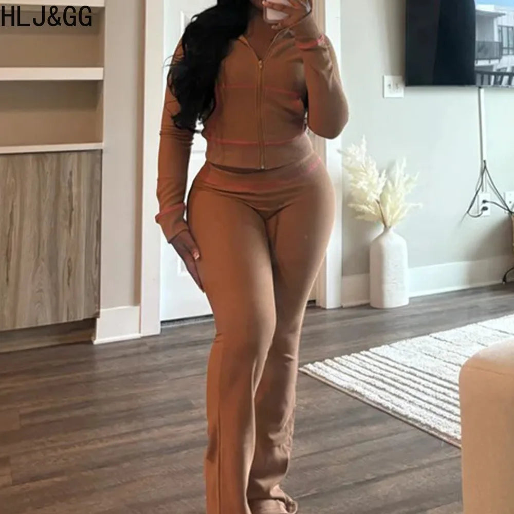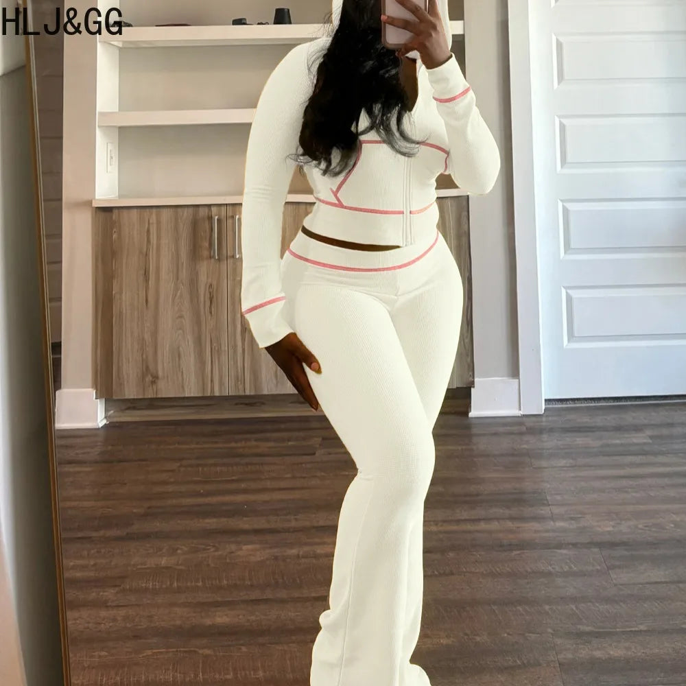 HLJ&GG Spring New Waffle Flare Pants Two Piece Sets Women Zip Hooded Long Sleeve Top + Pants Outfits Casual Sporty 2pcs Clothing