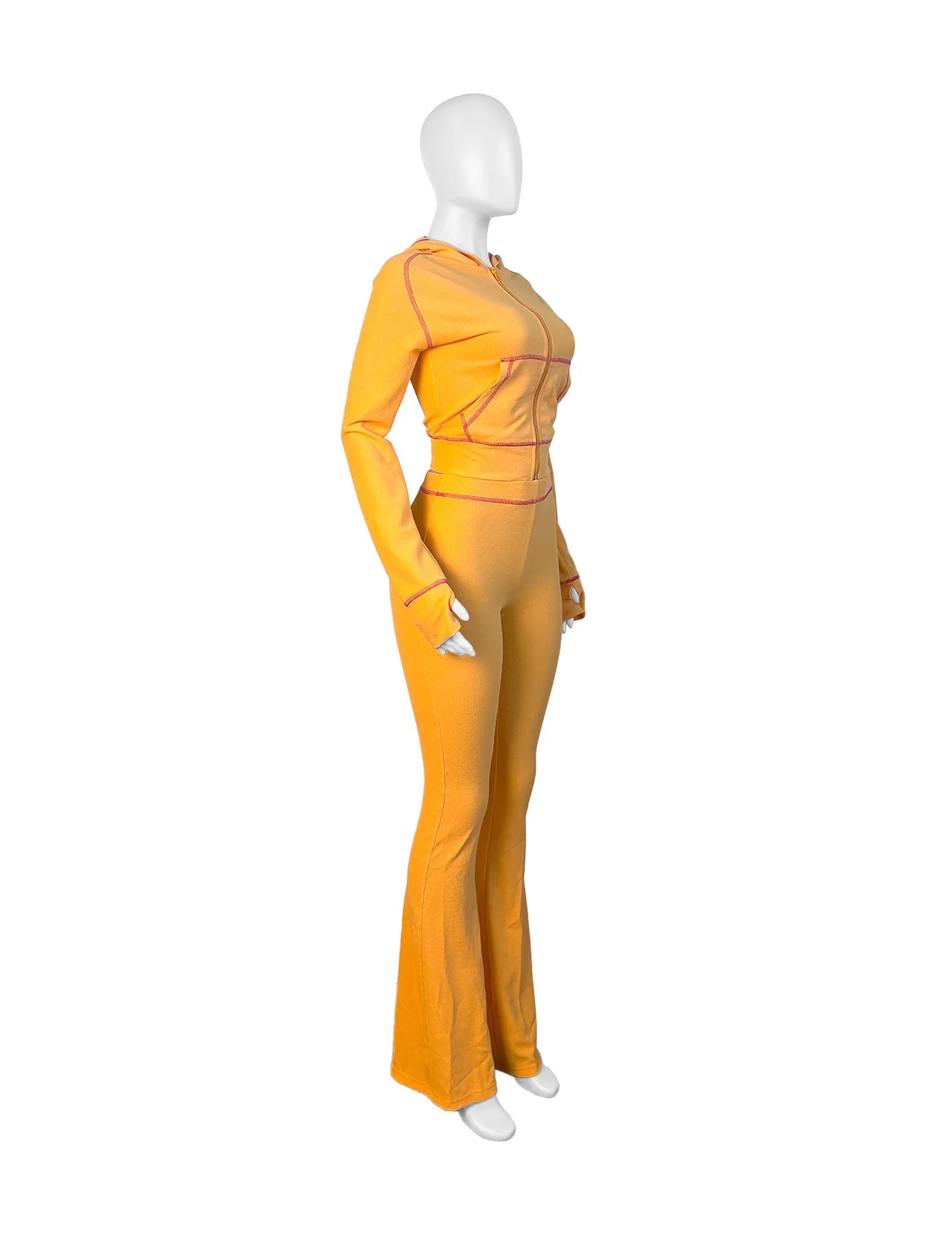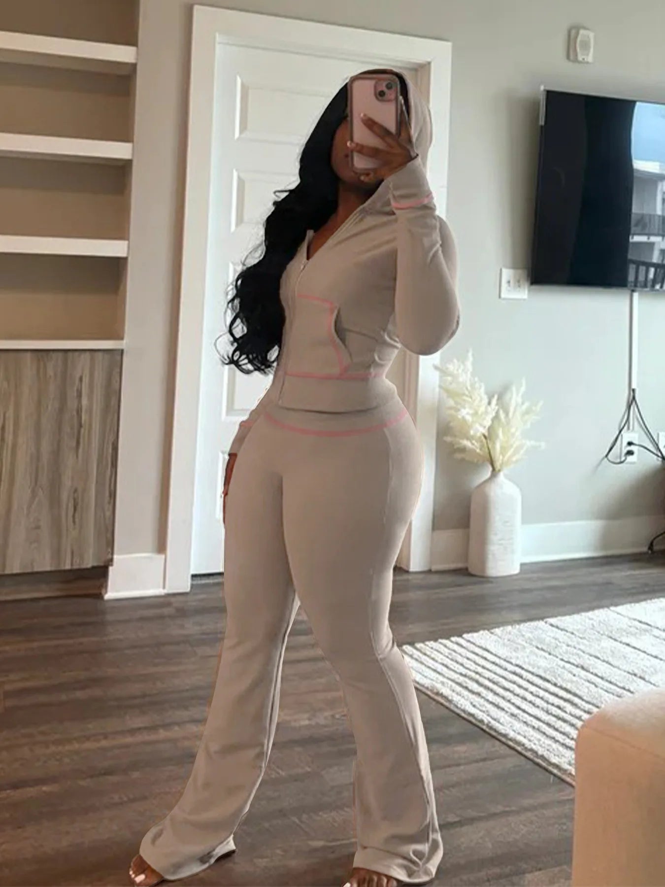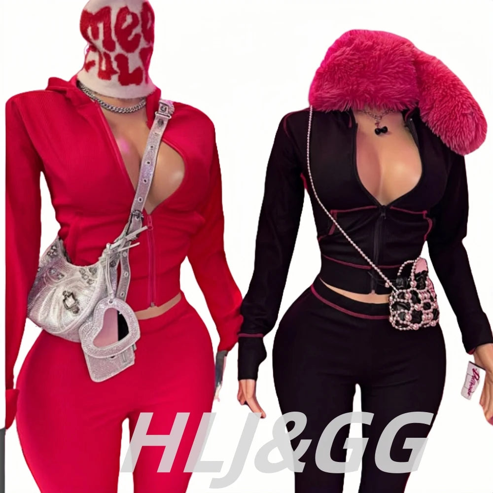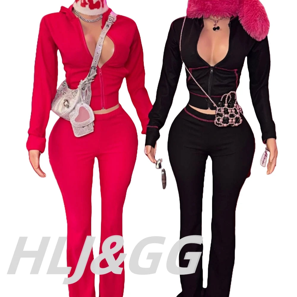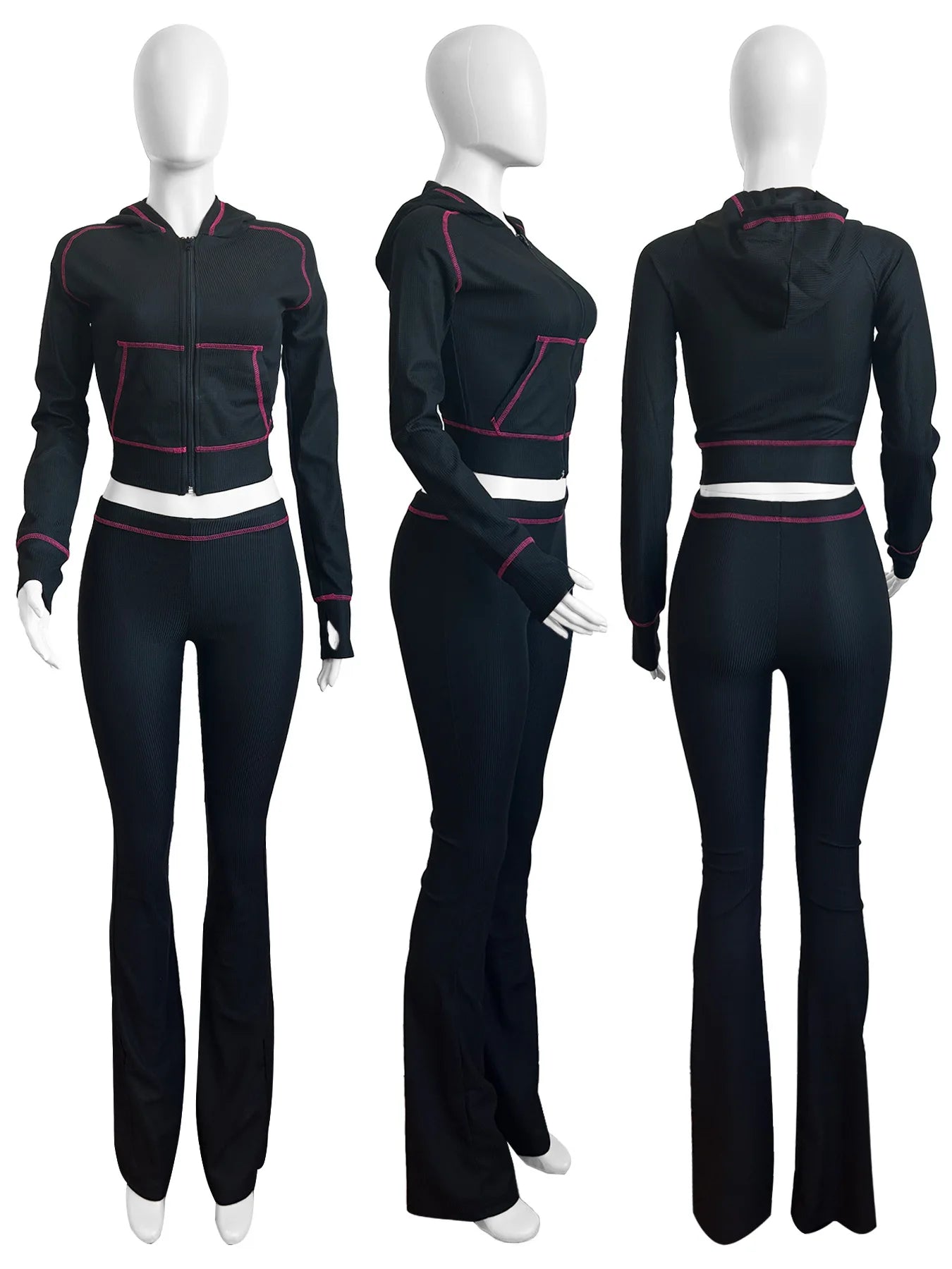 HLJ&GG Spring New Waffle Flare Pants Two Piece Sets Women Zip Hooded Long Sleeve Top + Pants Outfits Casual Sporty 2pcs Clothing
