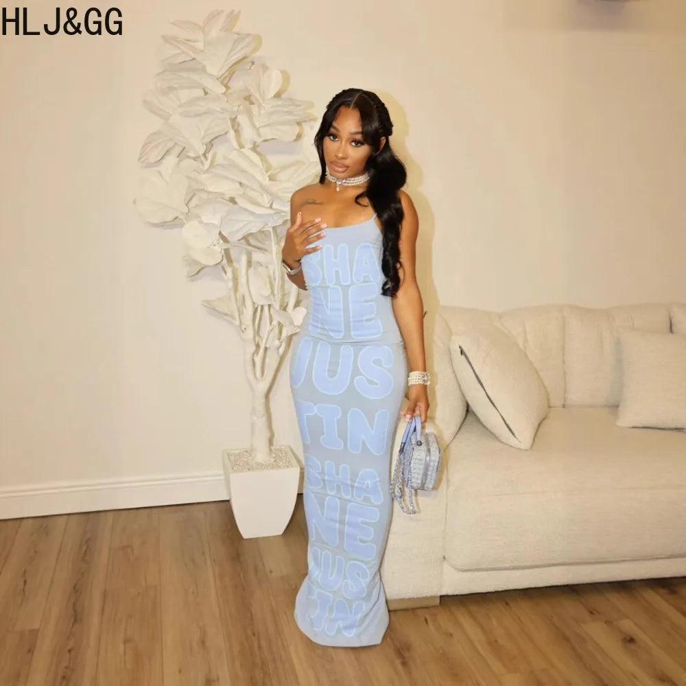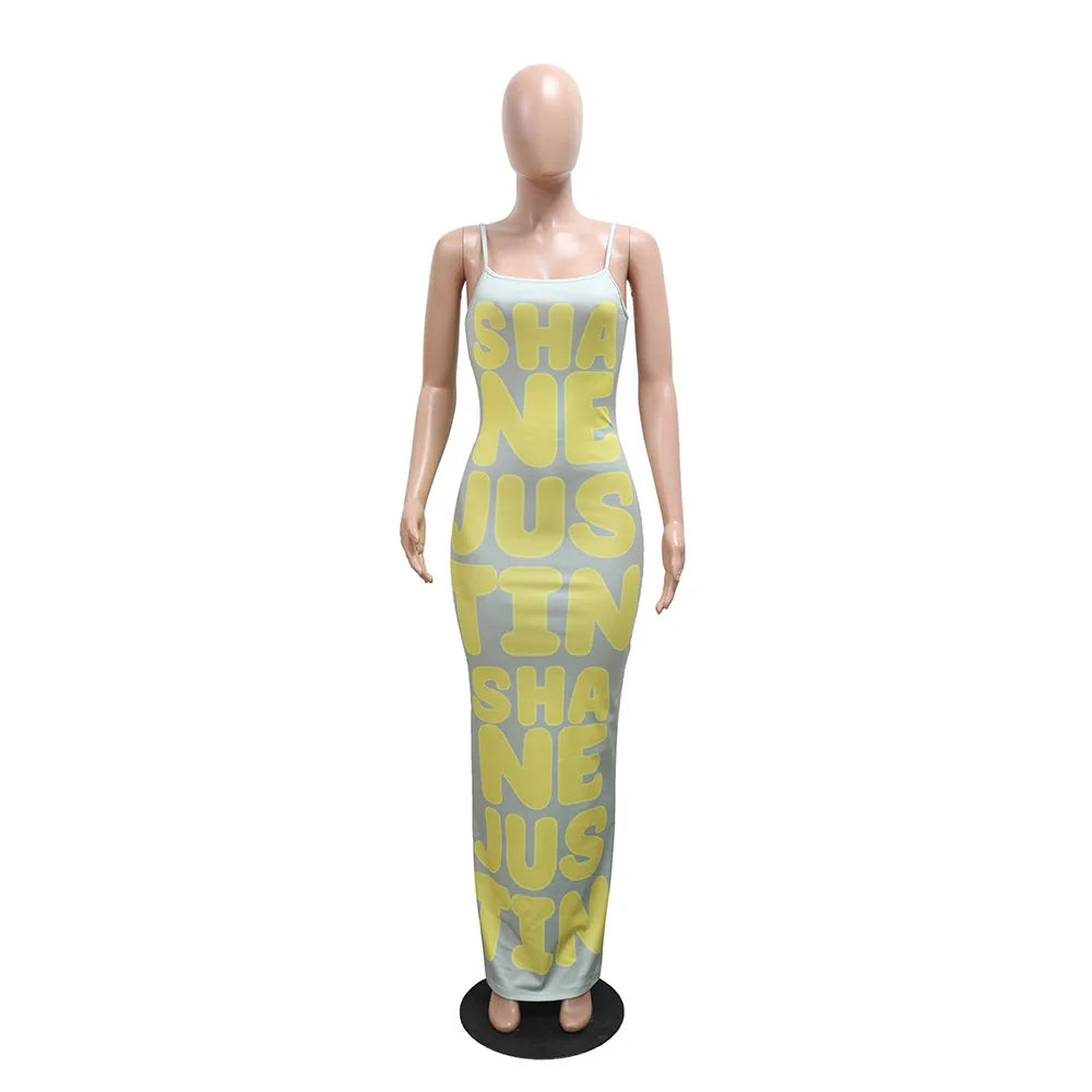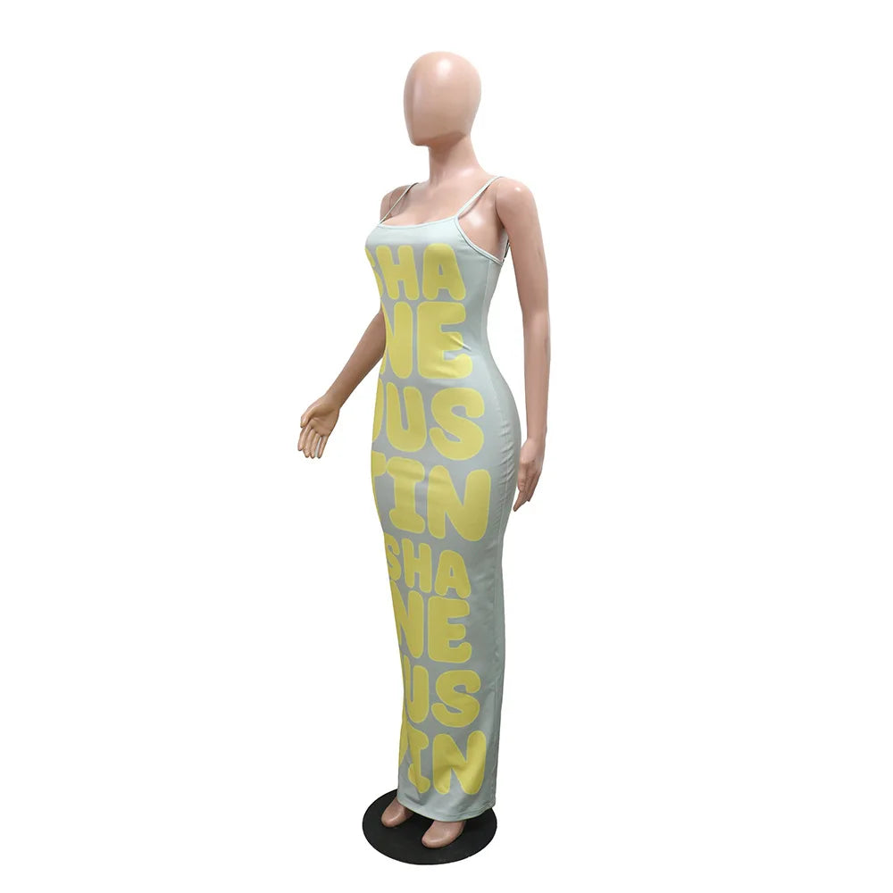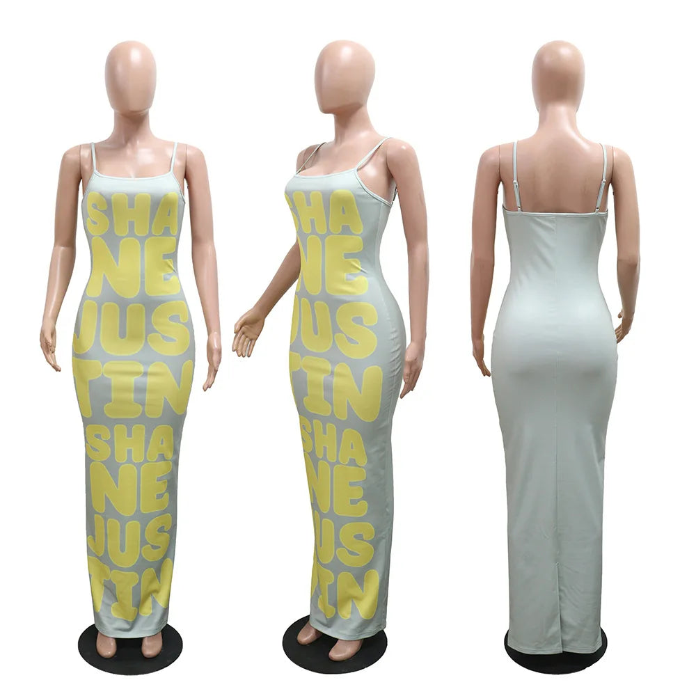 HLJ&GG Summer New Letter Print Bodycon Spaghetti Strap Long Dresses Women Sleeveless Backless Slim Vestidos Fashion Streetwear