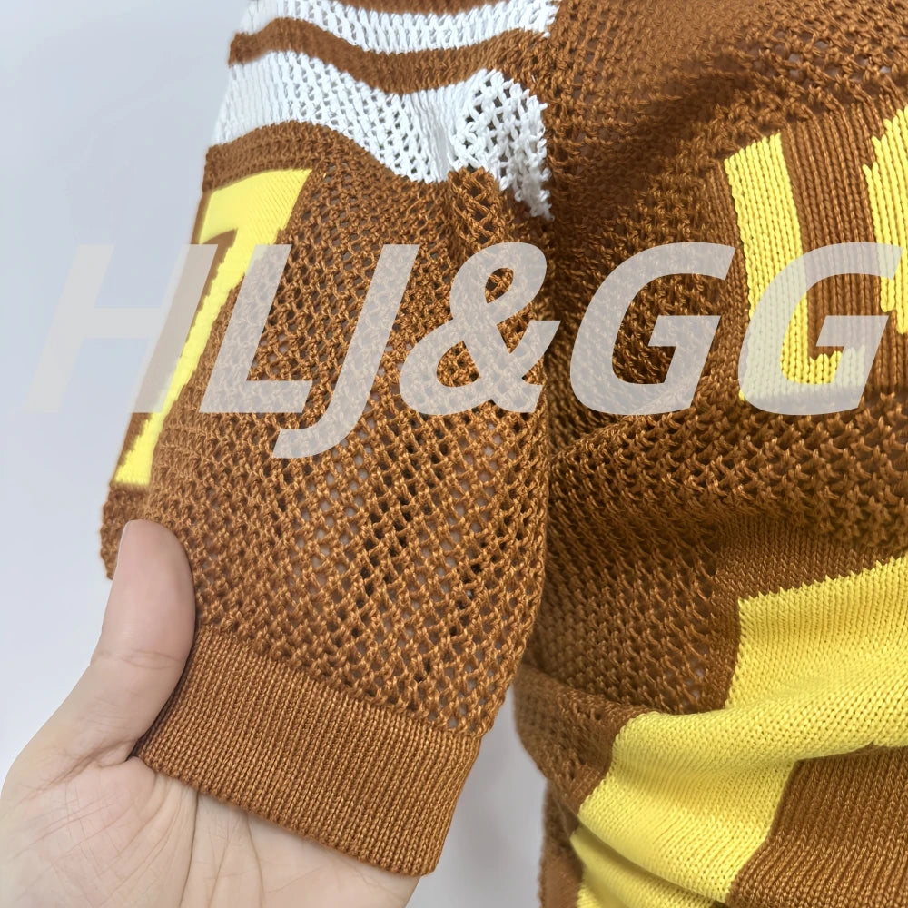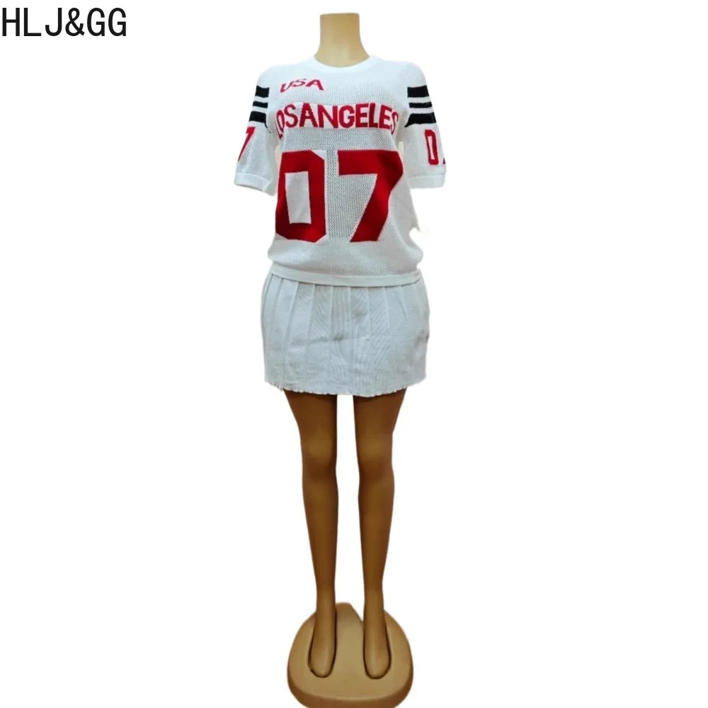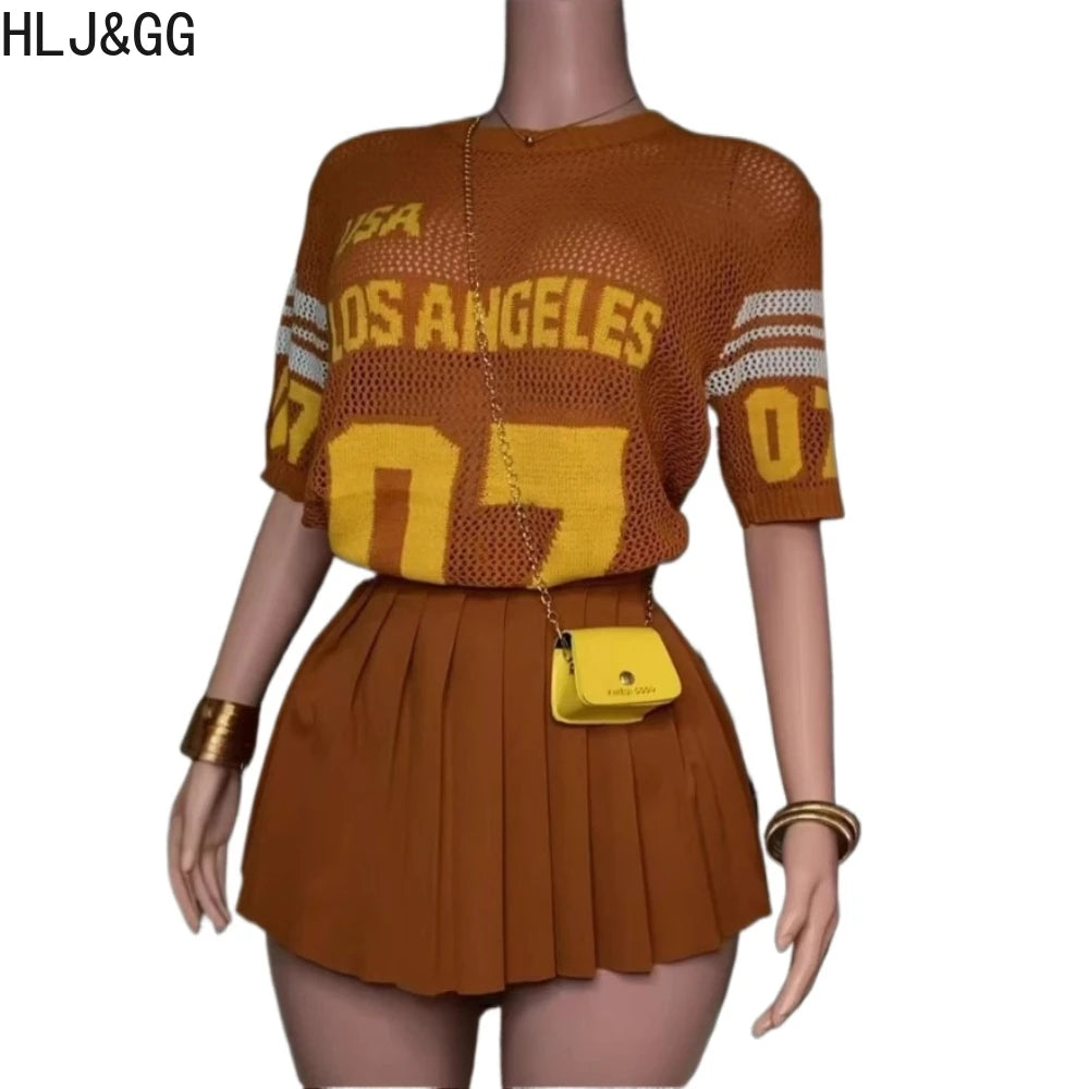 HLJ&GG Summer New Mesh Letter Print Mini Pleated Skirts Two Piece Sets Women Round Neck Short Sleeve Slim Top And Skirts Outfits