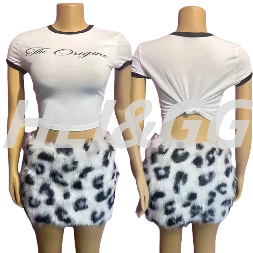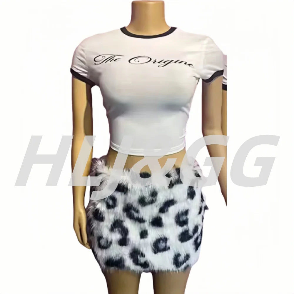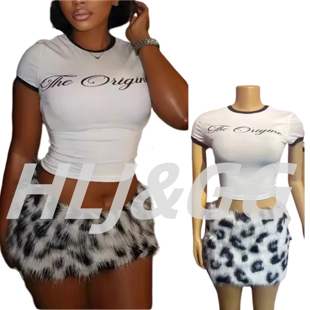 HLJ&GG Summer New Y2K Letter Print Two Piece Sets Women O Neck Short Sleeve Slim Crop Top And Fur Mini Skirts Outfits Streetwear