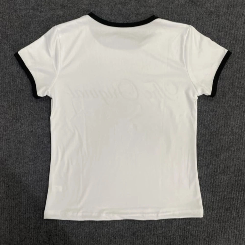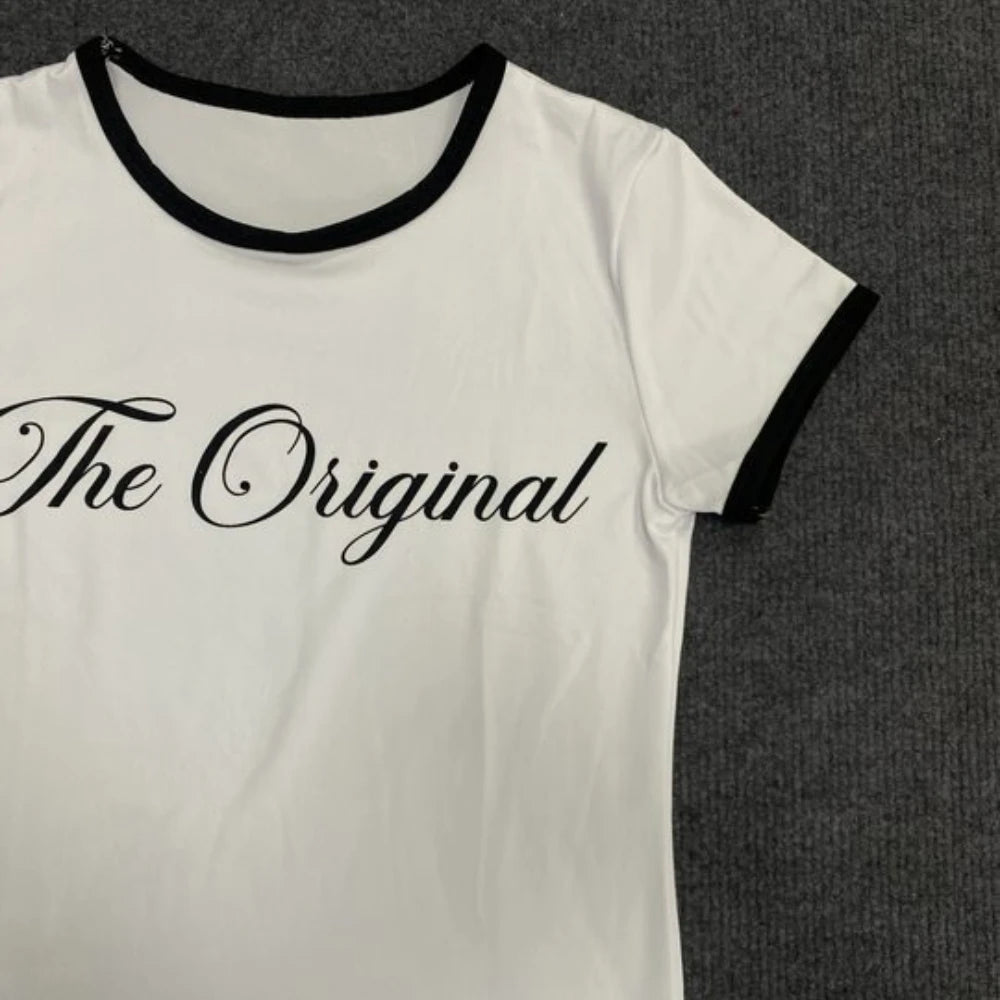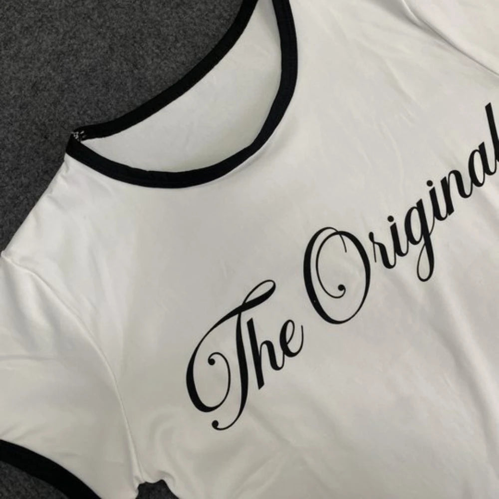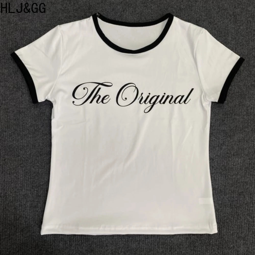 HLJ&GG Summer New Y2K Letter Print Two Piece Sets Women O Neck Short Sleeve Slim Crop Top And Fur Mini Skirts Outfits Streetwear