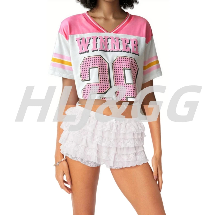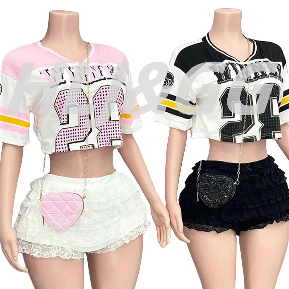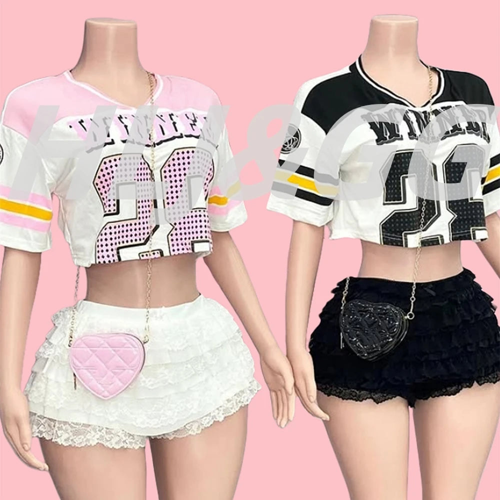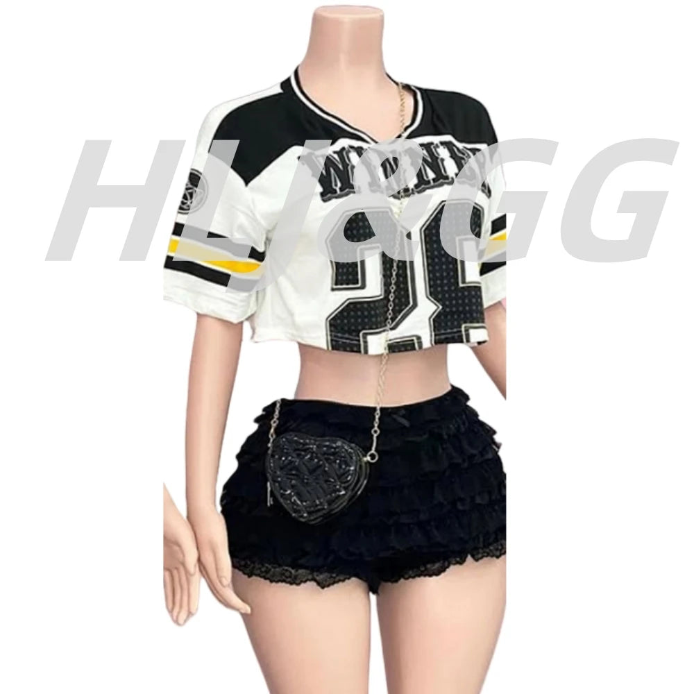 HLJ&GG Summer New Y2K Letter Print Two Piece Sets Women V Neck Short Sleeve Crop Top And Ruffle Skirts Shorts Outfits Streetwear