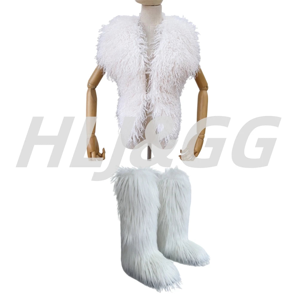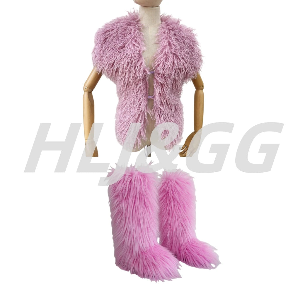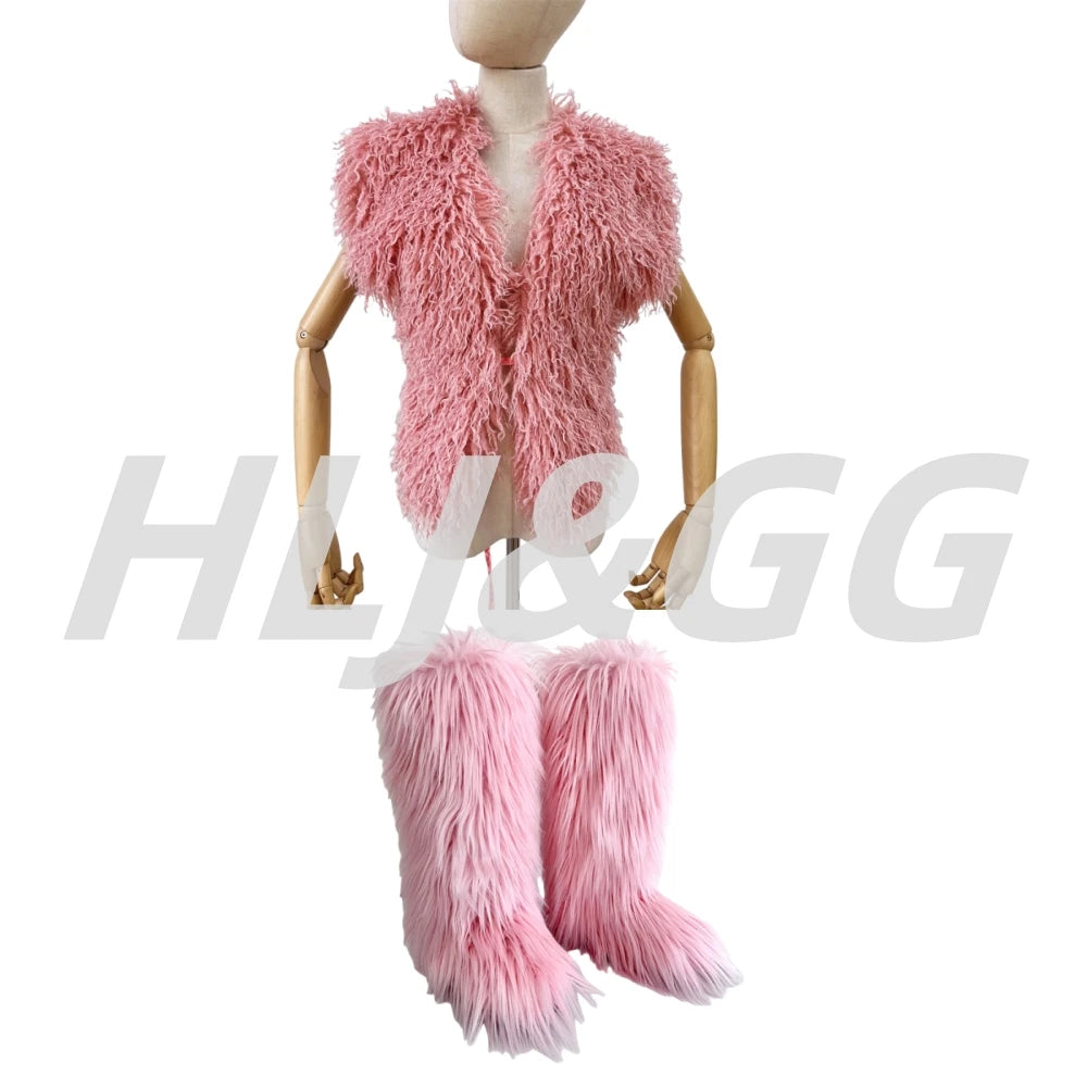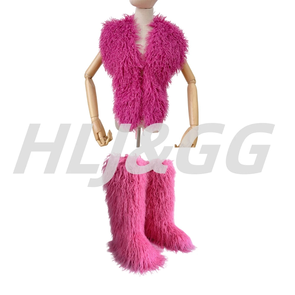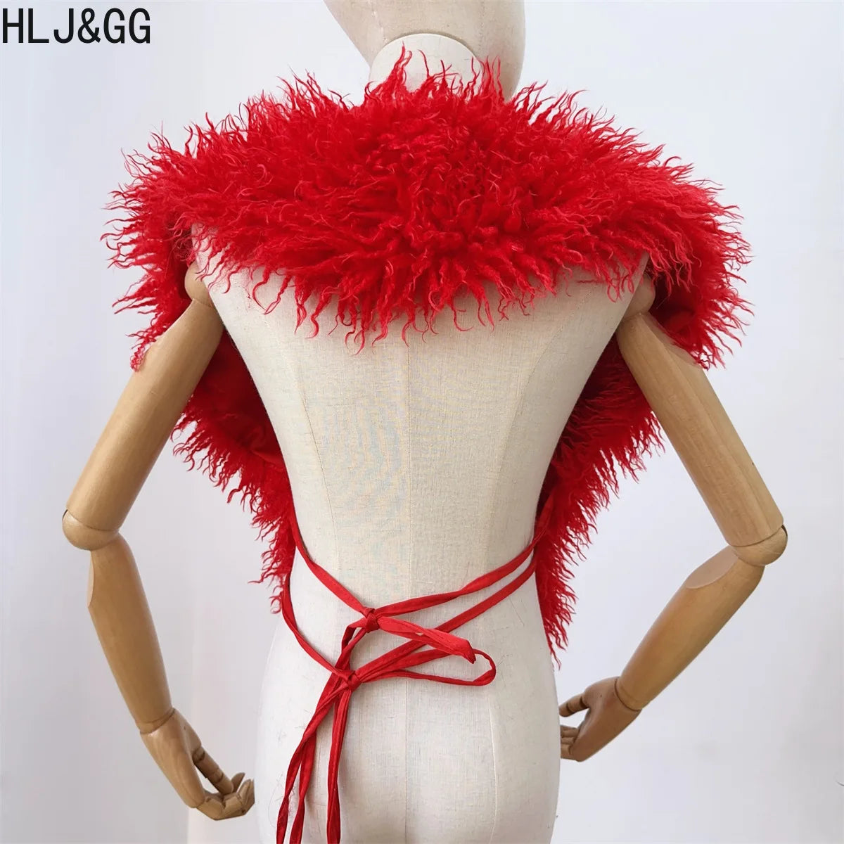 HLJ&GG Trend Y2K Two Piece Sets Women Fur Feather Halter Waistcoat Fashion Backless Lace Up Legs Cover Streetwear Clothing 2025