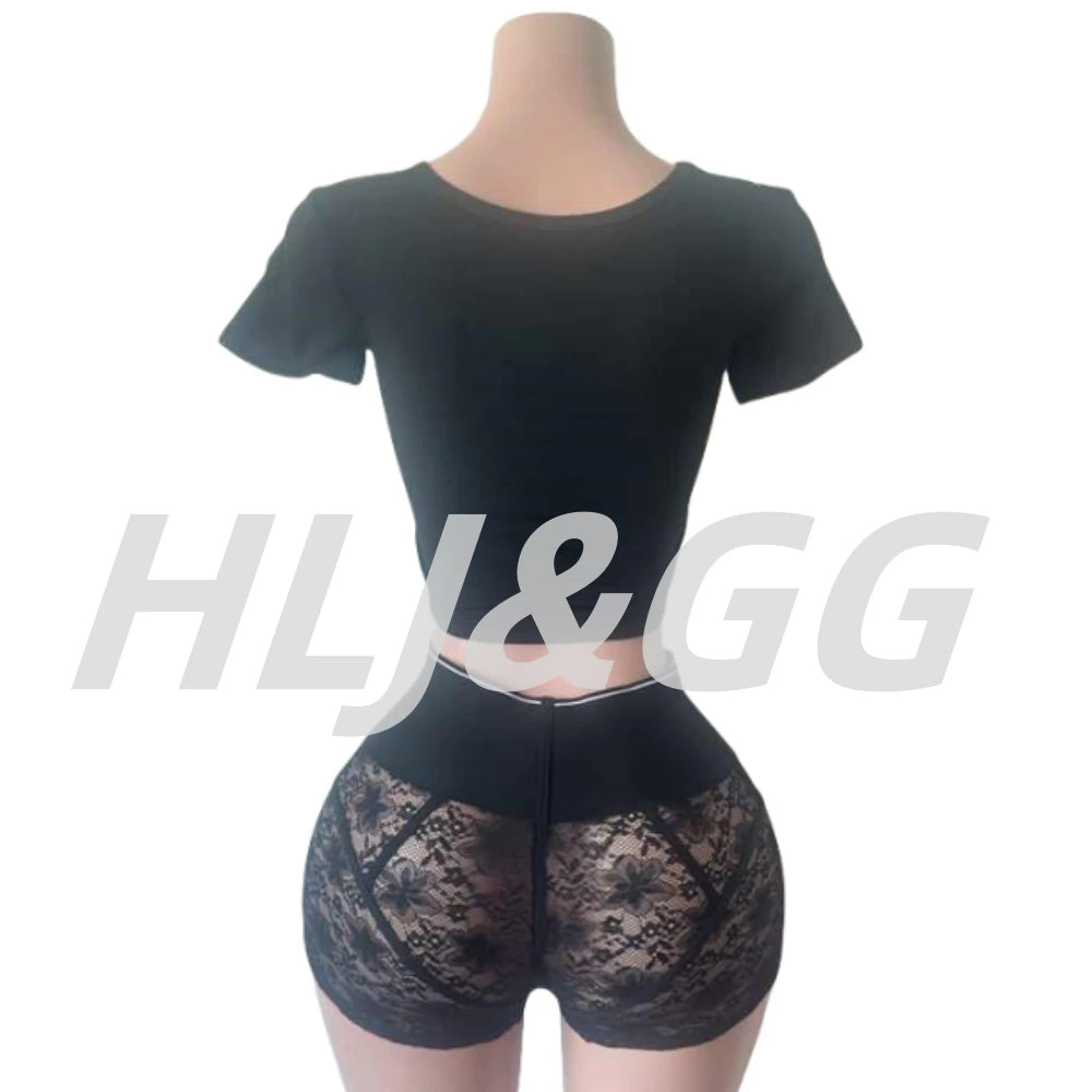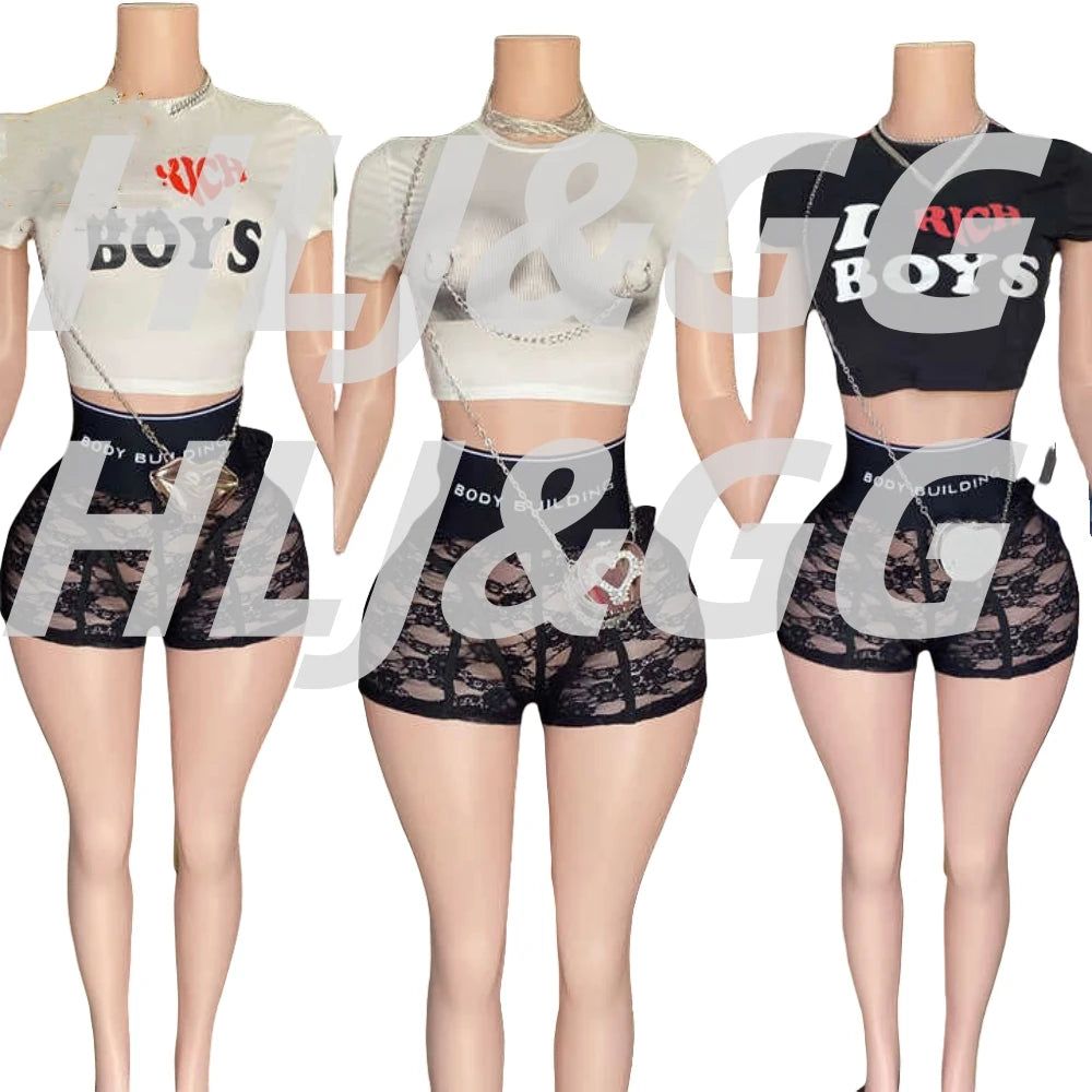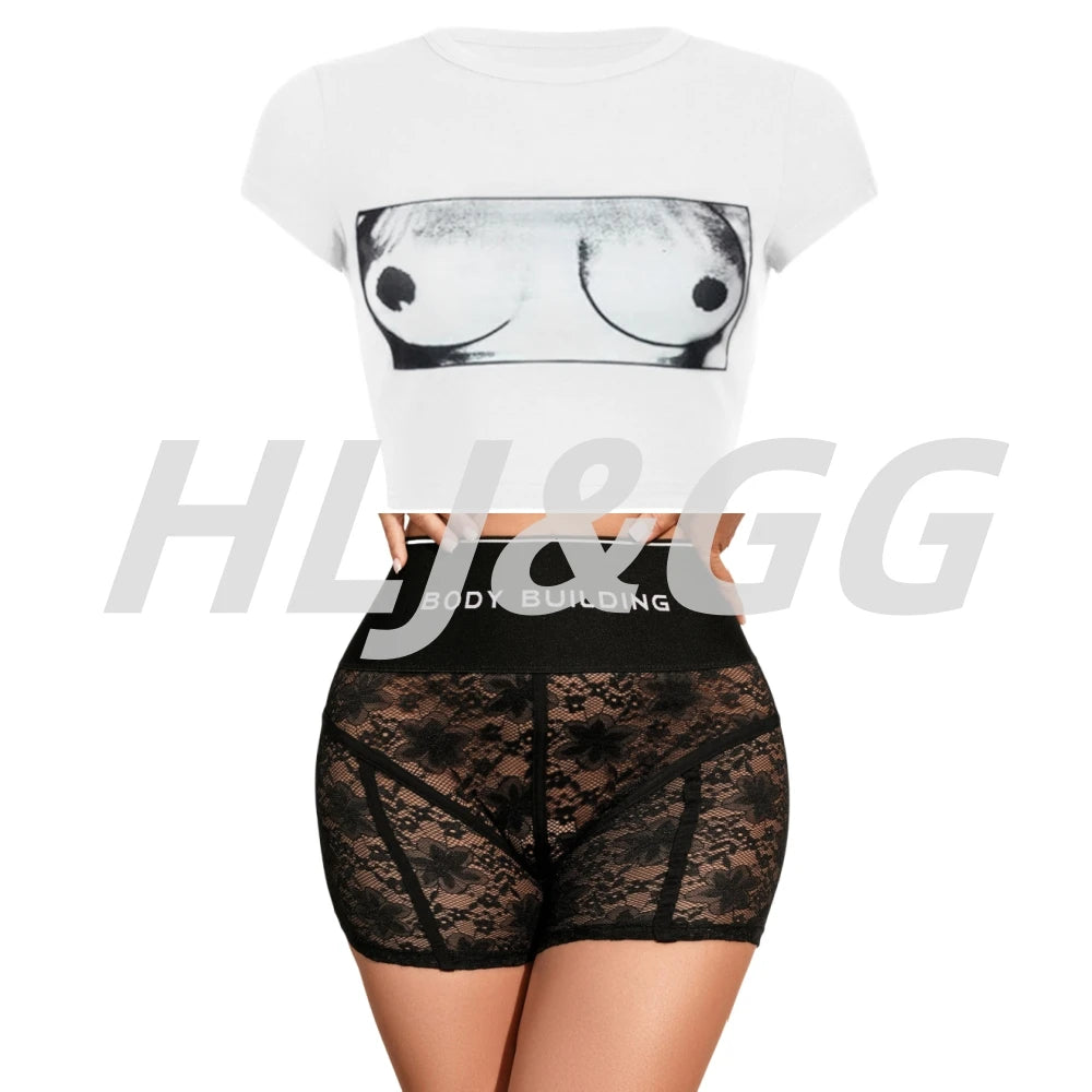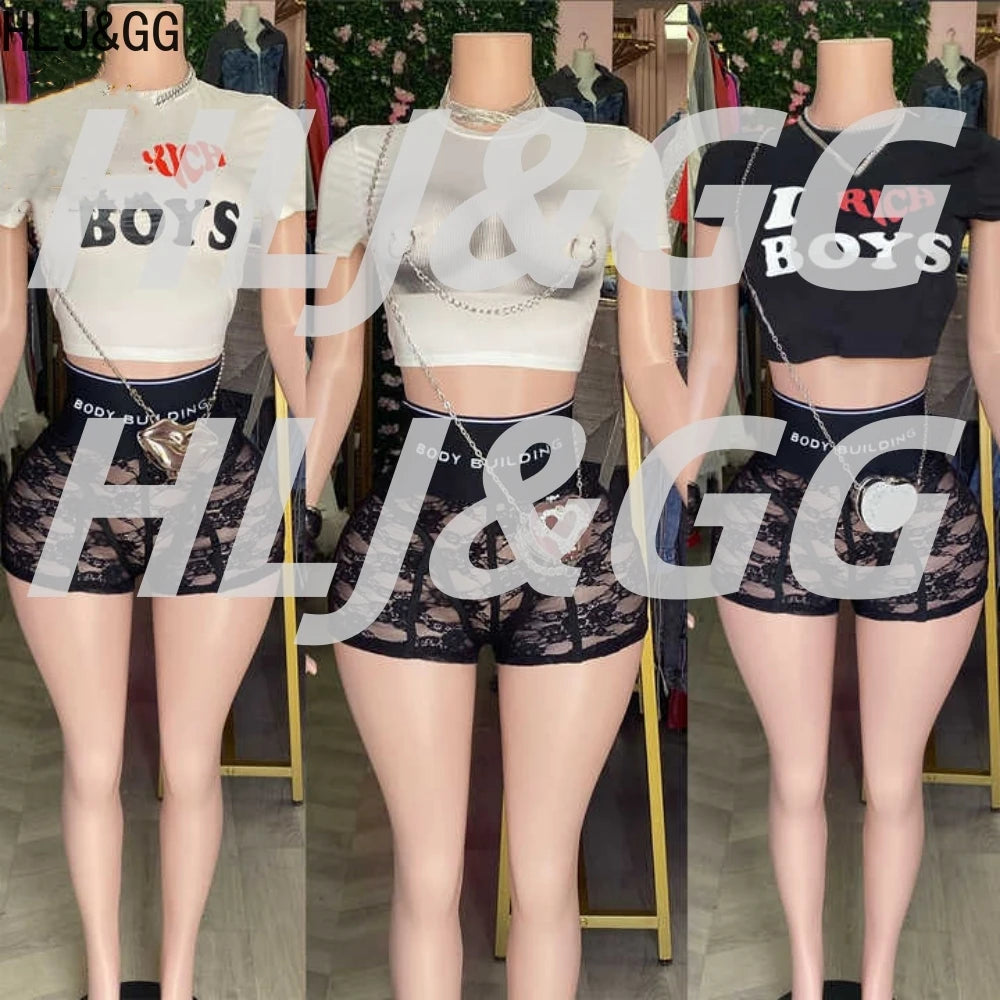 HLJ&GG Trendy Summer New Letter Printing Lace See Though Shorts Two Piece Sets Women Round Neck Slim Crop Top And Shorts Outfits
