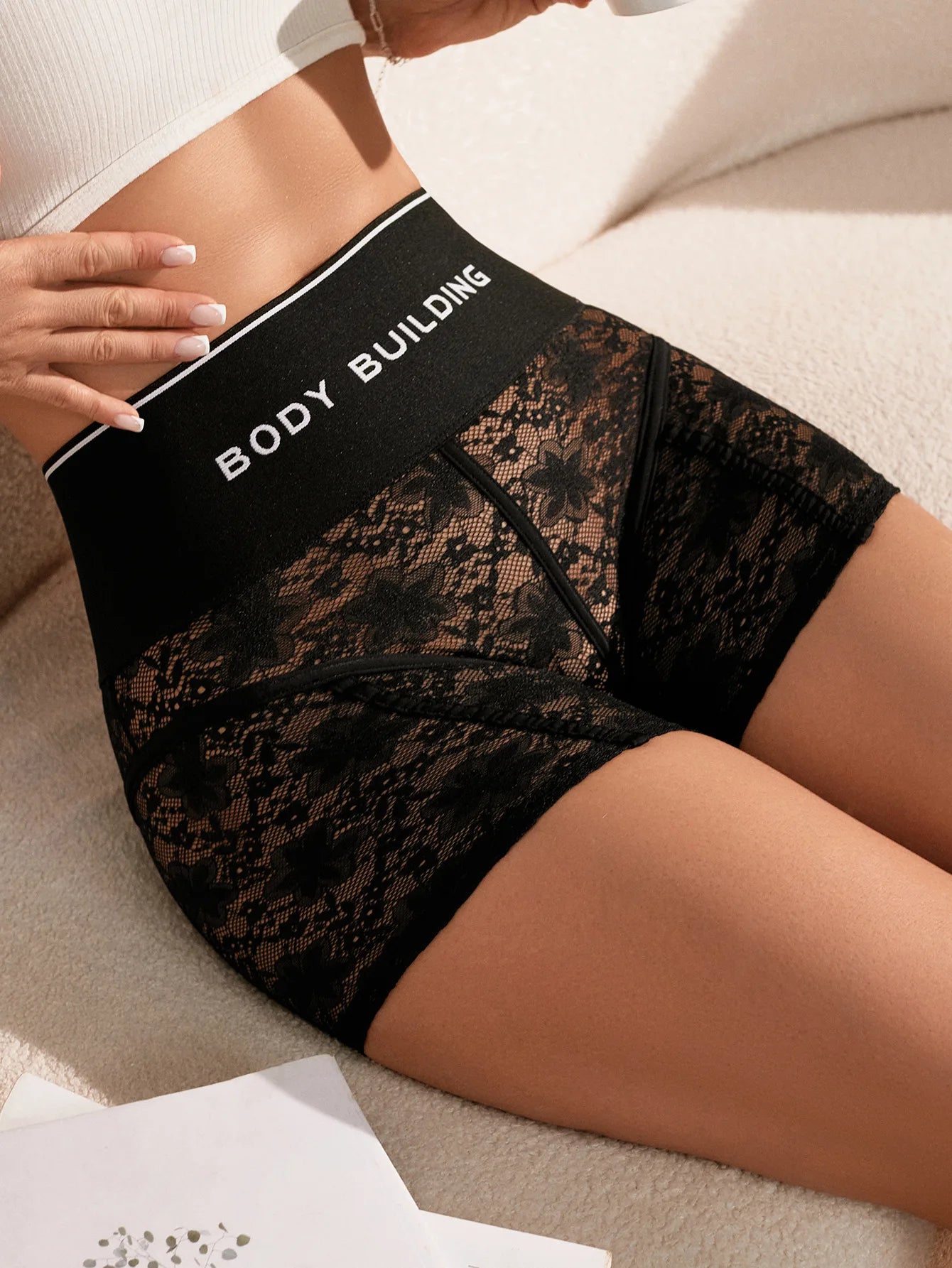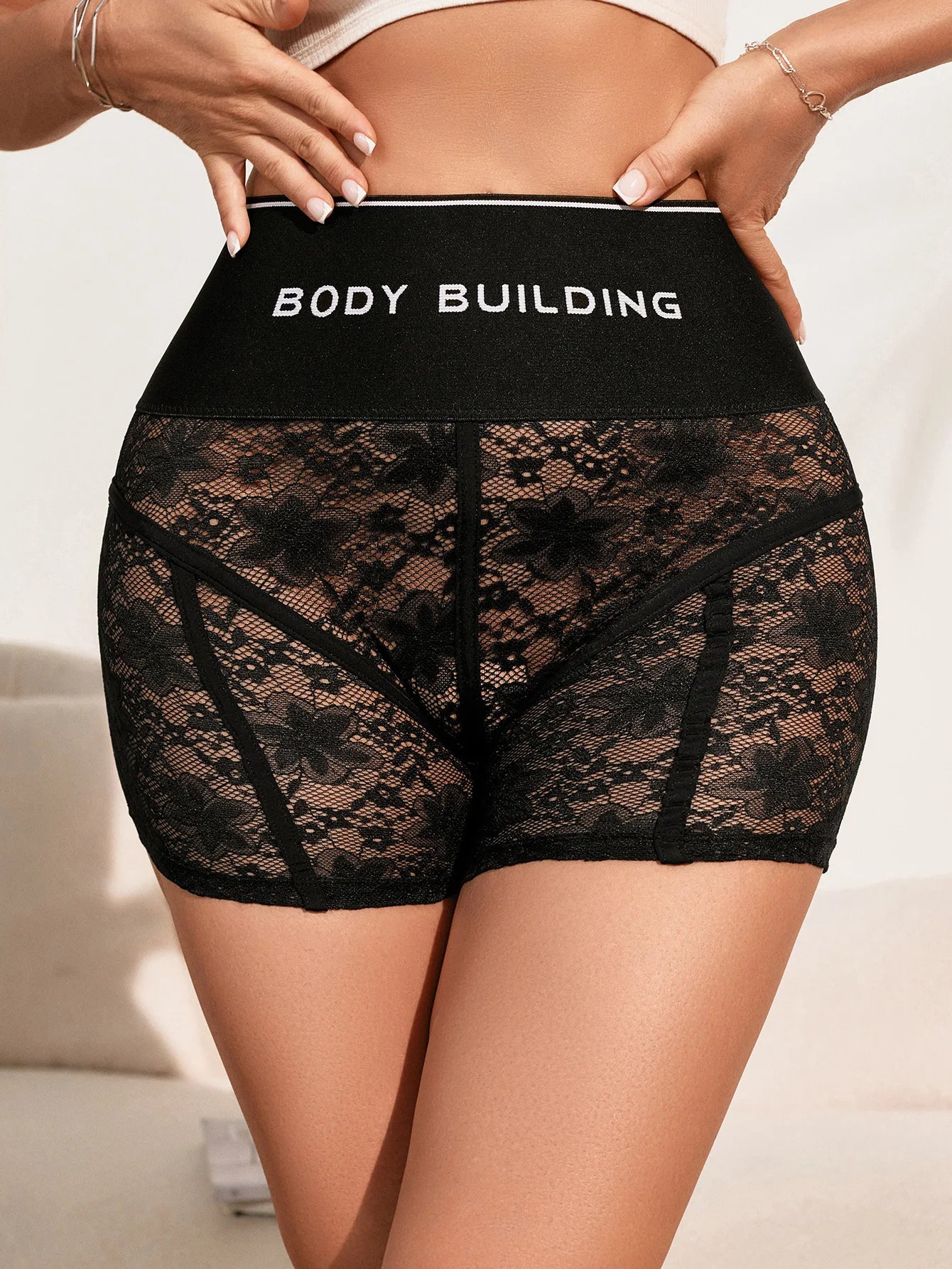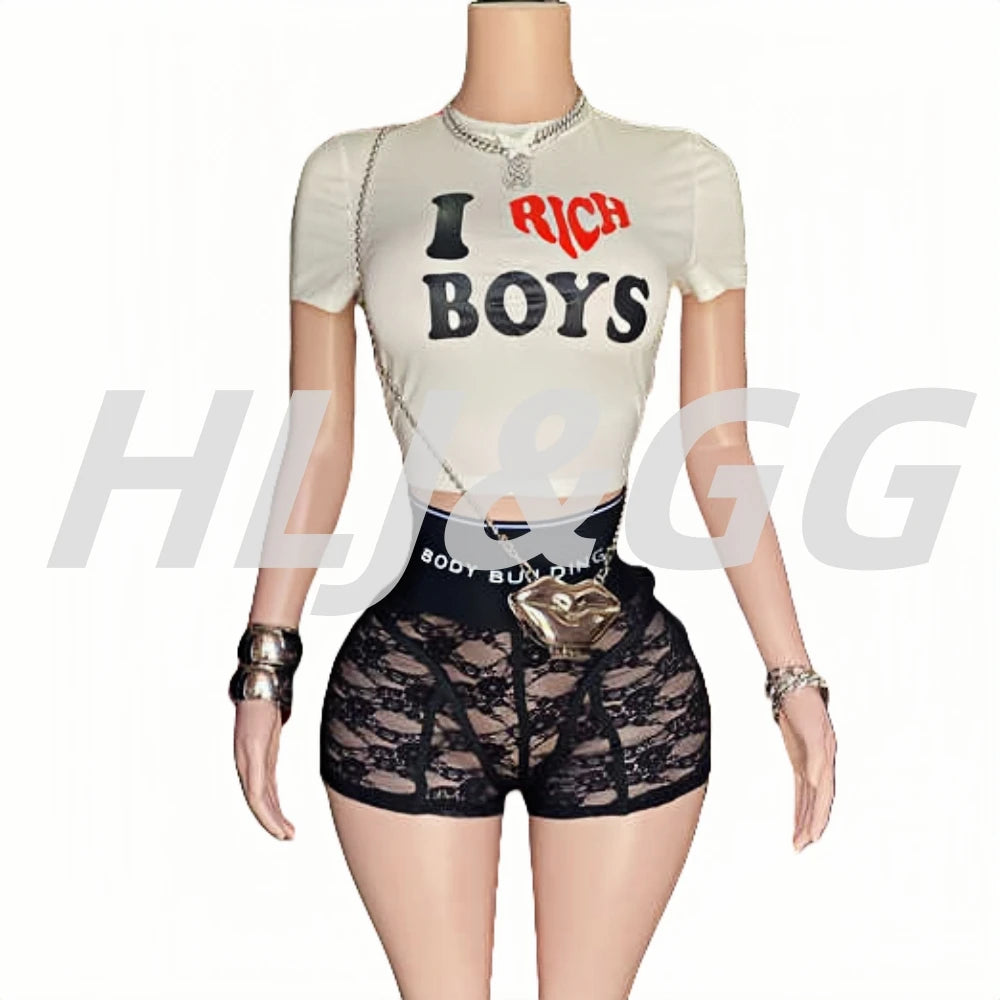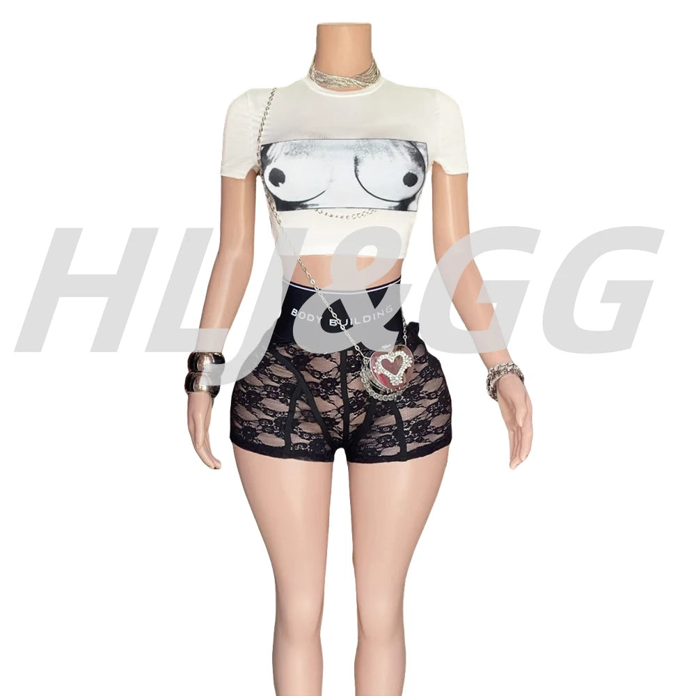 HLJ&GG Trendy Summer New Letter Printing Lace See Though Shorts Two Piece Sets Women Round Neck Slim Crop Top And Shorts Outfits