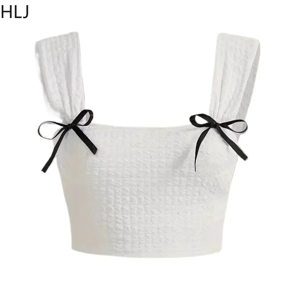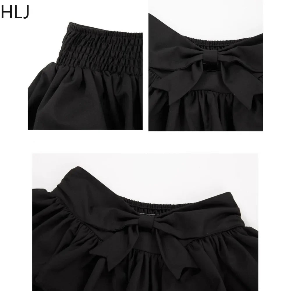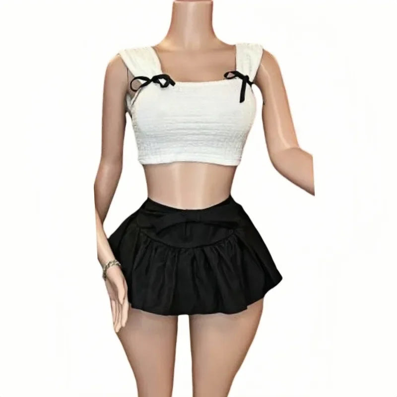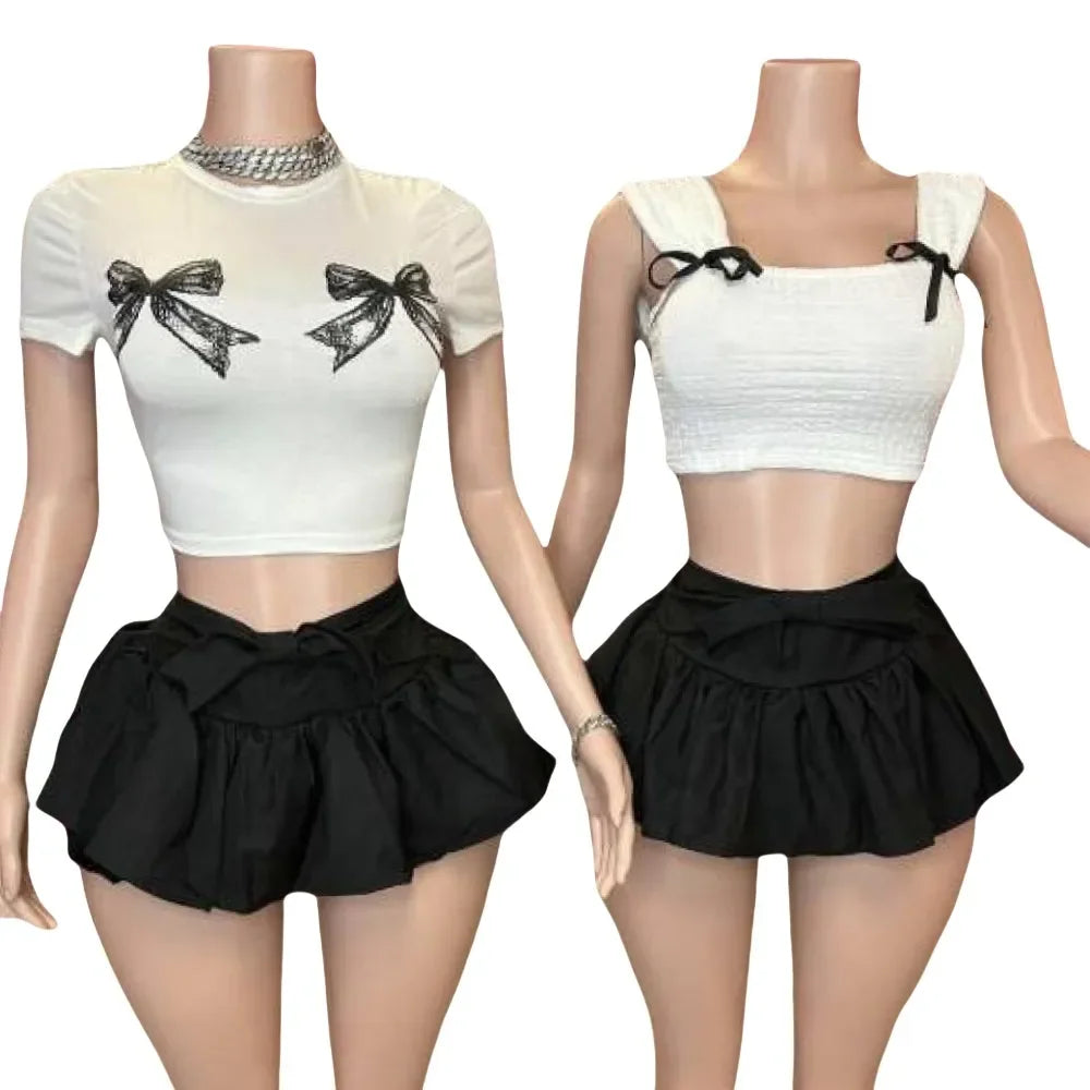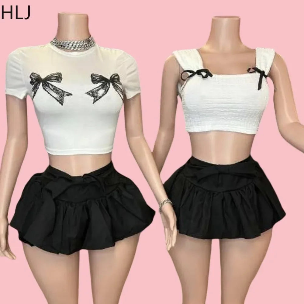 HLJ&GG White Sweet Y2K Bow Puffy Mini Skirts Shorts Two Piece Sets Women Short Sleeve Slim Top And Skirts Outfits Streetwear