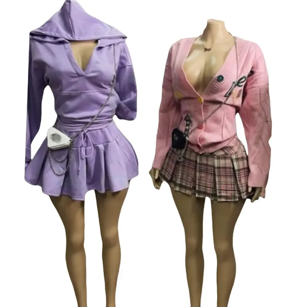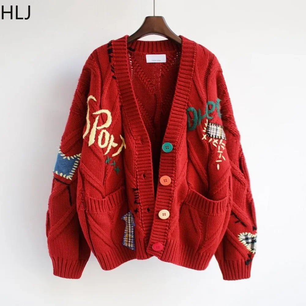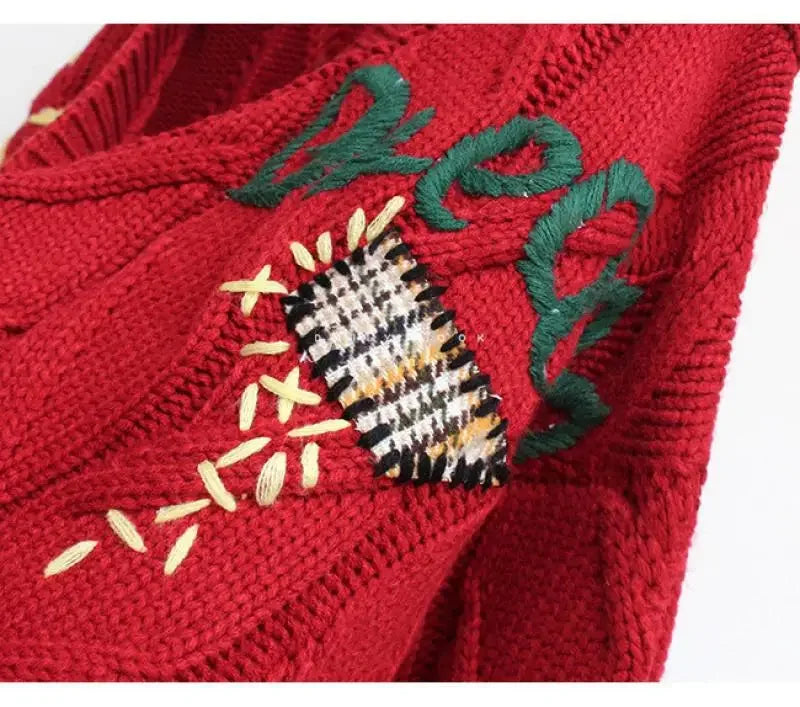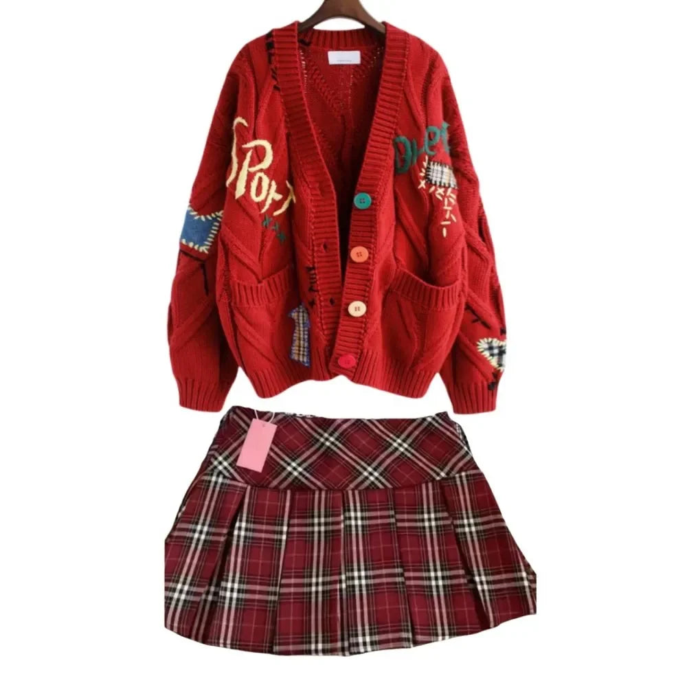 HLJ&GG Winter Embroidery Knit Sweater Coats Two Piece Sets Women Button Long Sleeve Top And Plaid Aline Skirts Outfit Streetwear