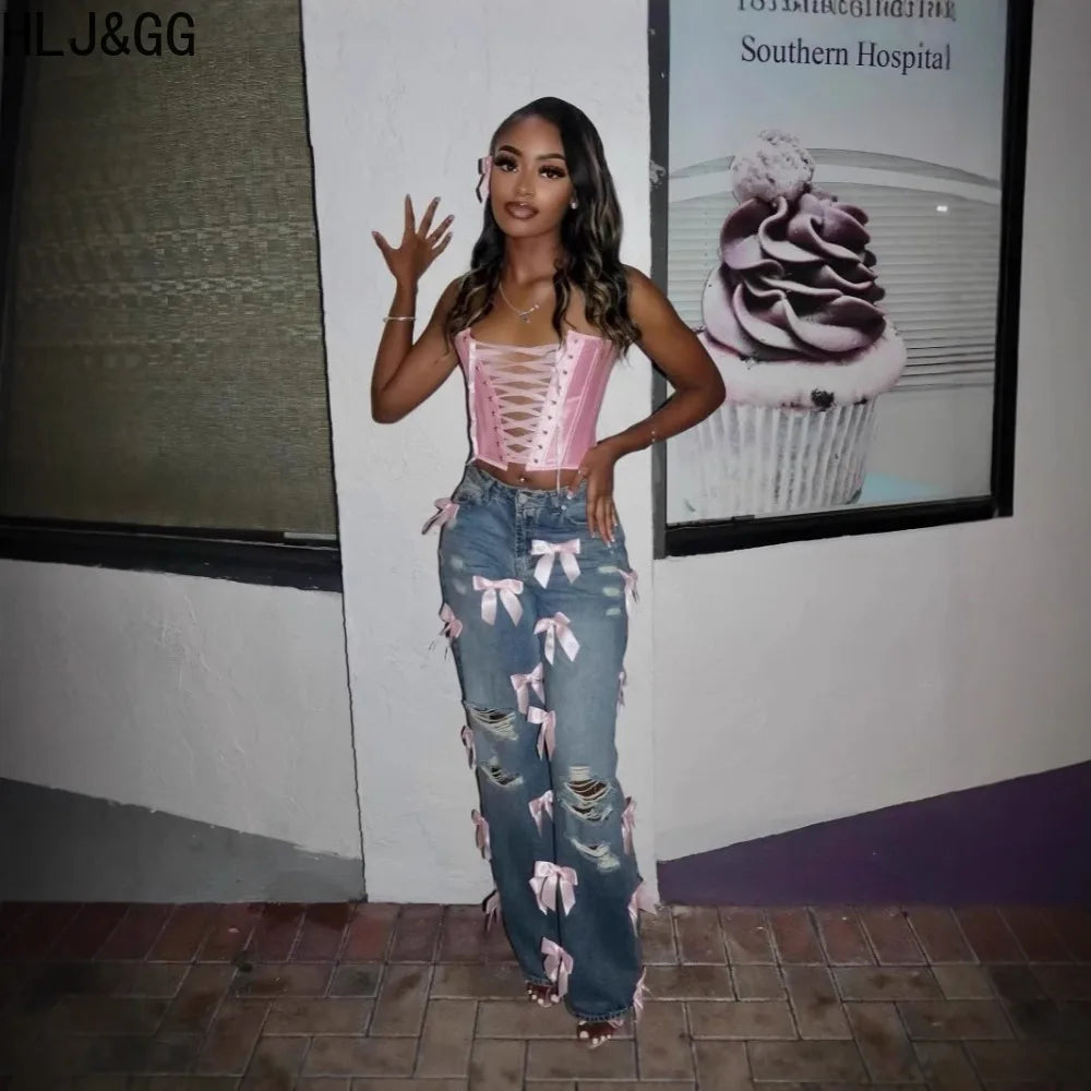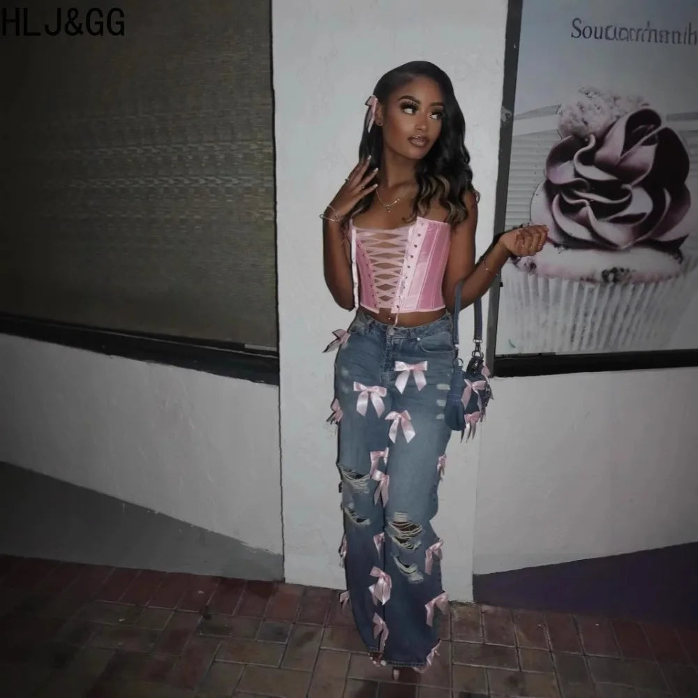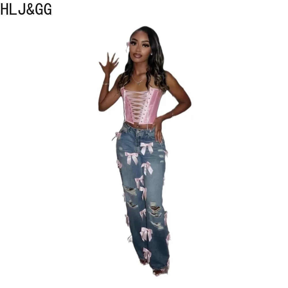 HLJ&GG Y2K Fashion Bow Sweet Straight Jeans Pants Women High Waisted Button Pocket, Hot Girl Streetwear Bottoms 2025