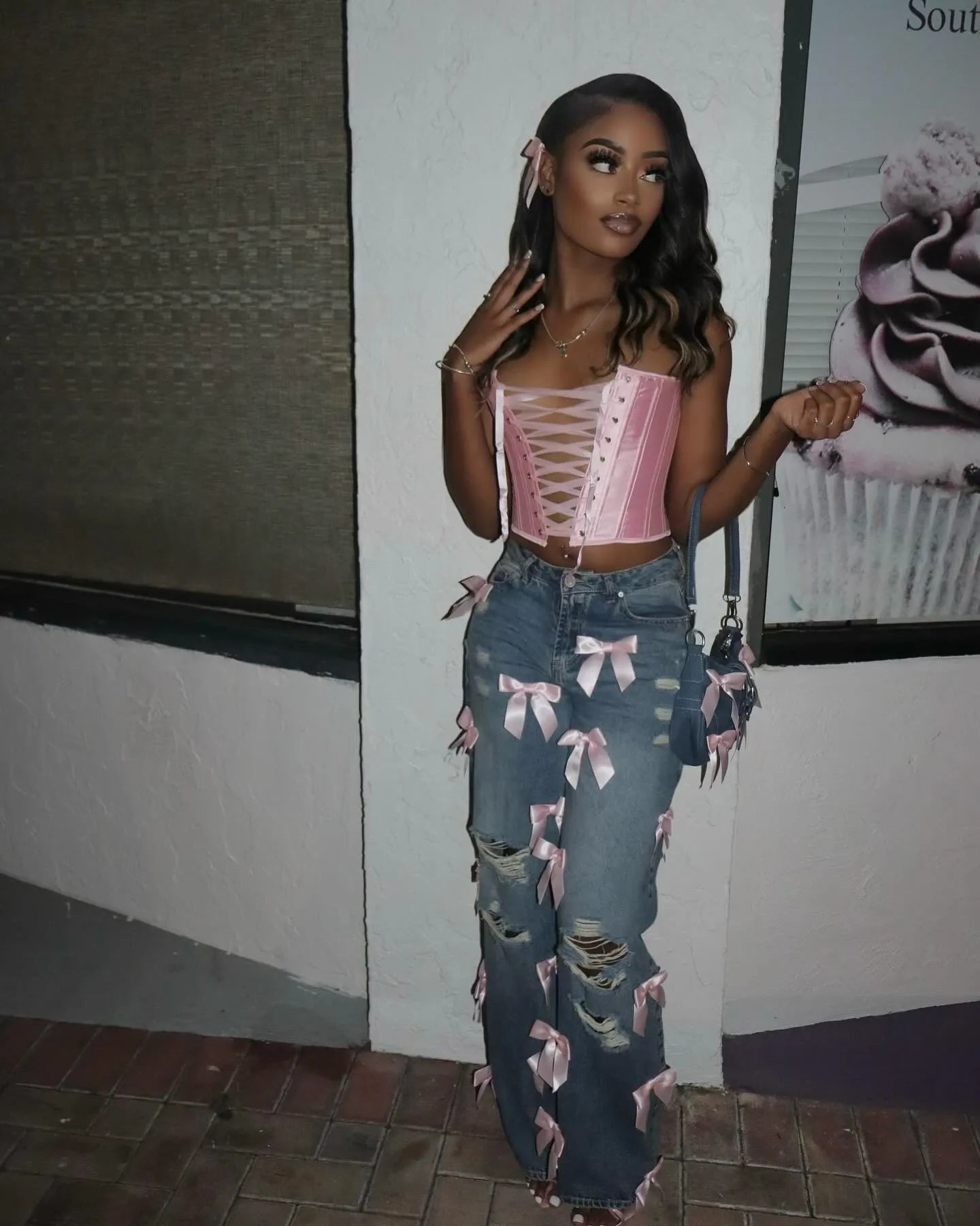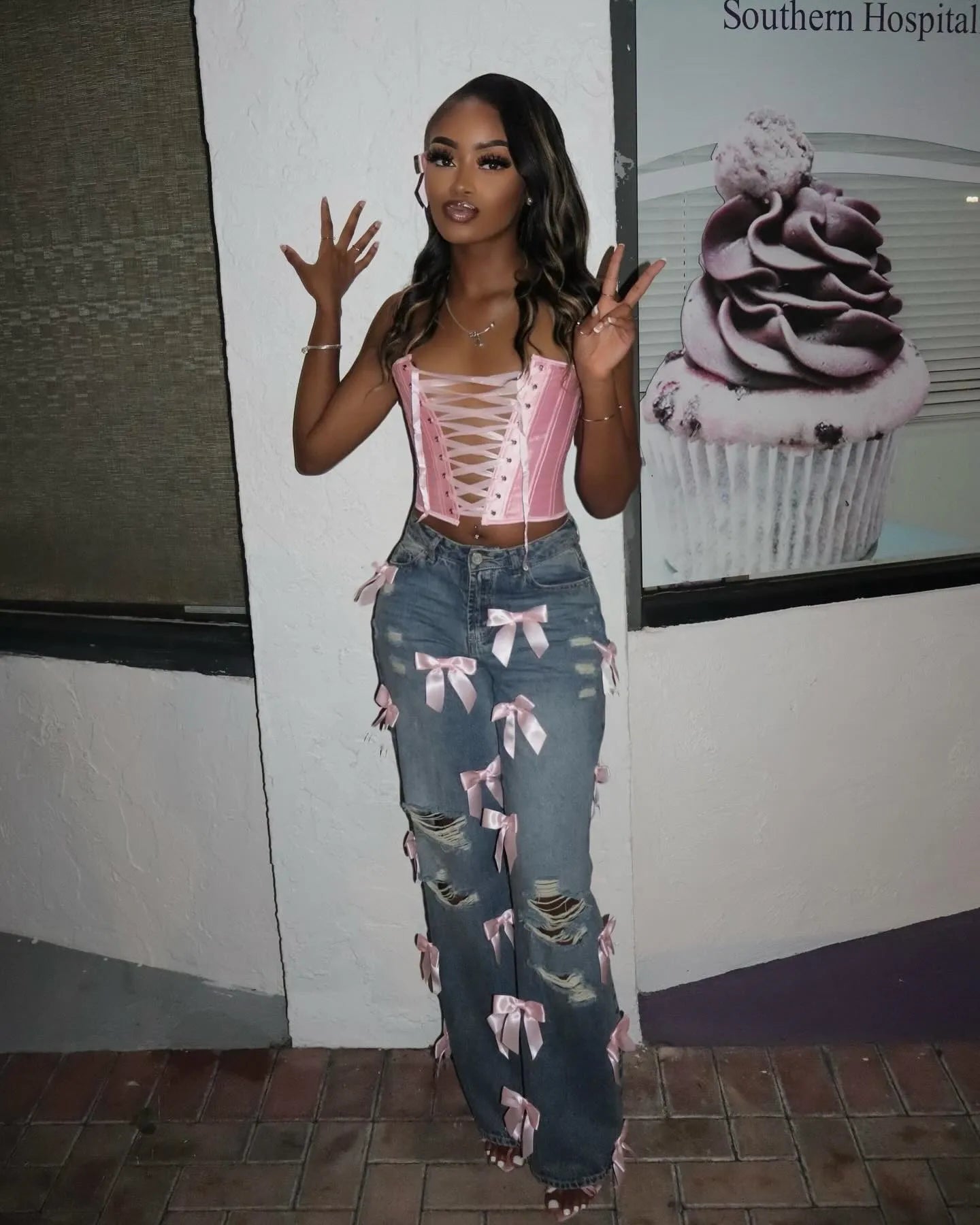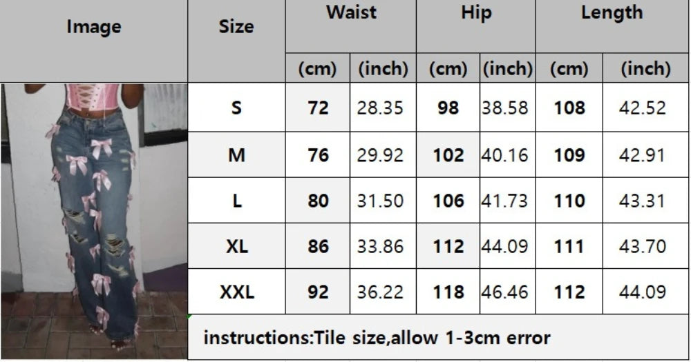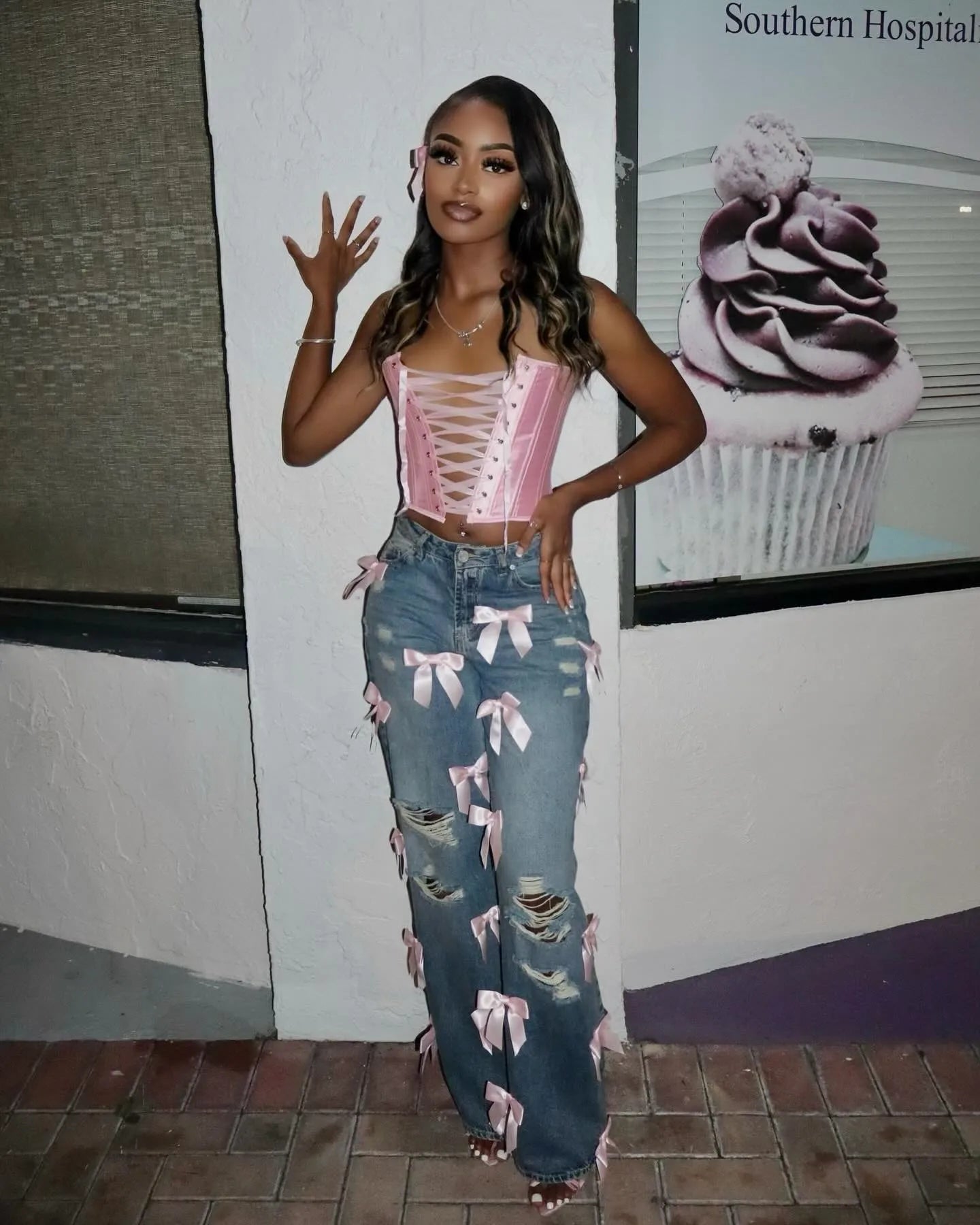 HLJ&GG Y2K Fashion Bow Sweet Straight Jeans Pants Women High Waisted Button Pocket, Hot Girl Streetwear Bottoms 2025