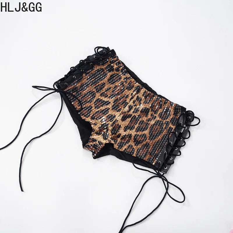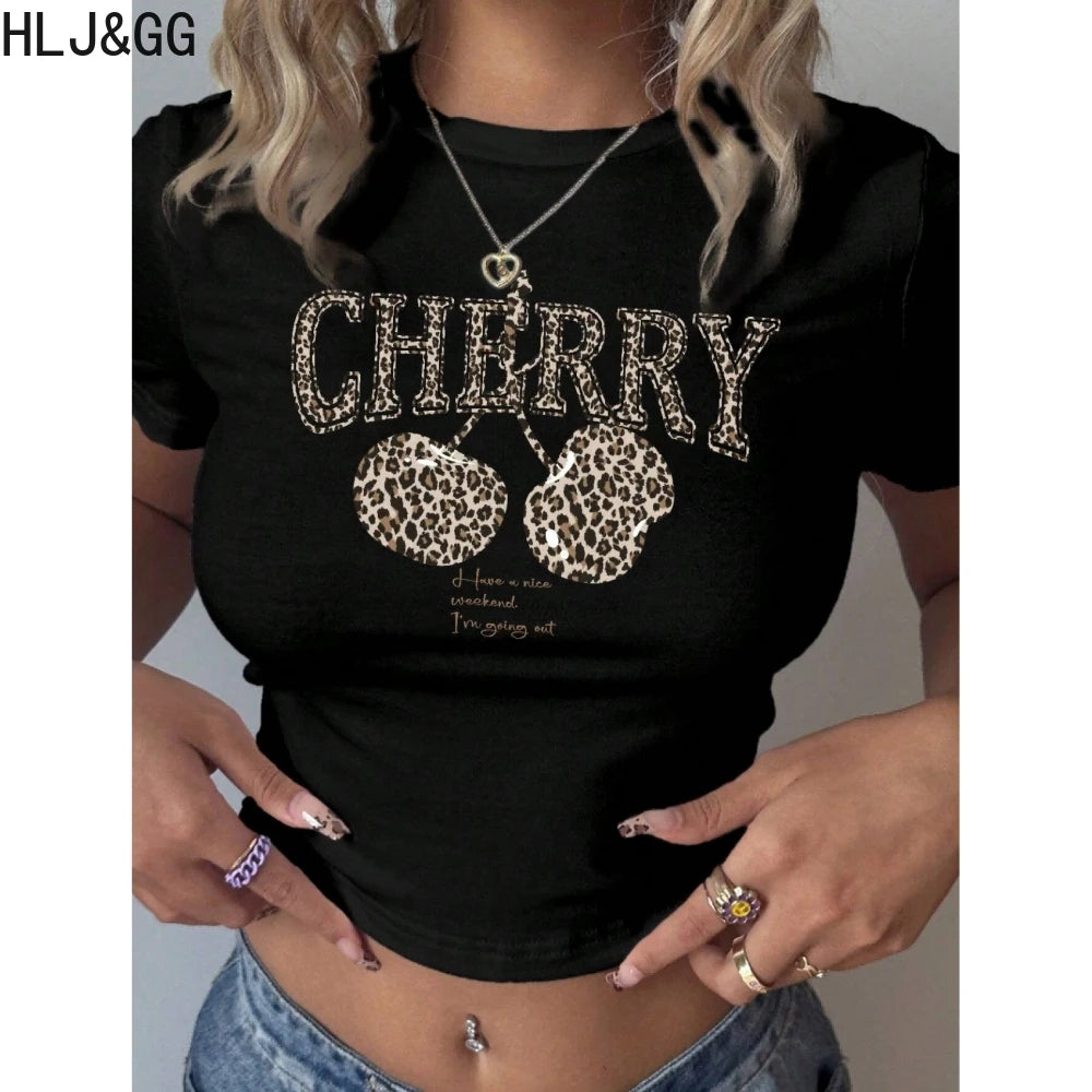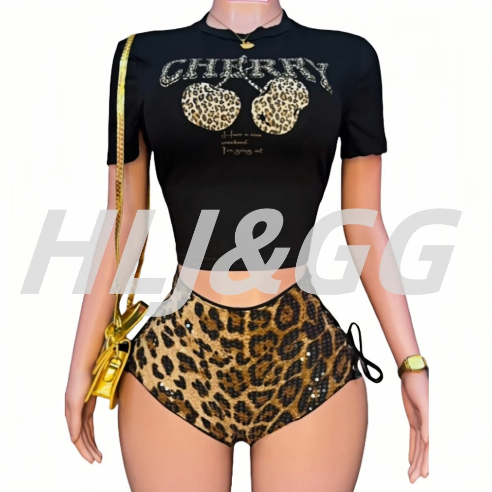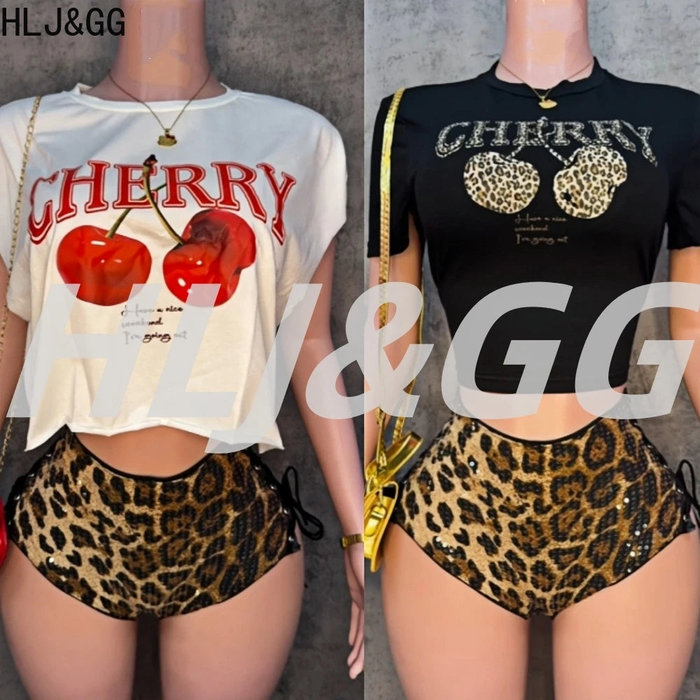 HLJ&GG Y2K Fashion Cherry Tshirts Two Piece Sets Women O Neck Short Sleeve Slim Crop Top + Bandage Sequin Leopard Shorts Outfits