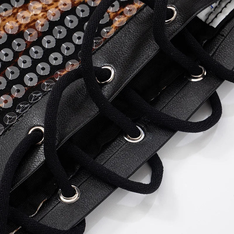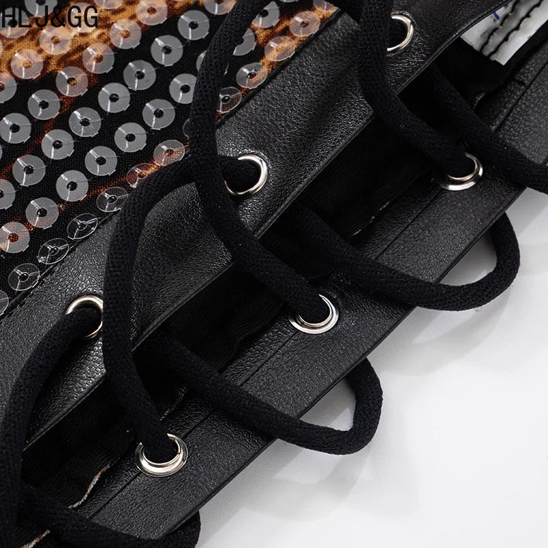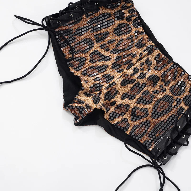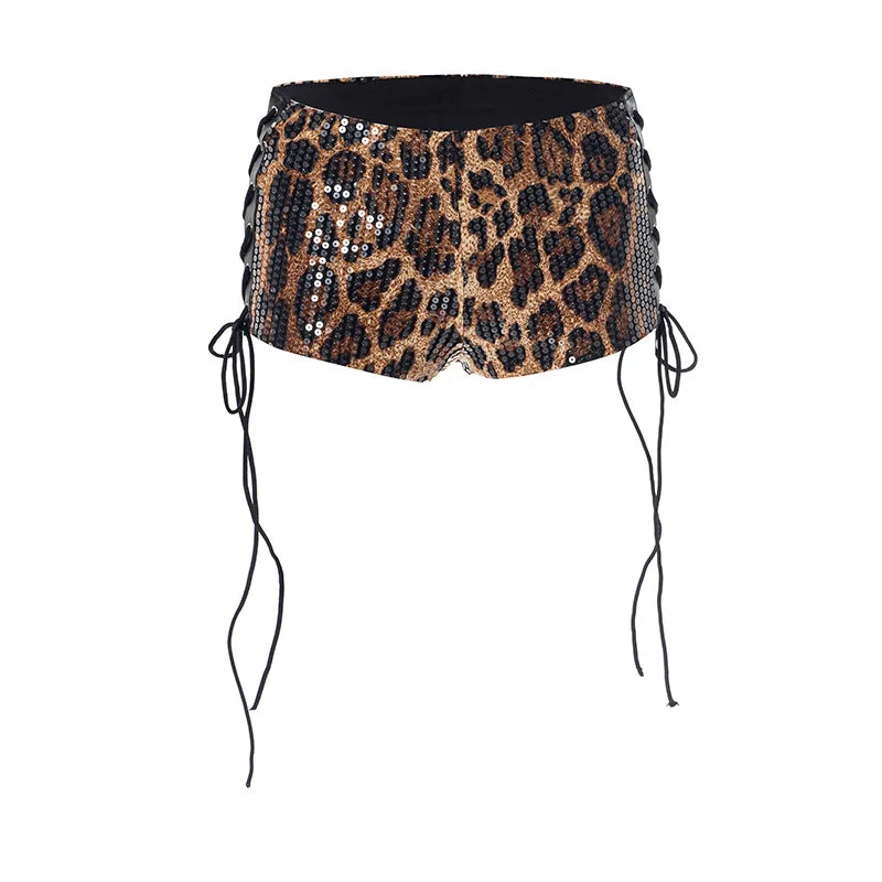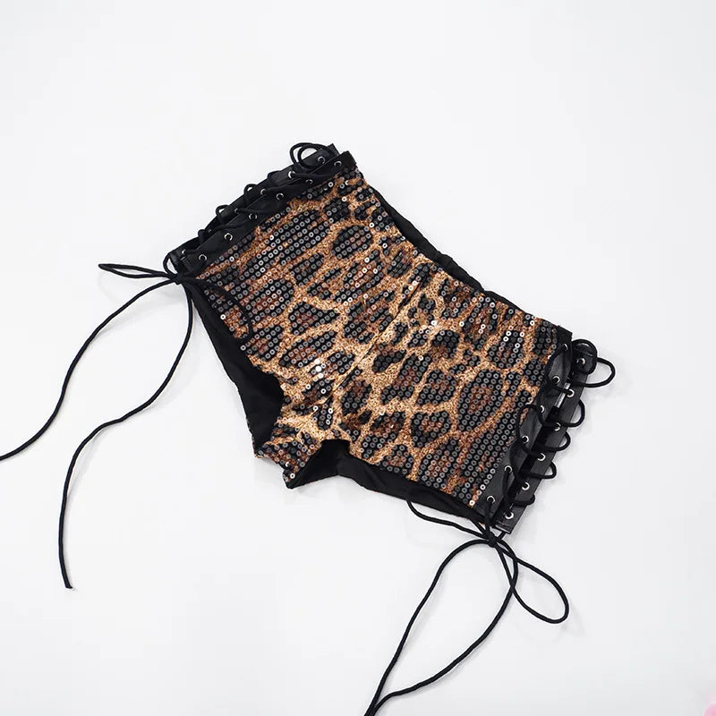 HLJ&GG Y2K Fashion Cherry Tshirts Two Piece Sets Women O Neck Short Sleeve Slim Crop Top + Bandage Sequin Leopard Shorts Outfits