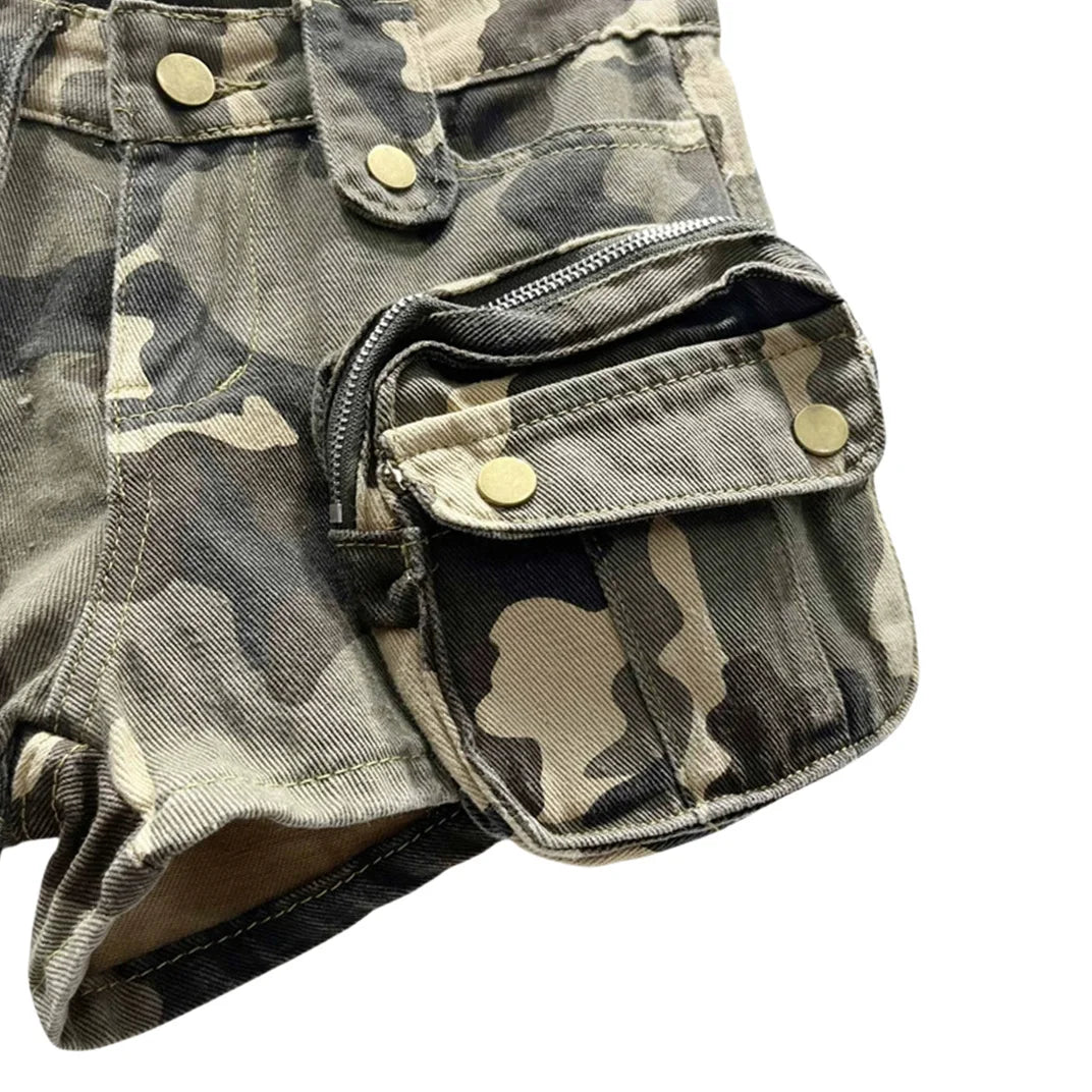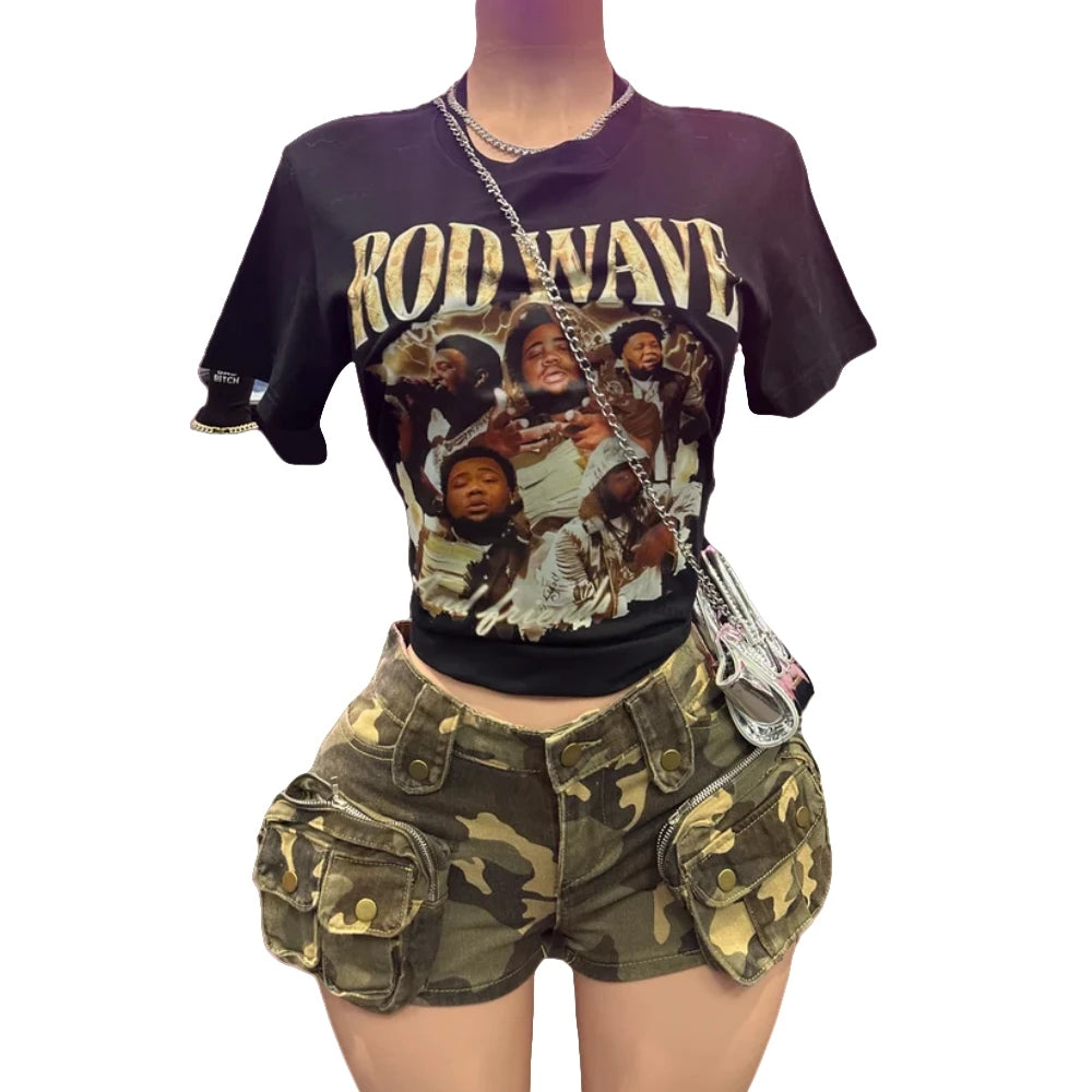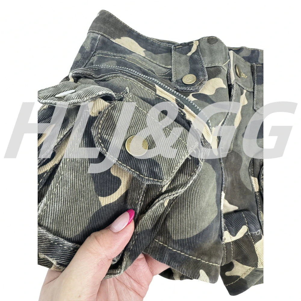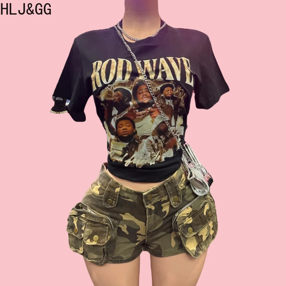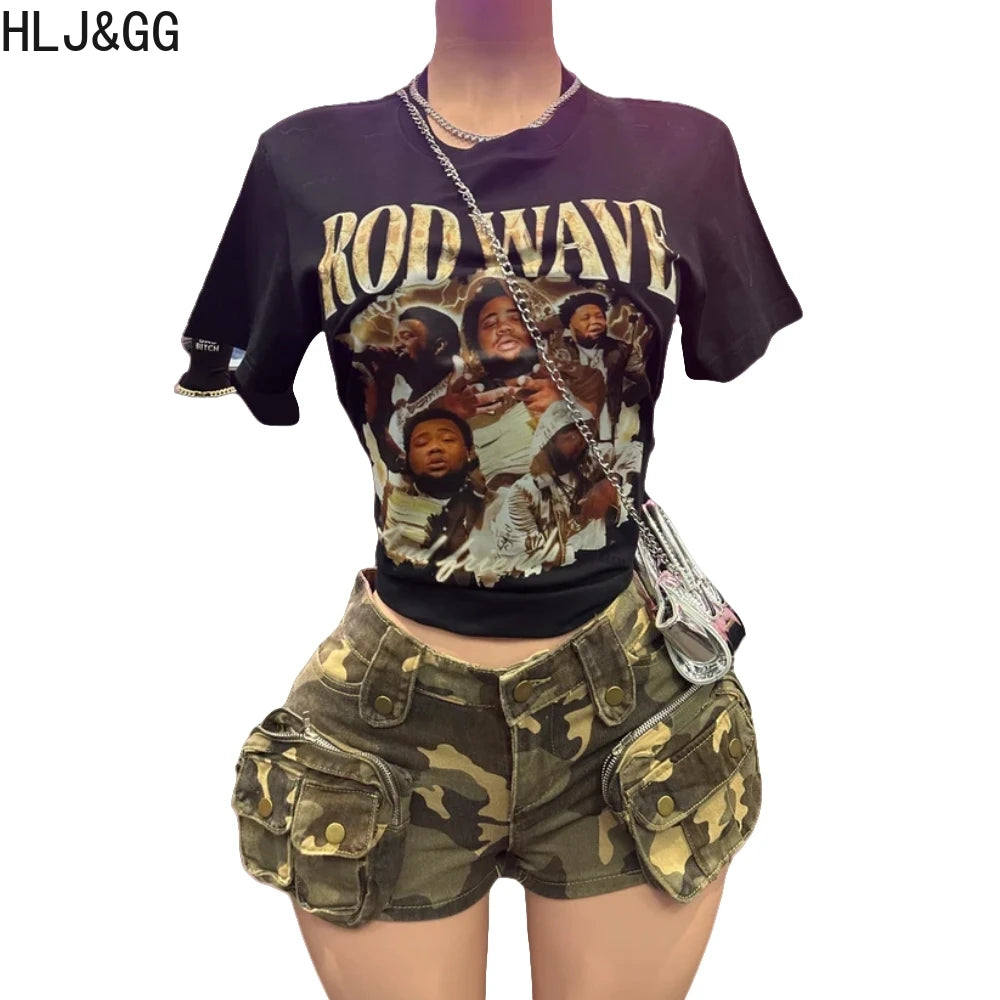 HLJ&GG Y2K Fashion Graphic Tshirts Two Piece Sets Women O Neck Short Sleeve Loose Top And Camouflage Pocket jeans Shorts Outfits