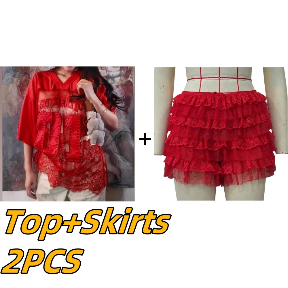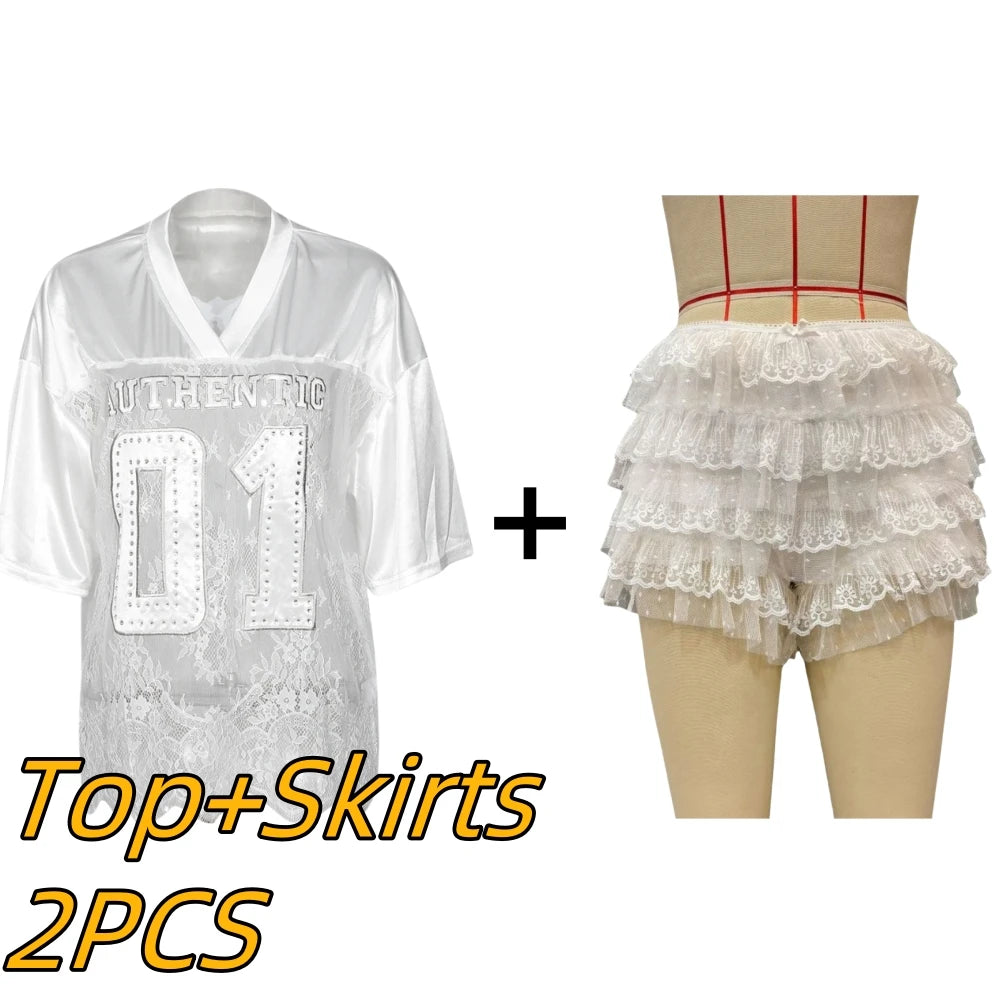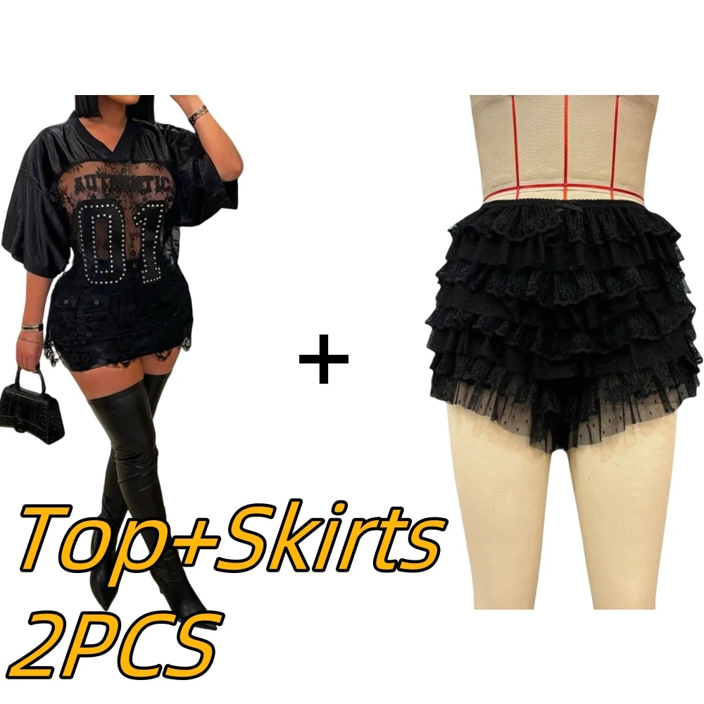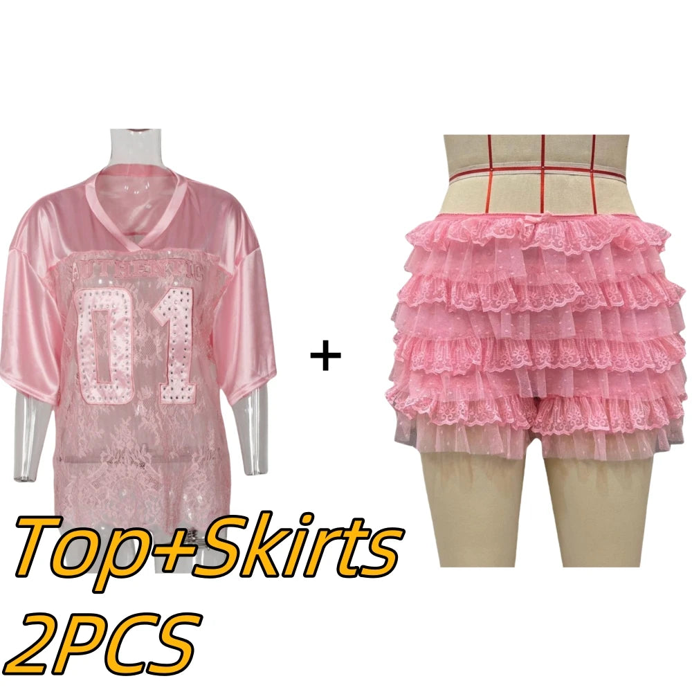 HLJ&GG Y2K Fashion Lace Splicing Letter Two Piece Sets Women V Neck Short Sleeve Loose Top+Mini Ruffle Skirts Outfits Streetwear