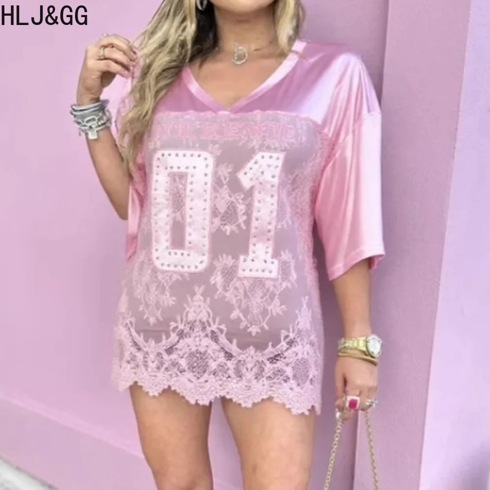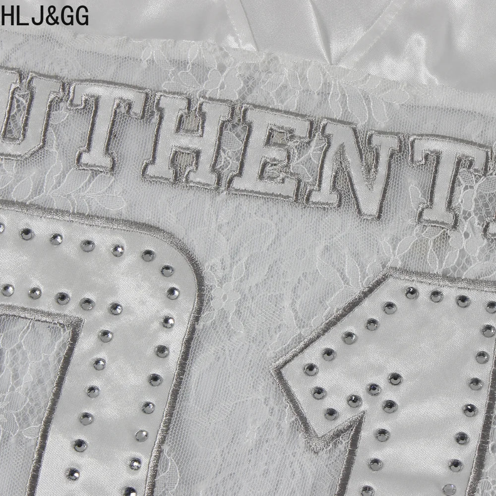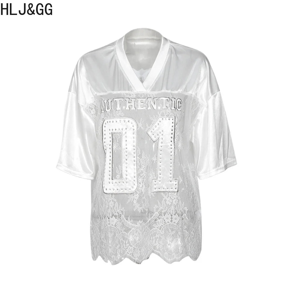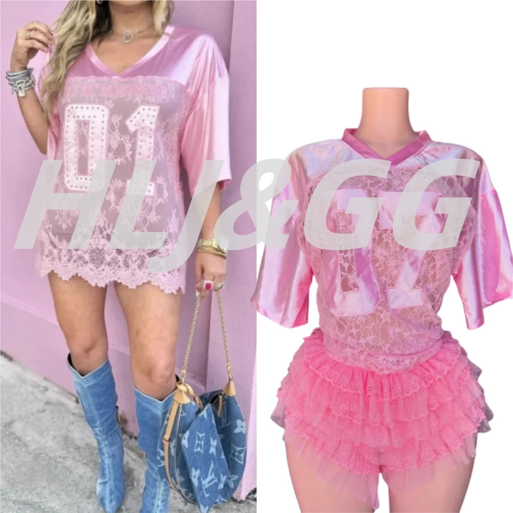 HLJ&GG Y2K Fashion Lace Splicing Letter Two Piece Sets Women V Neck Short Sleeve Loose Top+Mini Ruffle Skirts Outfits Streetwear