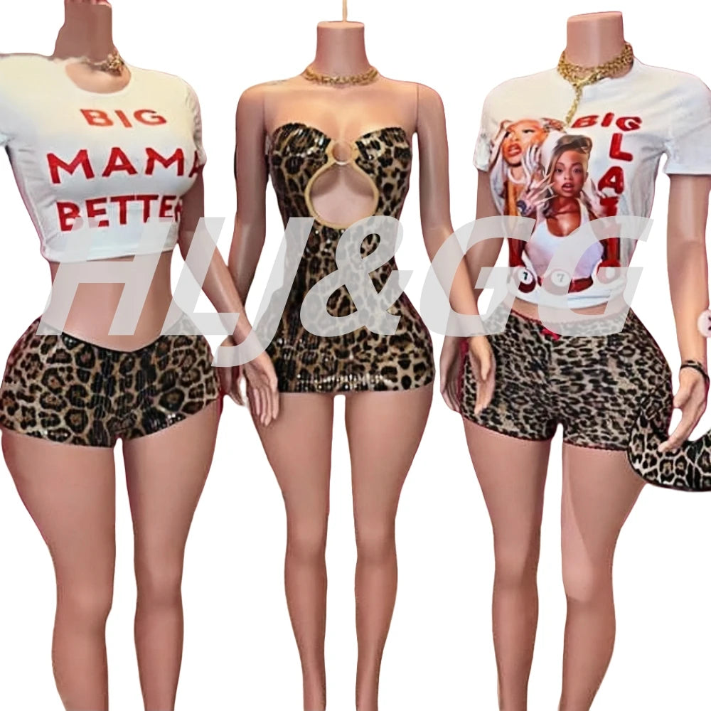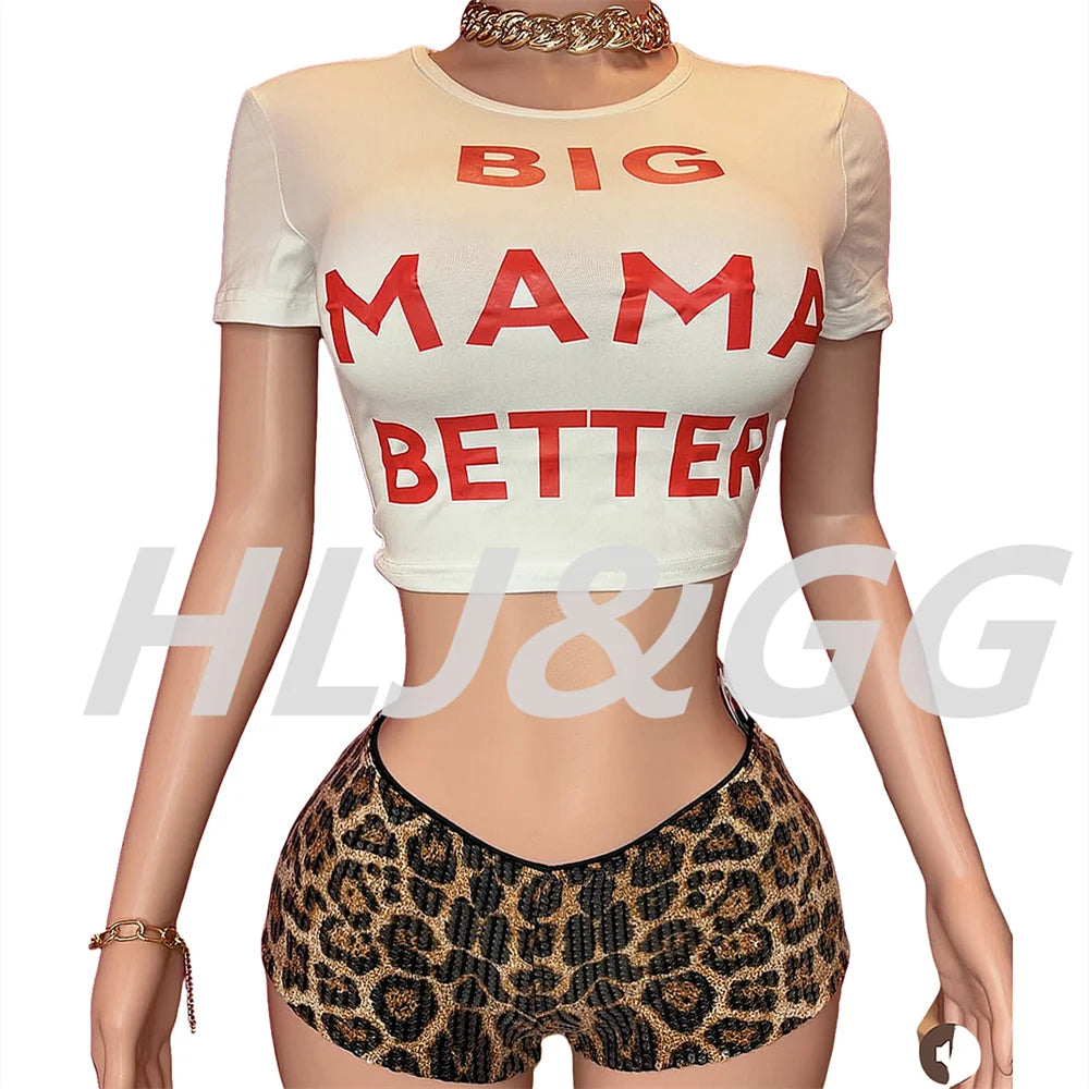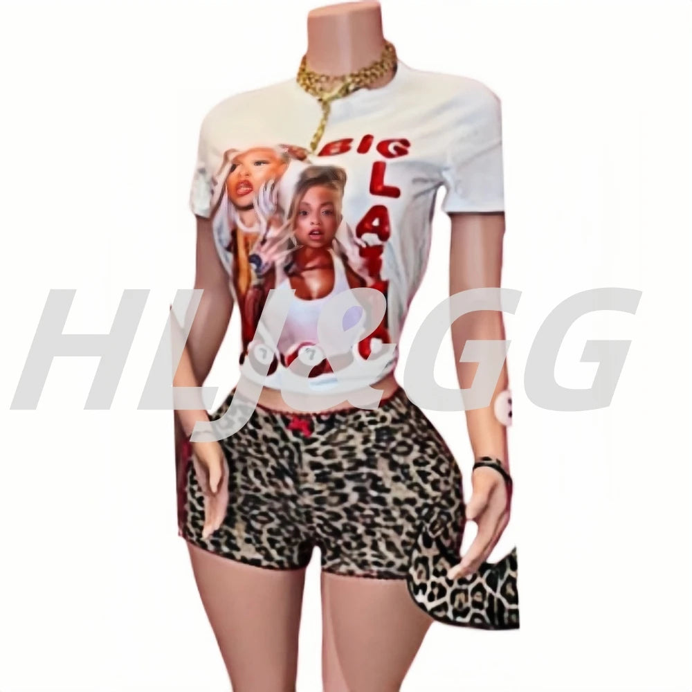 HLJ&GG Y2K Fashion Leopard Sequined Shorts Two Piece Sets Women Letter Print Round Neck Slim Crop Top And Shorts Outfits 2025