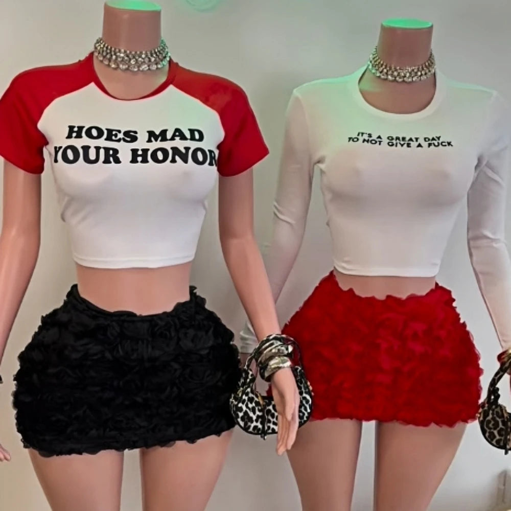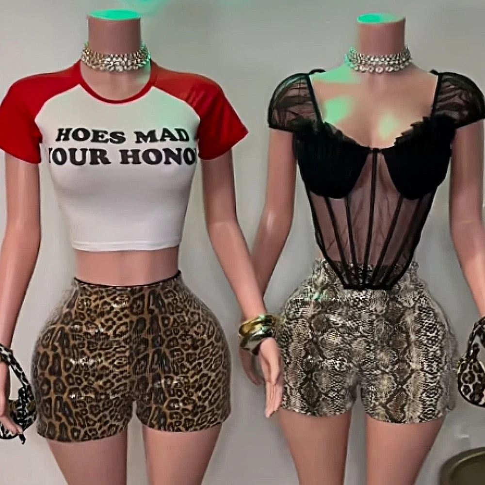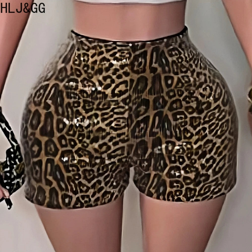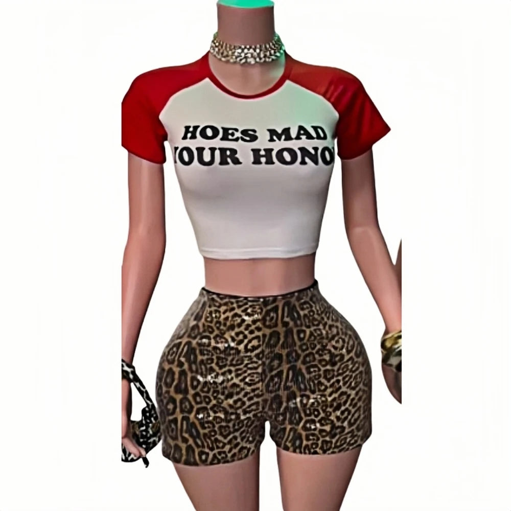 HLJ&GG Y2K Fashion Letter Print Slim Tshirts Two Piece Sets Women Round Neck Short Sleeve Top And Leopard Sequin Shorts Outfits