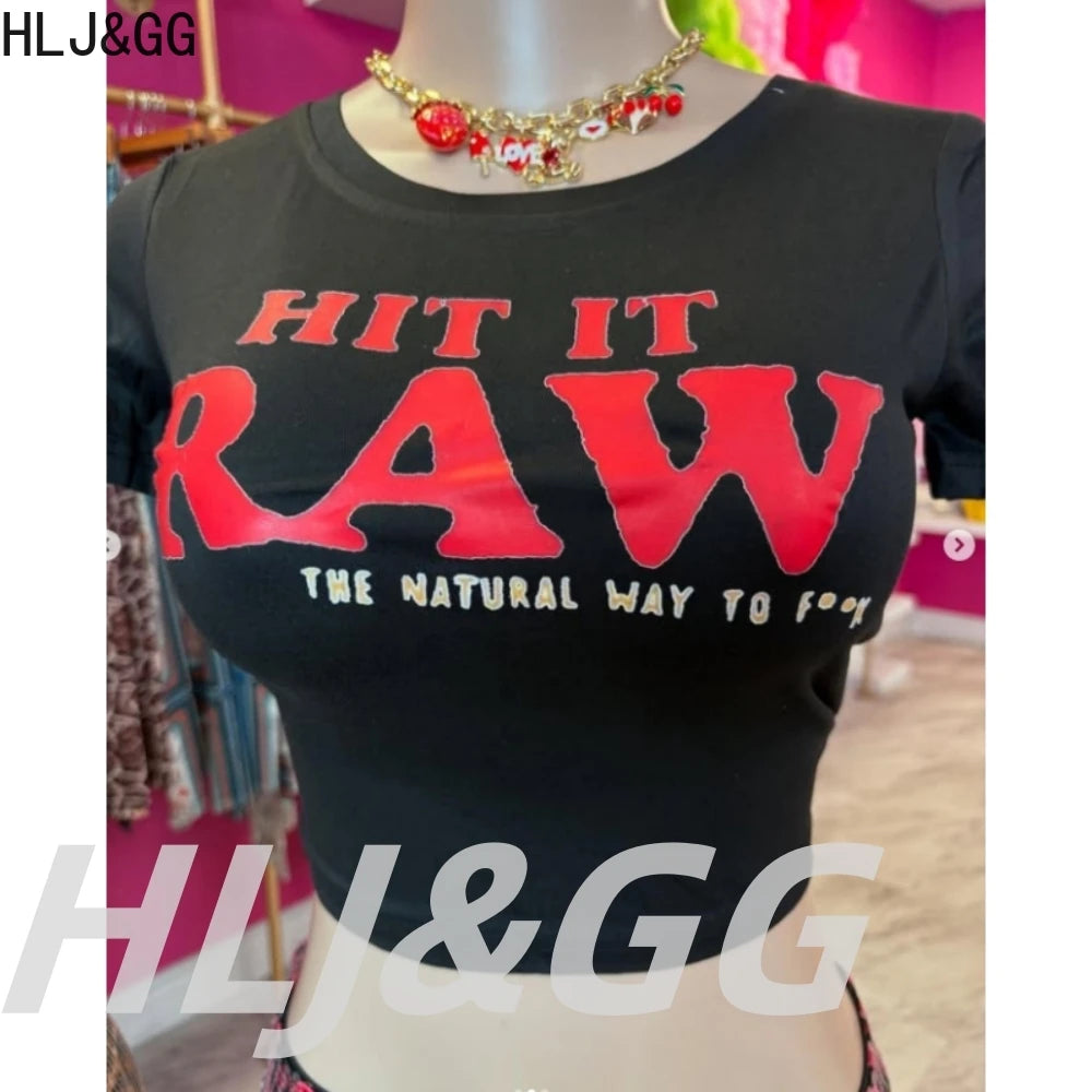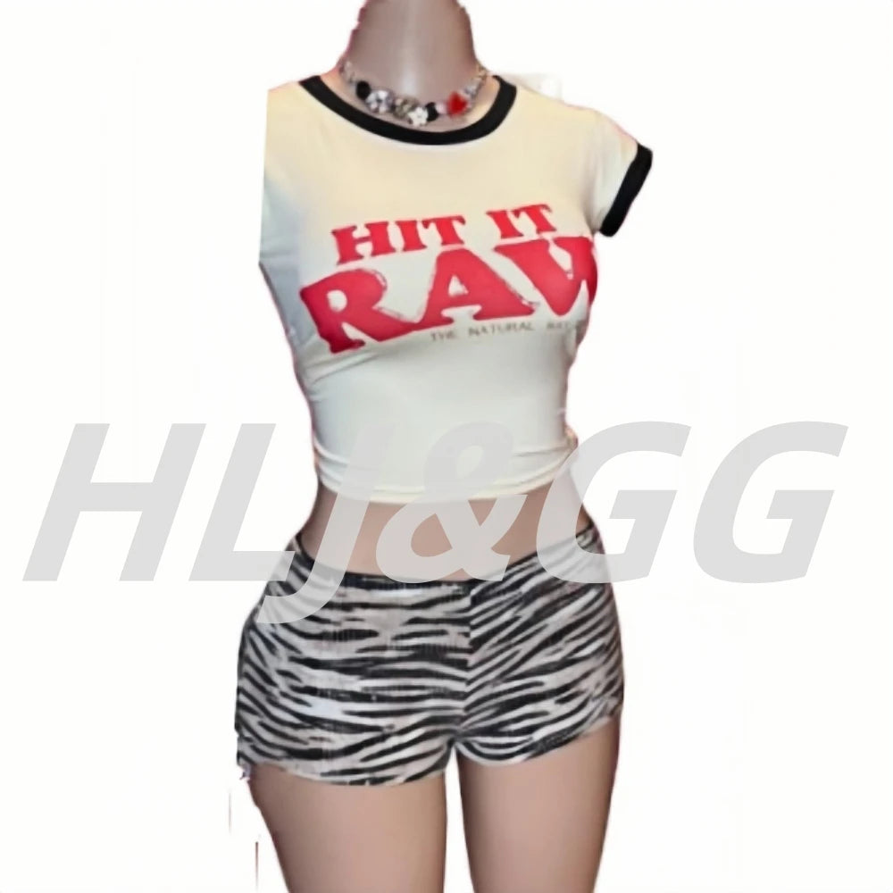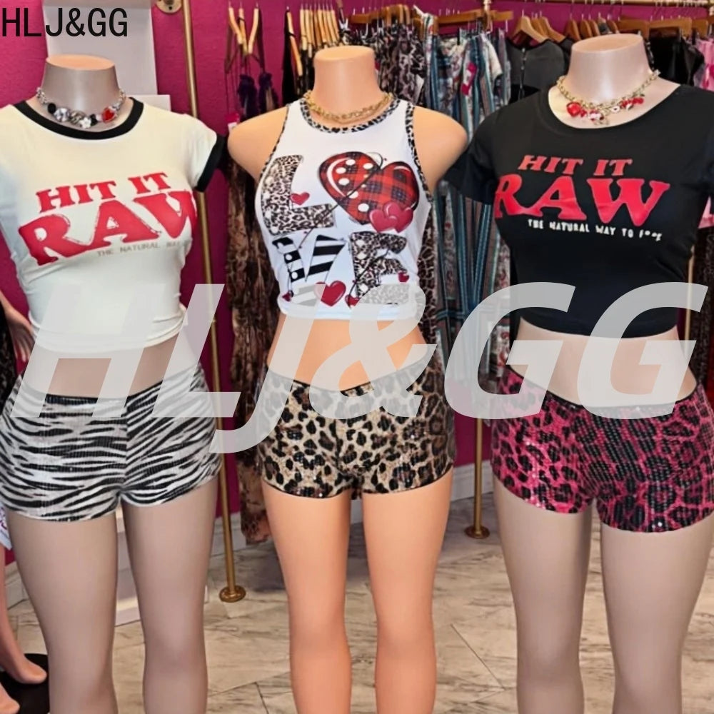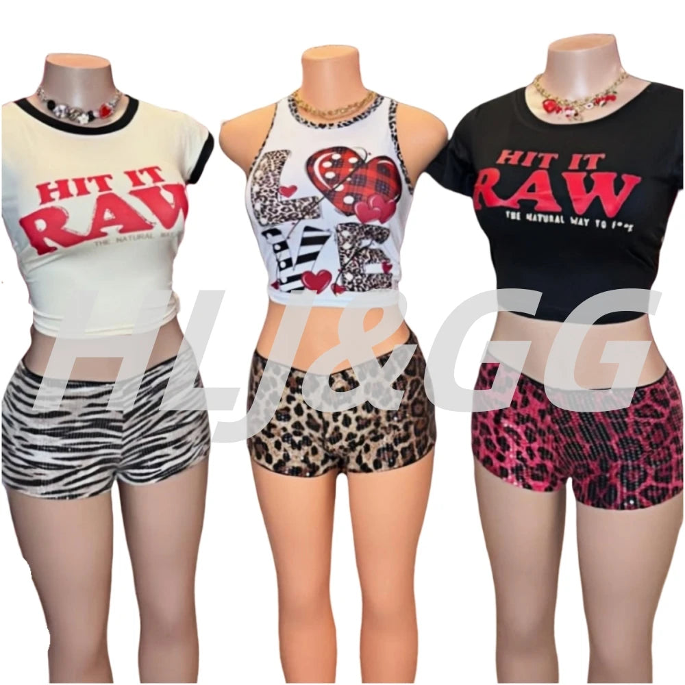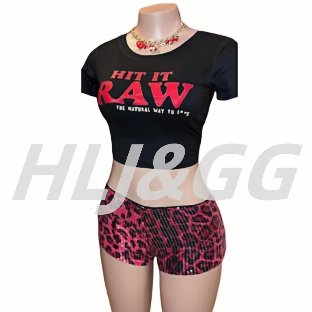 HLJ&GG Y2K Fashion Letter Printing Sequin Shorts Two Piece Sets Women Round Neck Short Sleeve Slim Crop Top And Shorts Outfits