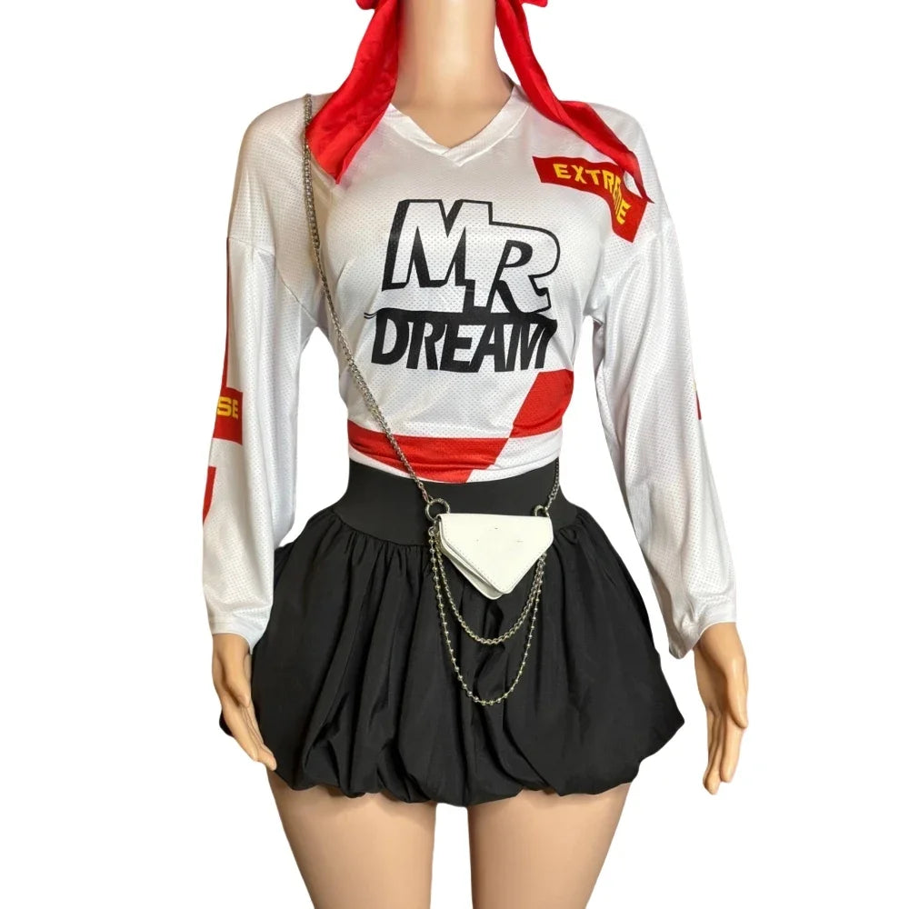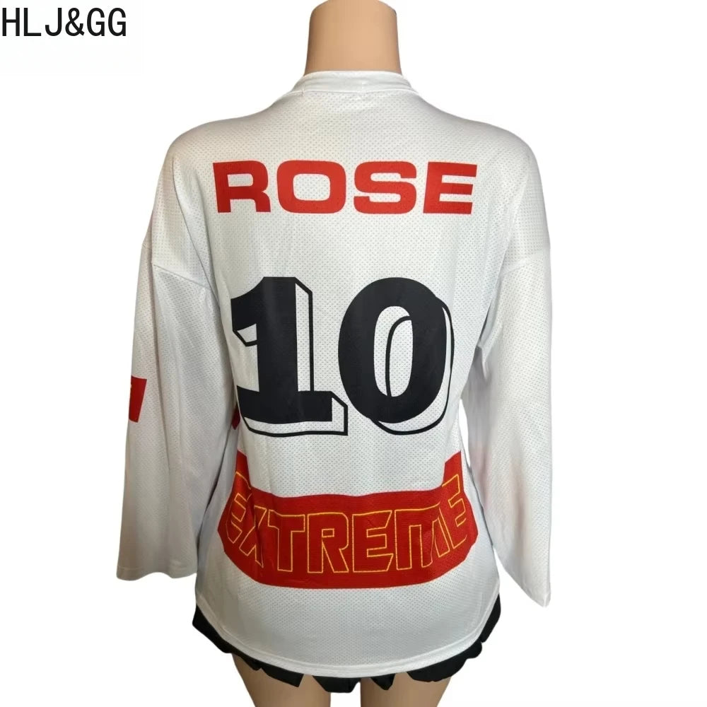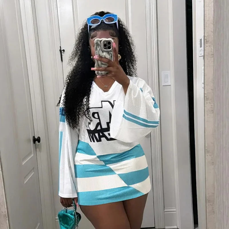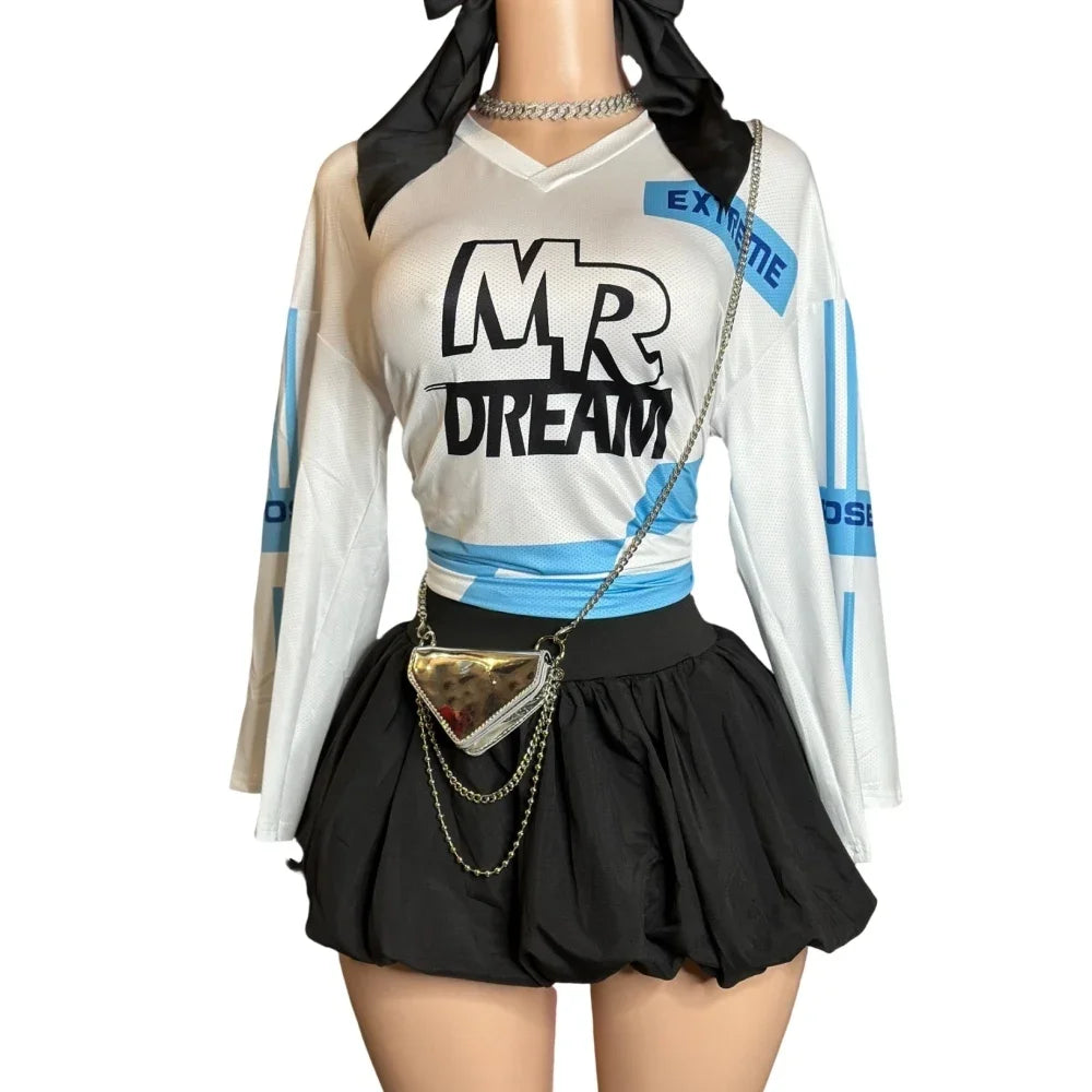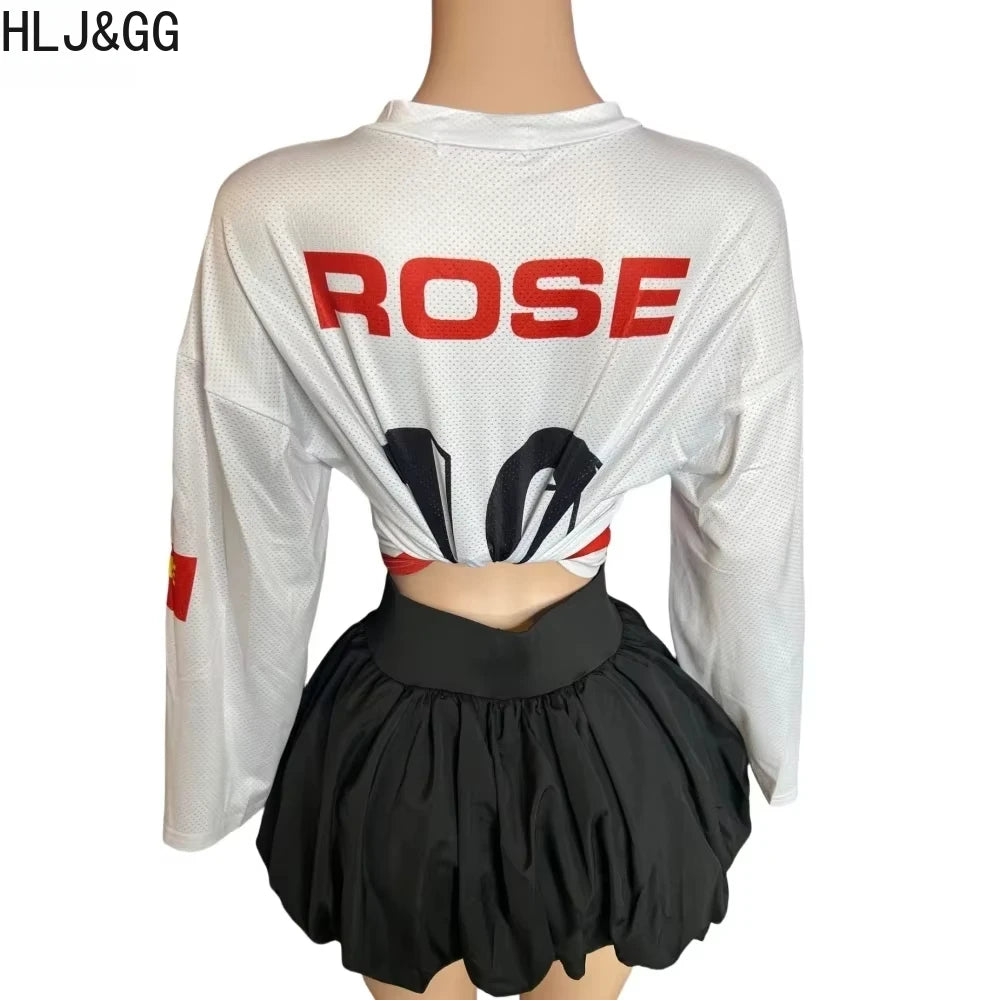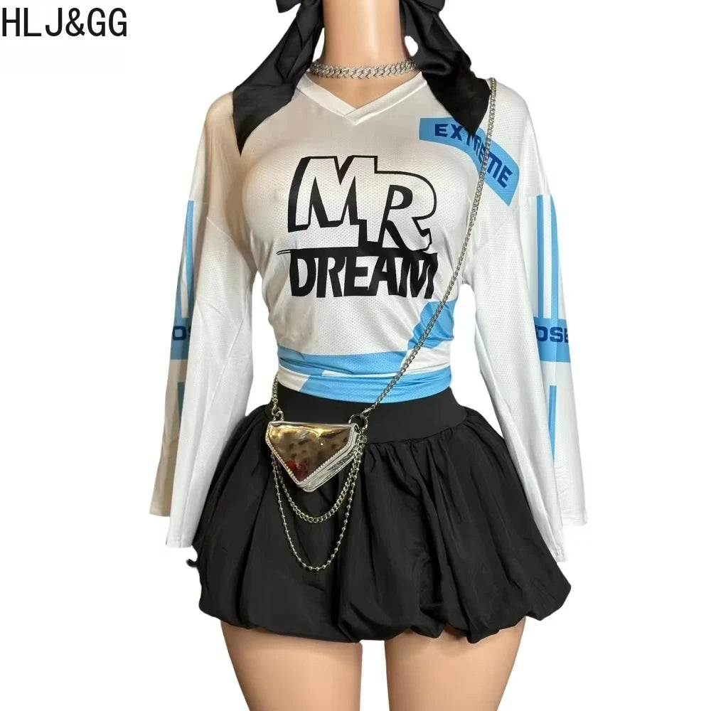 HLJ&GG Y2K Letter Print Mesh Two Piece Sets For Women V Neck Long Sleeve Top + Puffy Mini Skirts Outfits Fashion 2pcs Streetwear