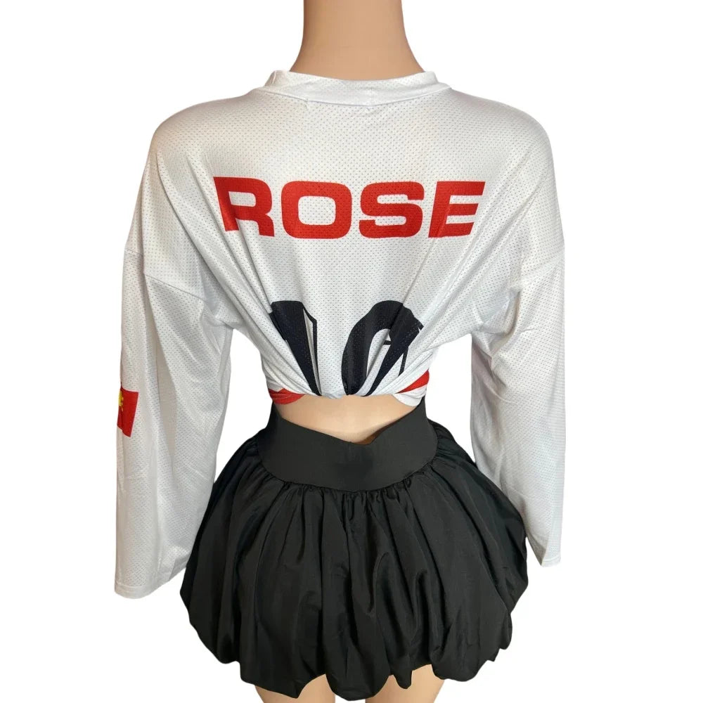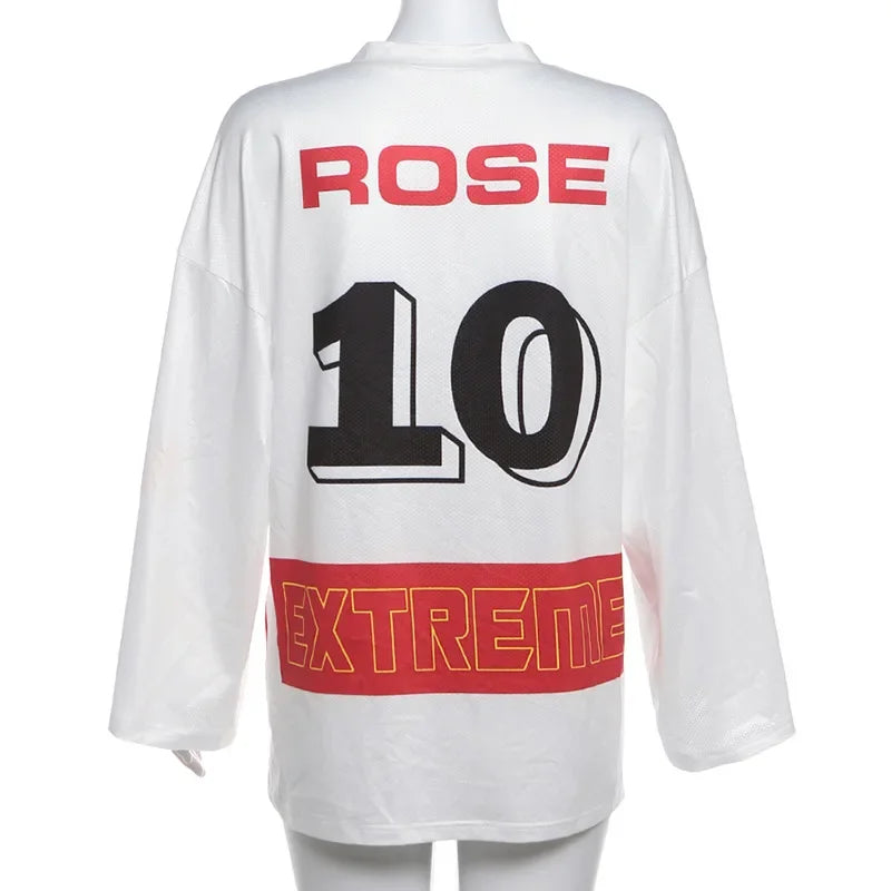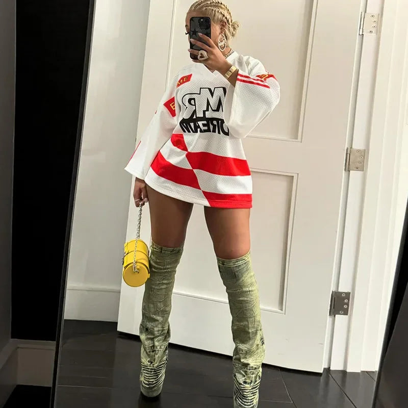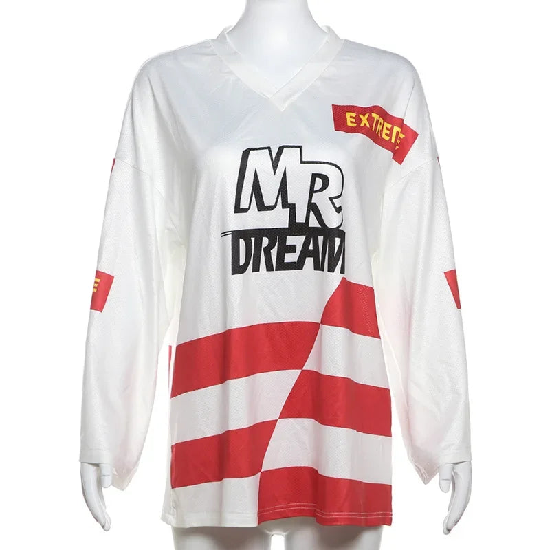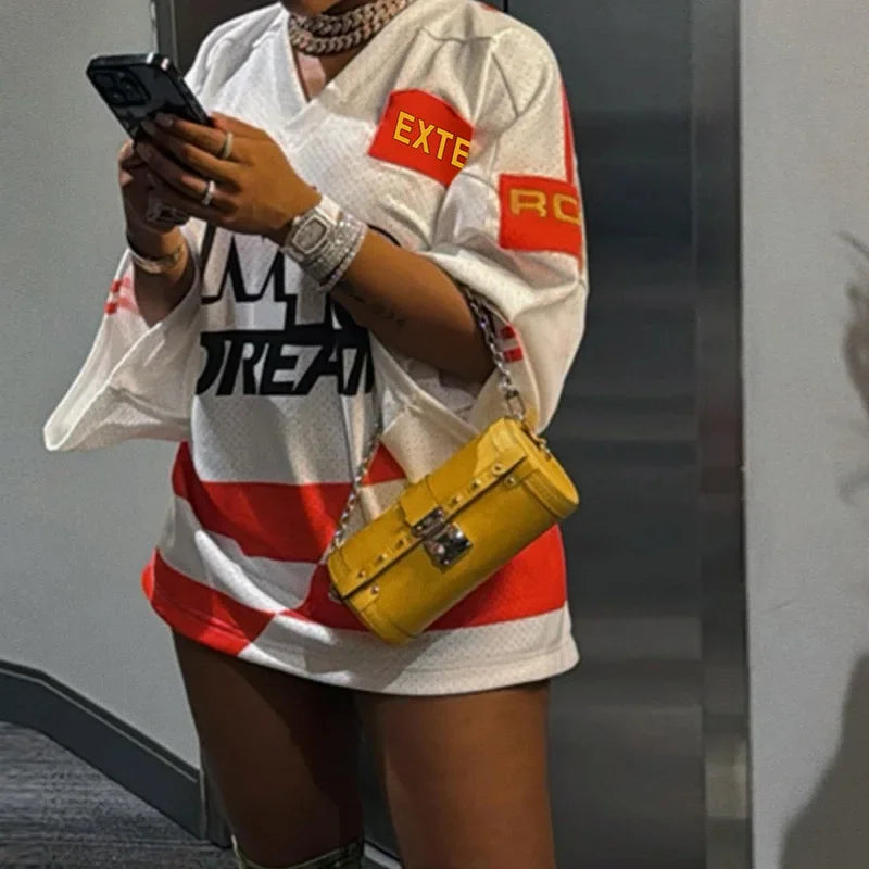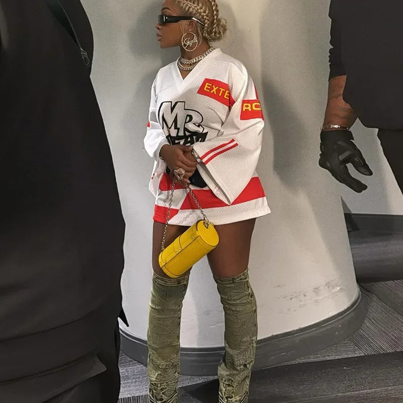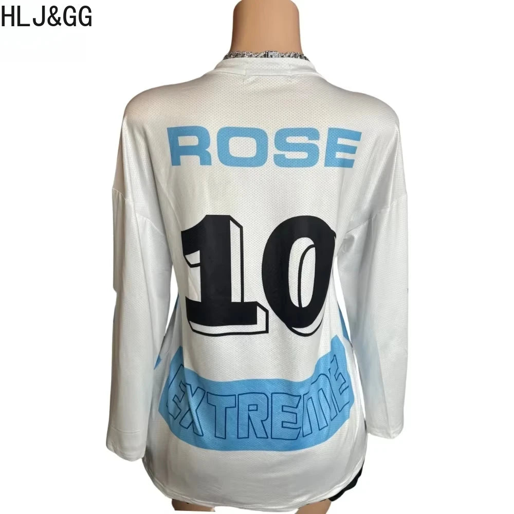 HLJ&GG Y2K Letter Print Mesh Two Piece Sets For Women V Neck Long Sleeve Top + Puffy Mini Skirts Outfits Fashion 2pcs Streetwear