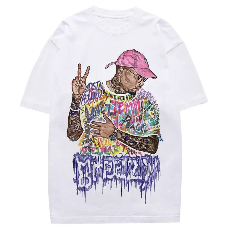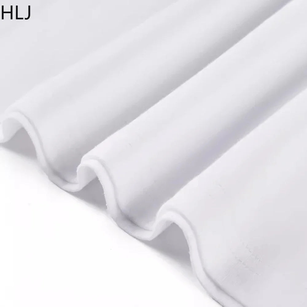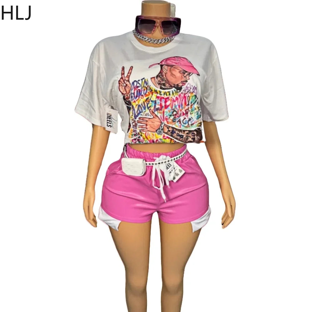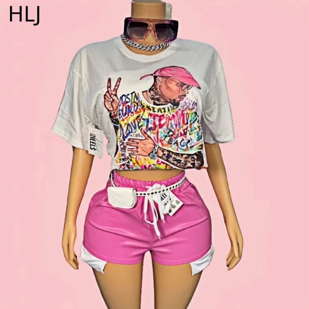 HLJ&GG Y2K Retro Avatar Pattern Printing Two Piece Sets Women O Neck Loose Tshirts+Drawstring Leather Shorts Outfits Streetwear