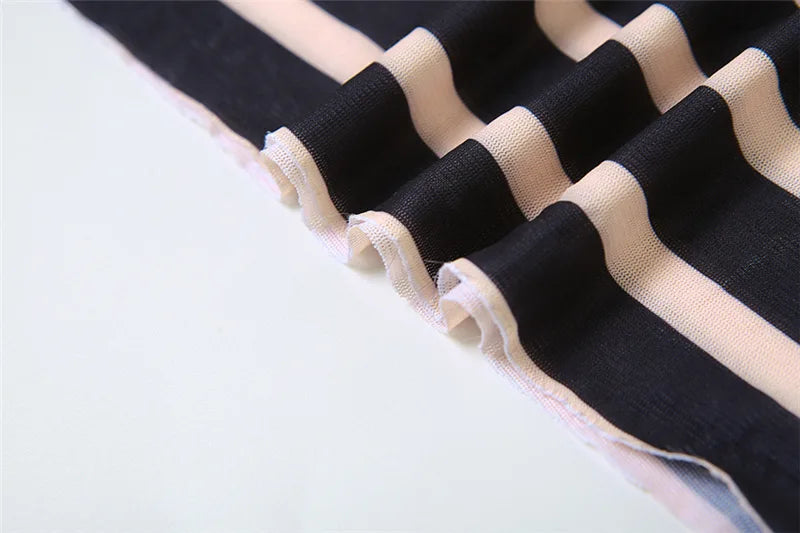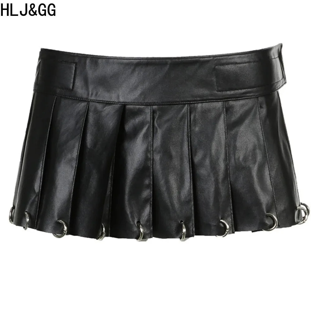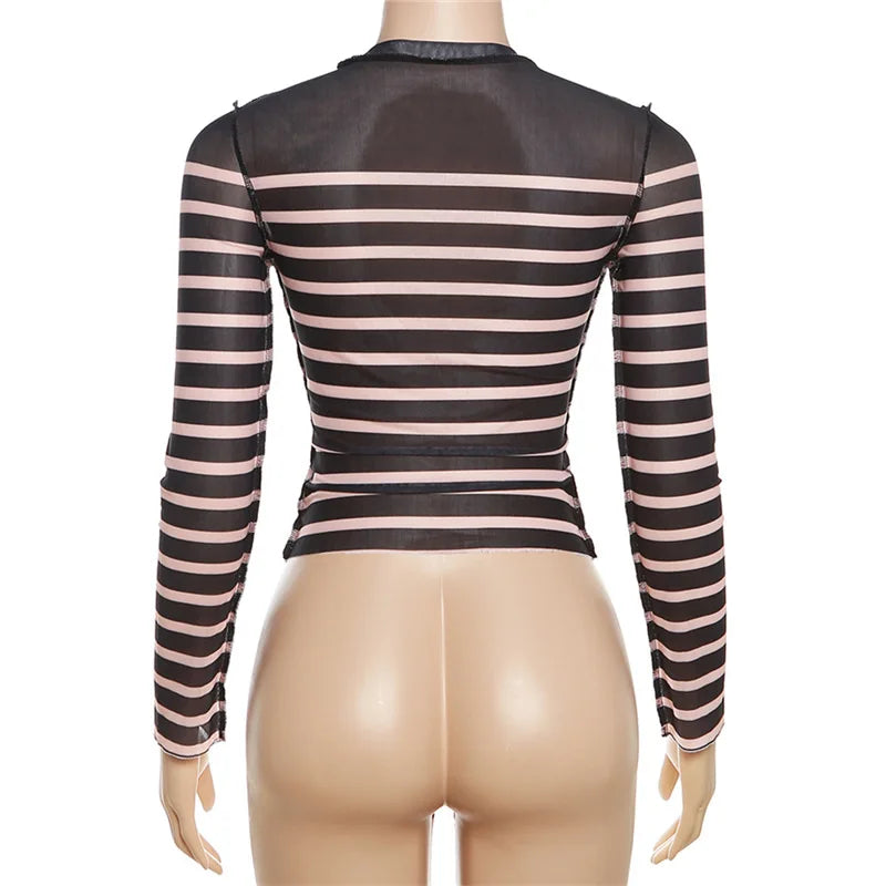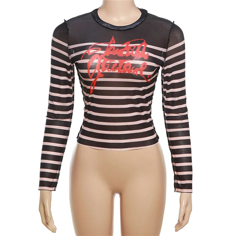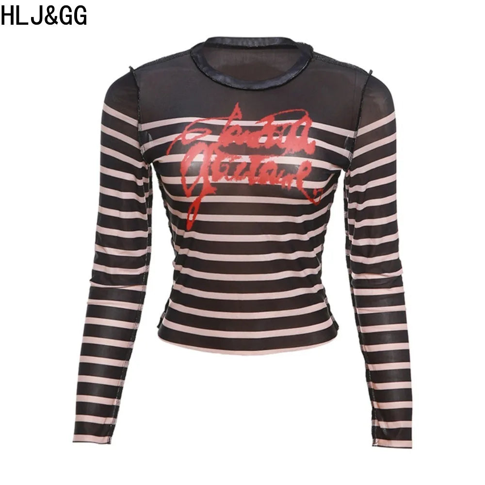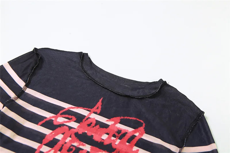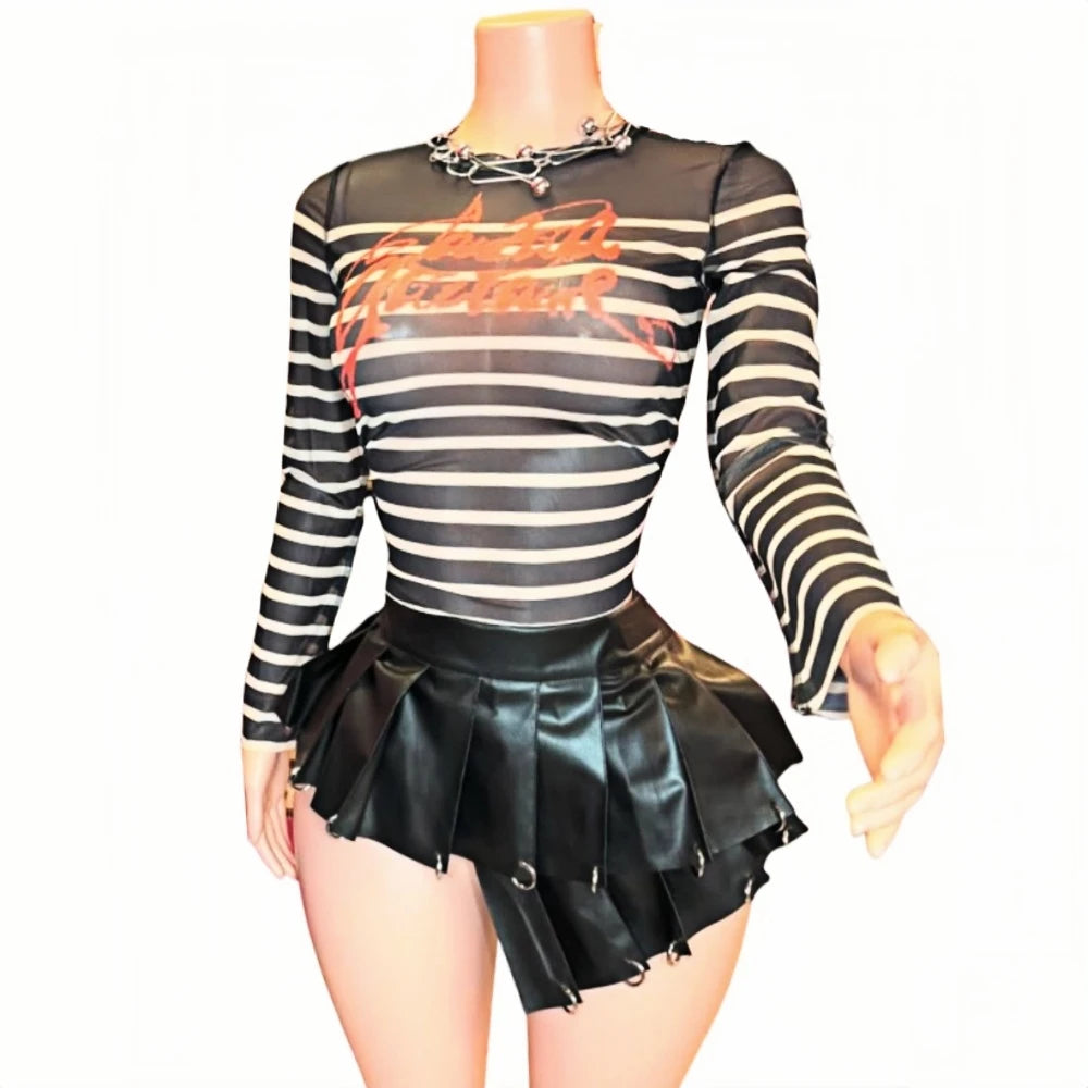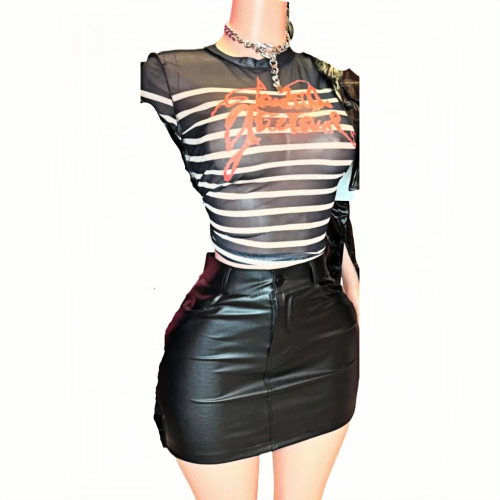 HLJ&GG Y2K Sexy Stripe Letter See Though Two Piece Sets Women Long Sleeve Slim Top And Mini Leather Skirts Outfits Streetwear