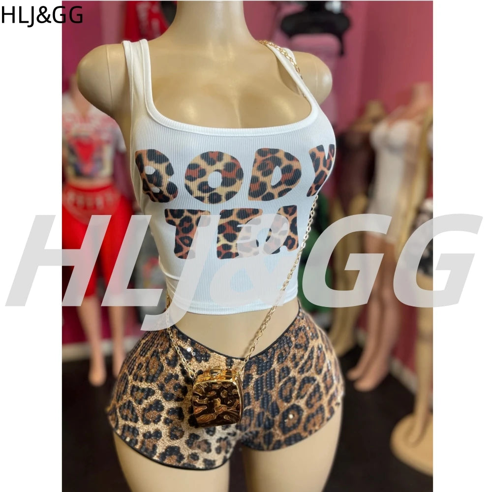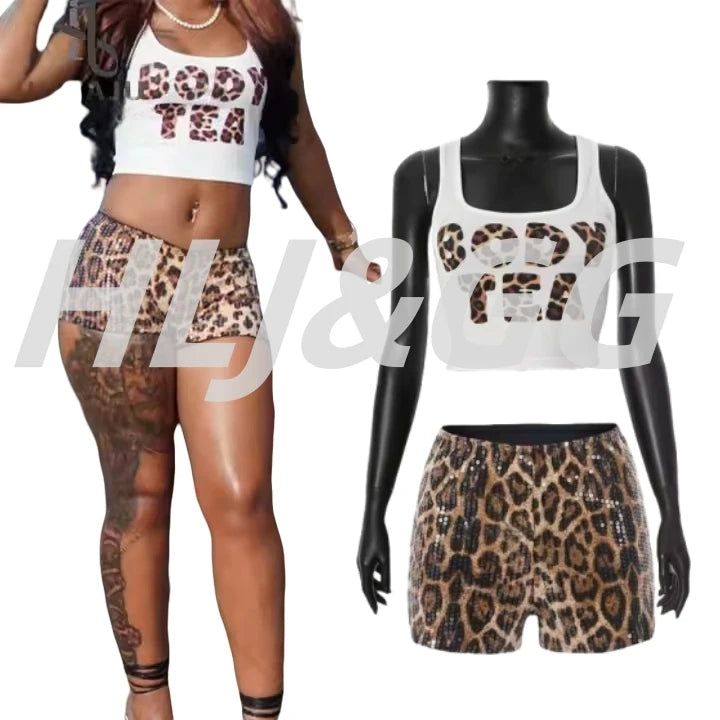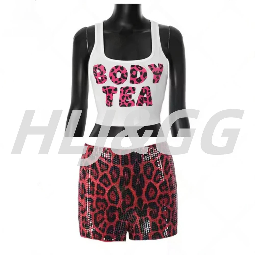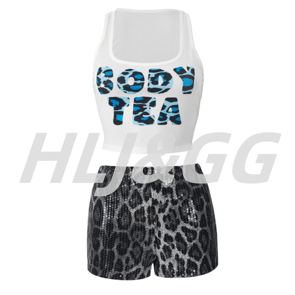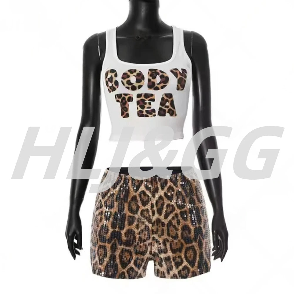 HLJ&GG Y2K Summer New Letter Tank Top Two Piece Sets Women Round Neck Sleeveless Vest + Sequin Leopard Shorts Outfits Streetwear