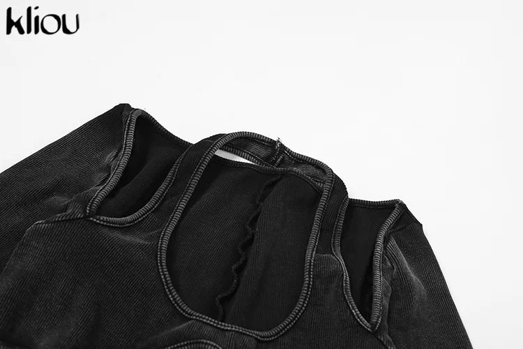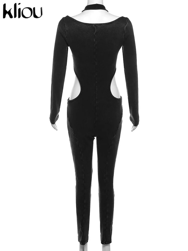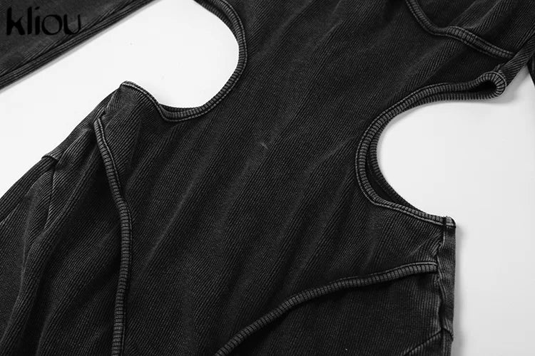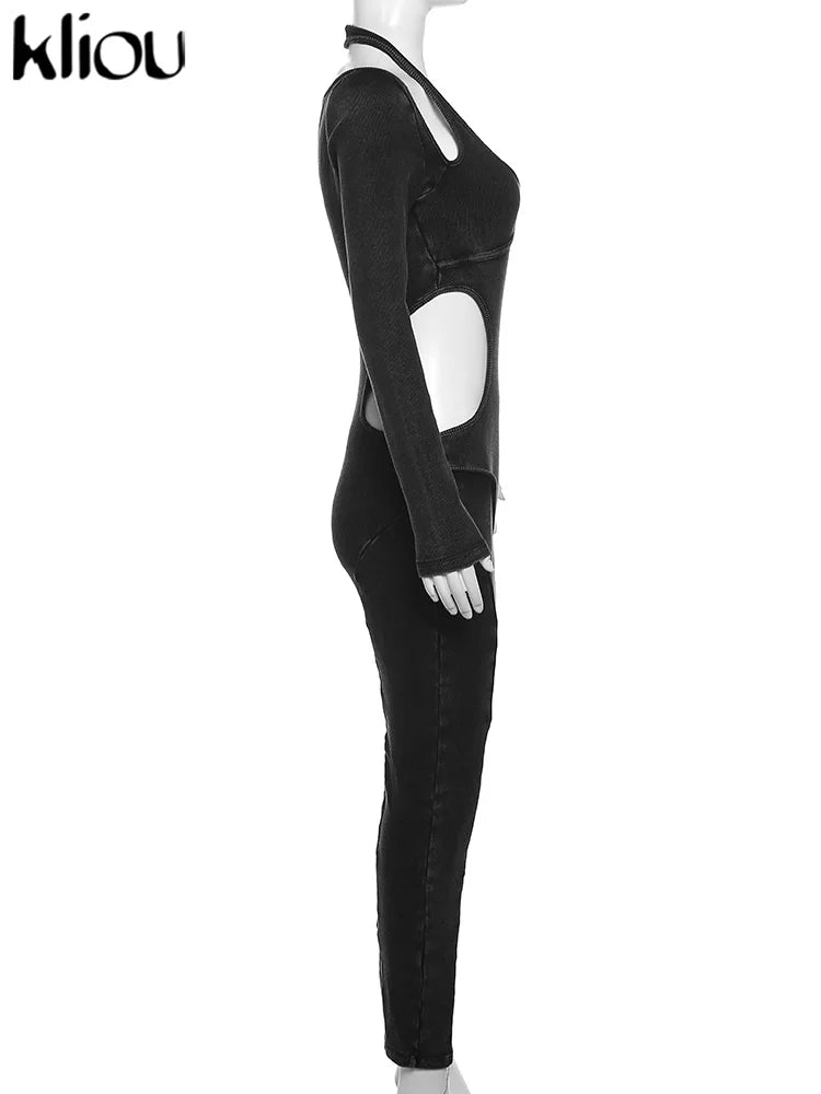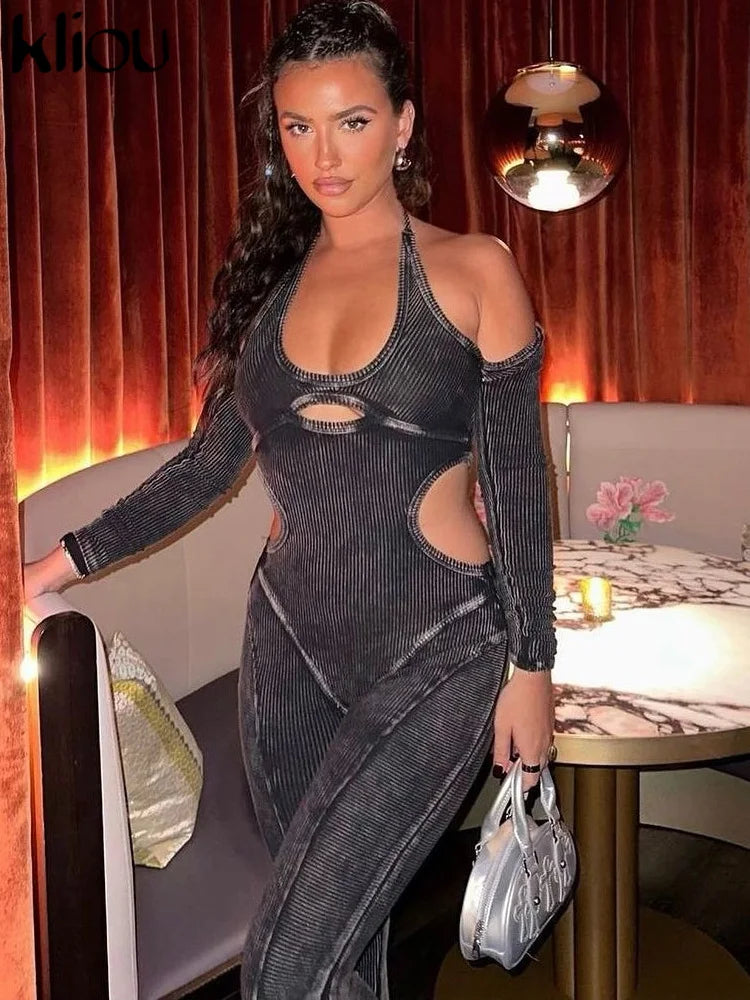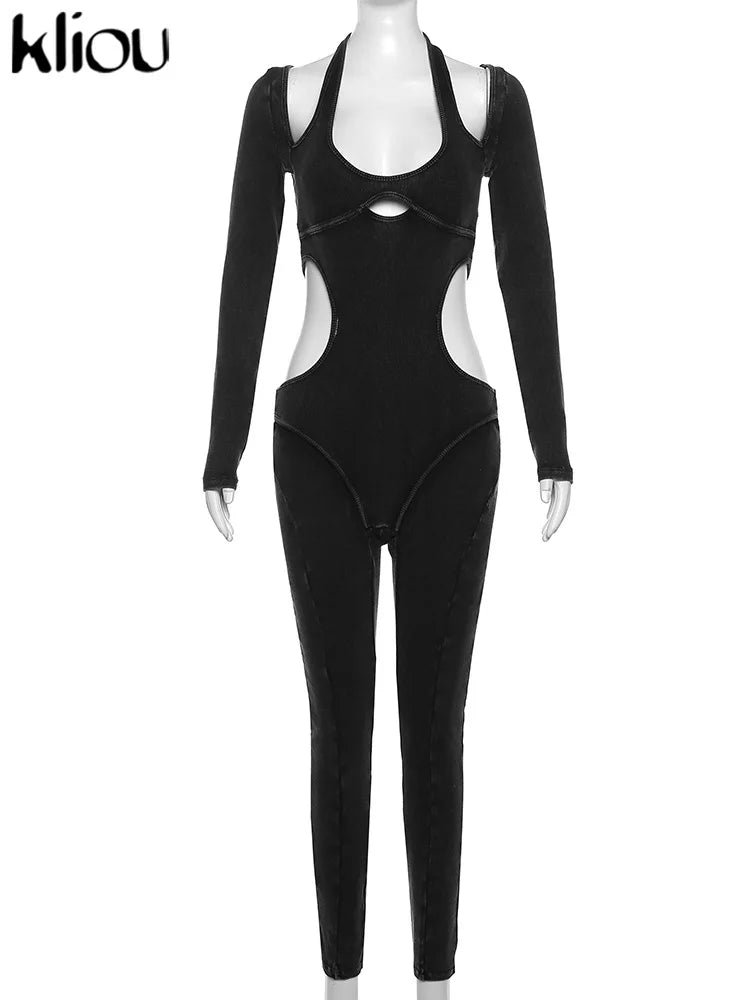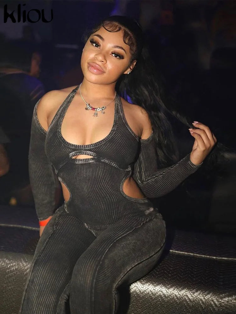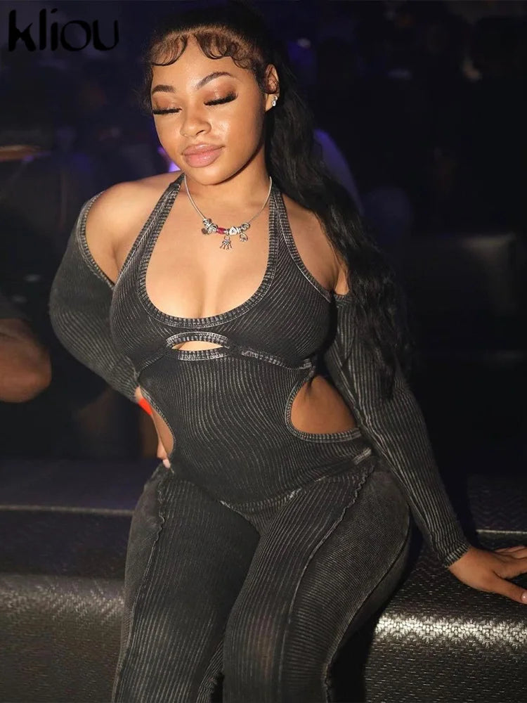 kliou Pure Cotton Jumpsuits ladies Halter Sexy Hollow Out Striped Folds Slim Fit Sexy Cleavage Overalls Stage Attirewear