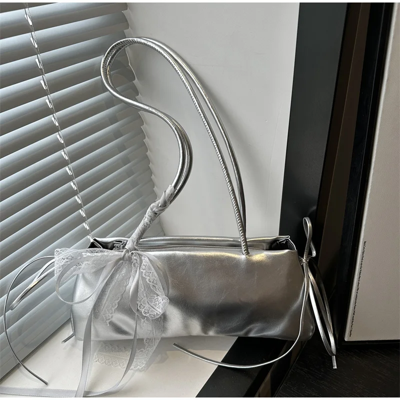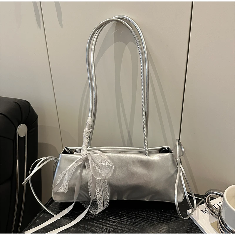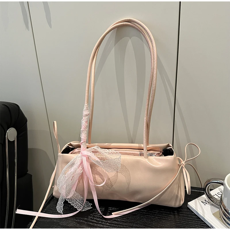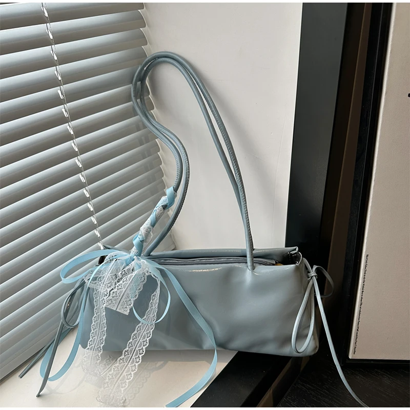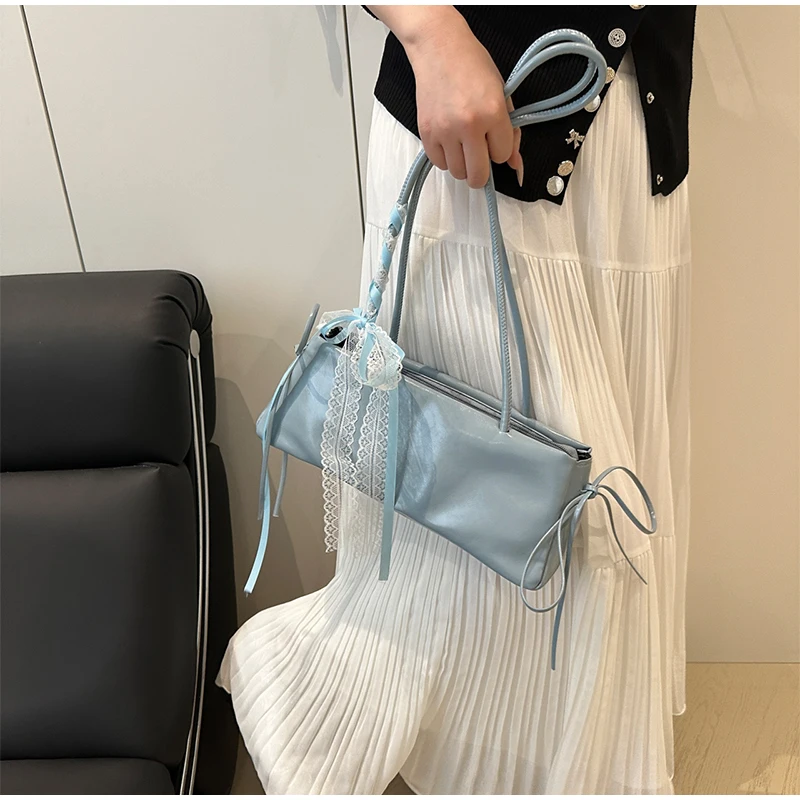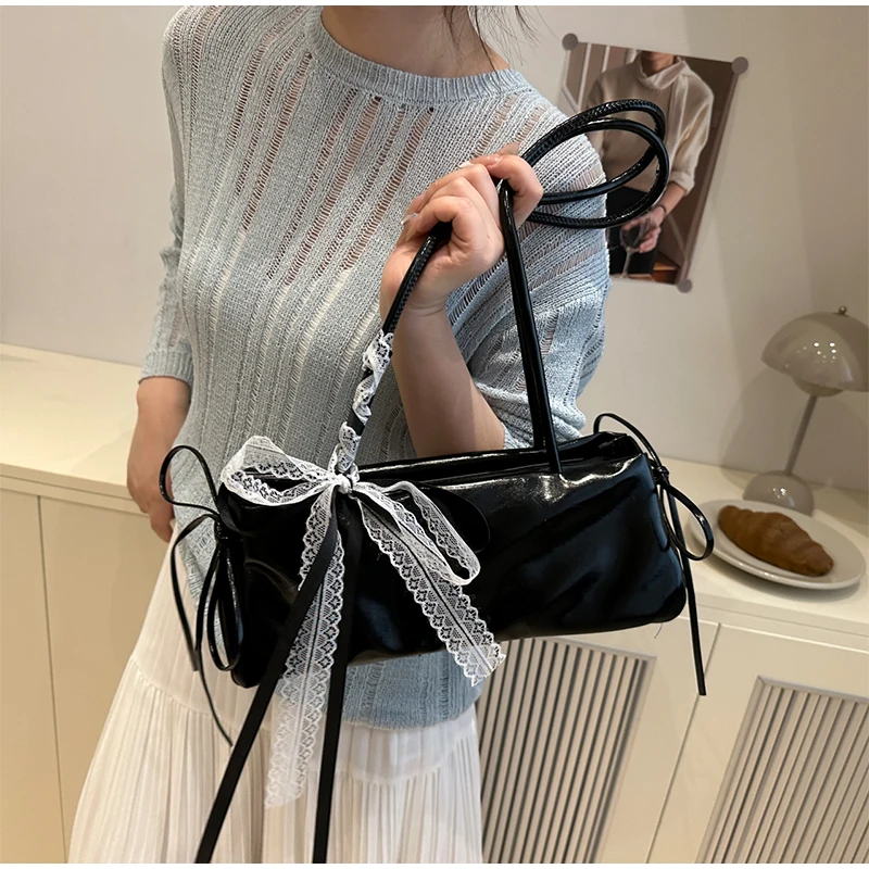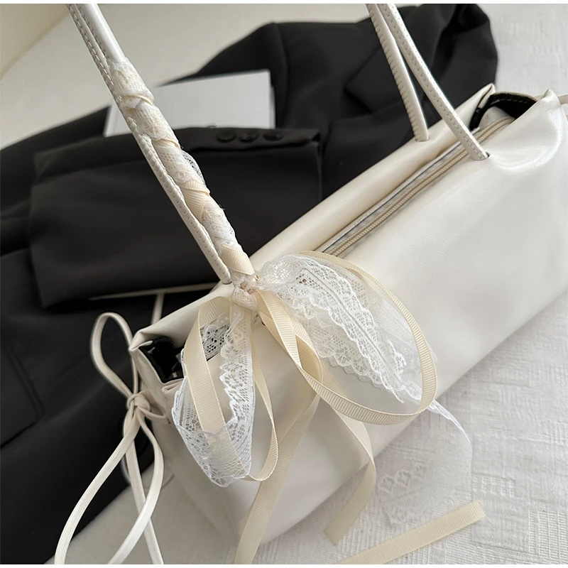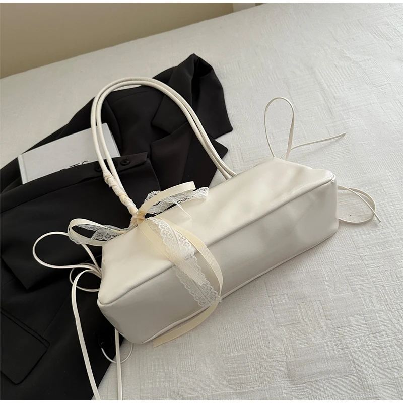 Korean Bow Ribbon Handbag Fashion Lace Square Shoulder Bag French Elegant Baguette Bag Leisure Large Capacity Tote Underarm Bag