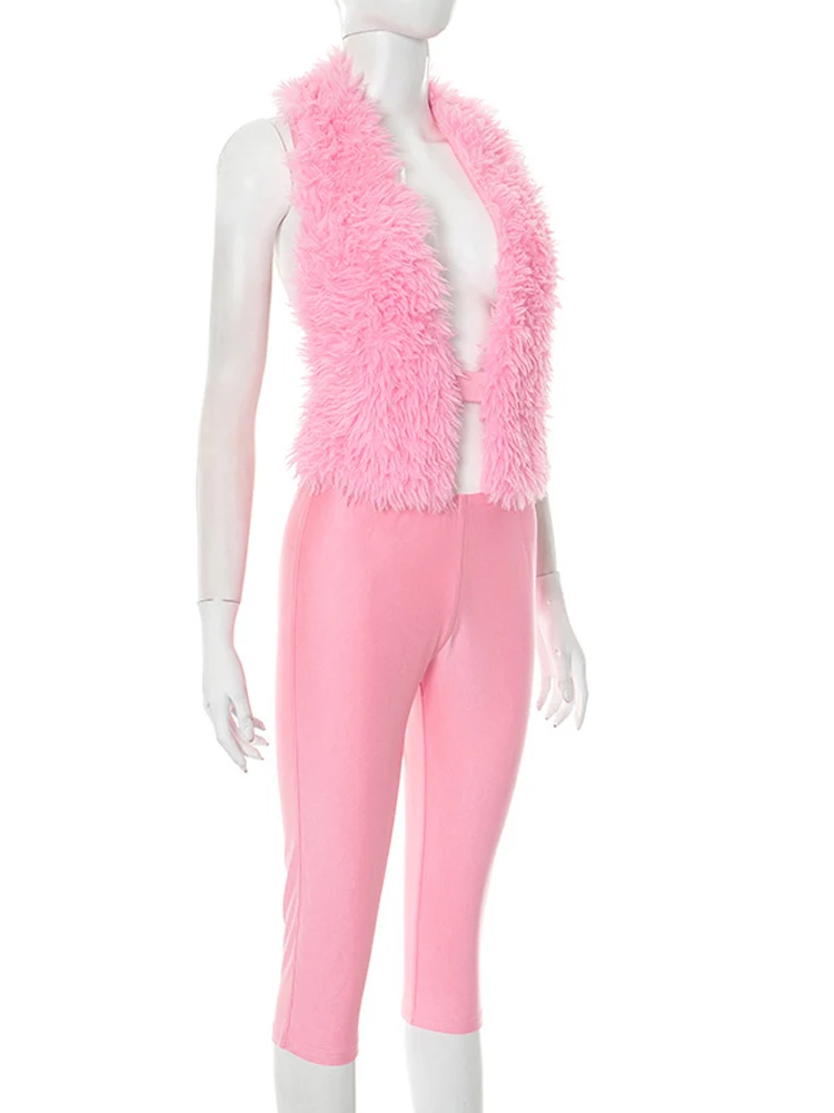 Kricesseen Cute Girls Furry Crop Top And Legging Suits Set Pink Outfits, Tie-Back Biker Shorts Set Night Clubwear Overalls