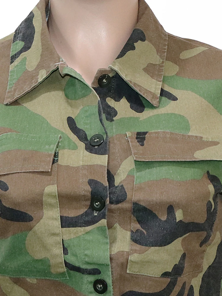 Kricesseen Fashion, 2 piece Button-Up Camouflage Green Jacket Top And High Slit Skirt Set 2 Piece Outfit Night Clubwear Overalls