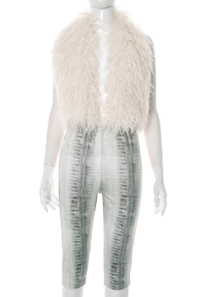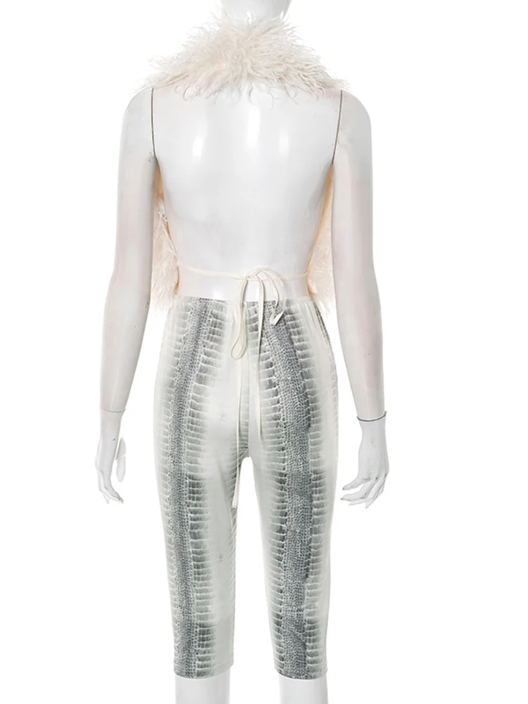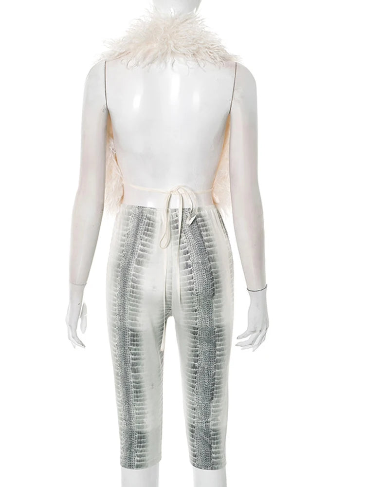 Character: Gorgeous Womens Backless Furry Crop Top And Leopard Print Biker Shorts Set