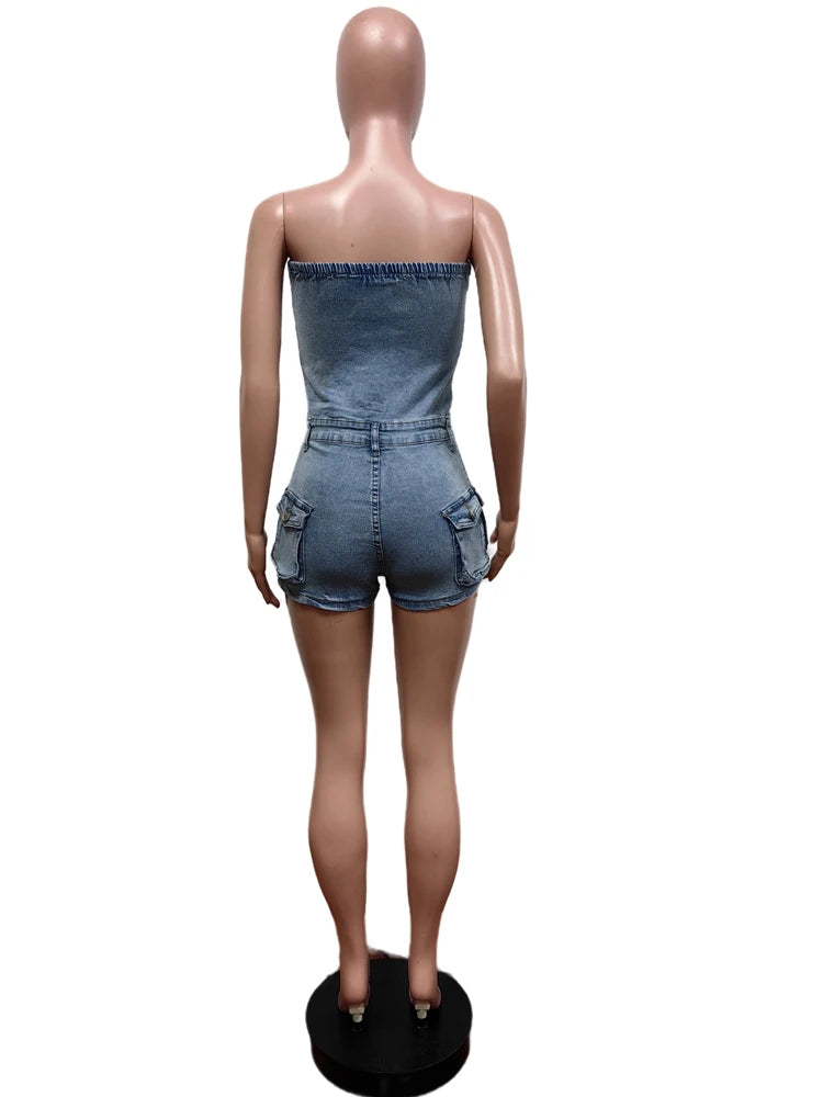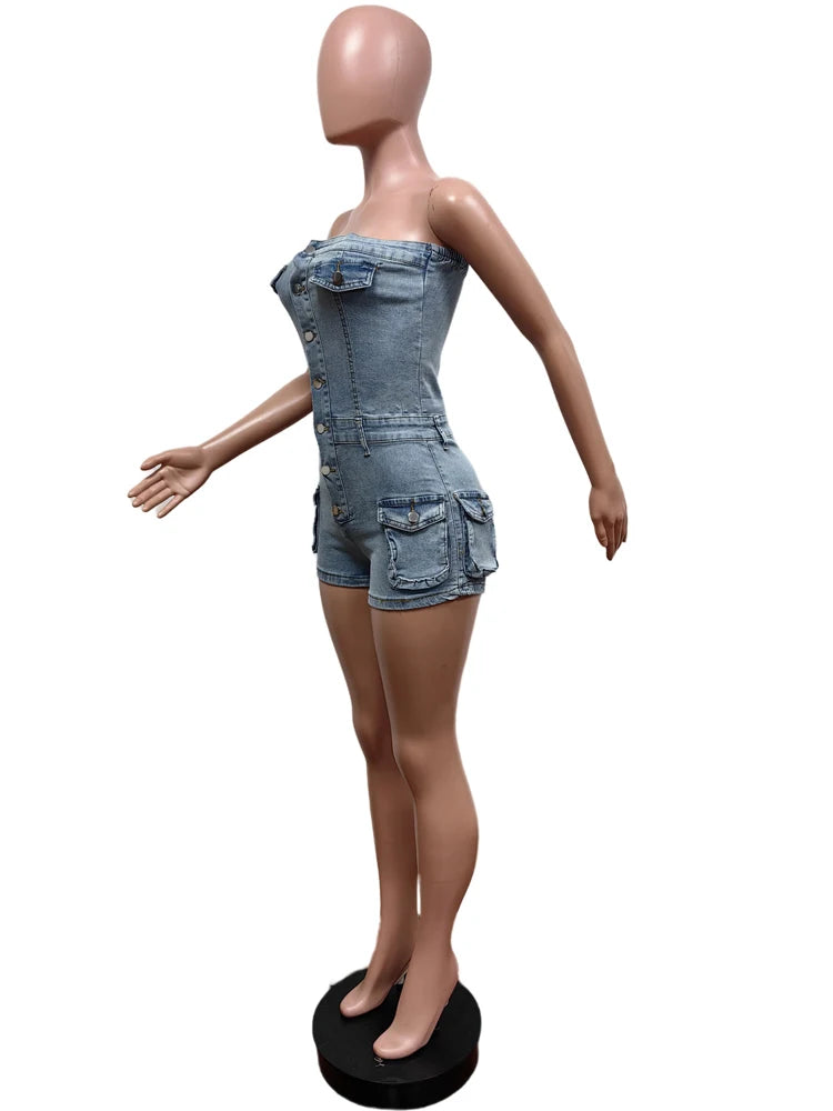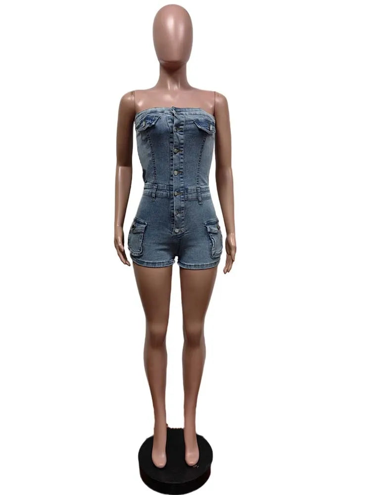 Kricesseen High Street Button Details jeans Jumpsuits Overalls For Women Strapless Pockets Jeans Playsuits Night Out Bodysuits