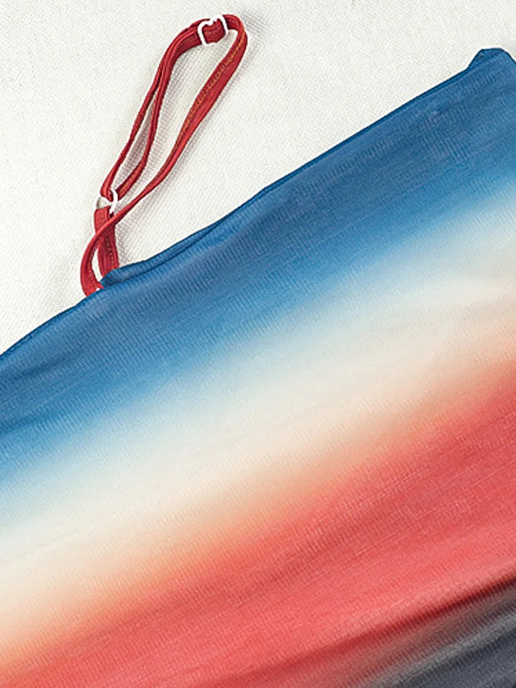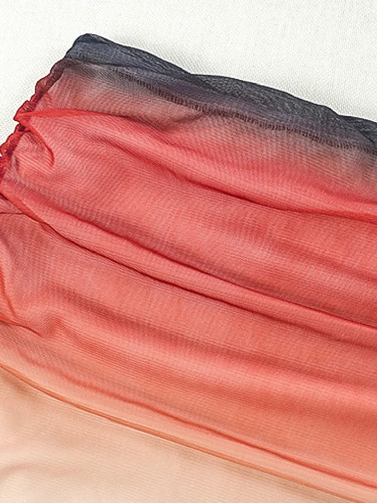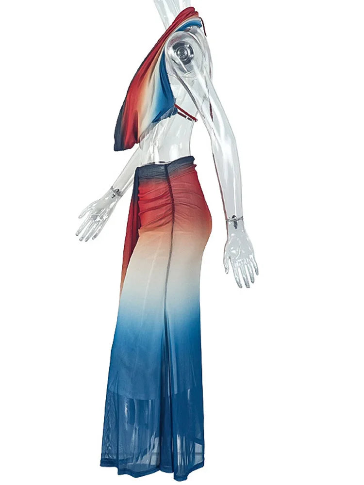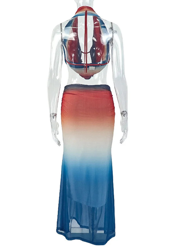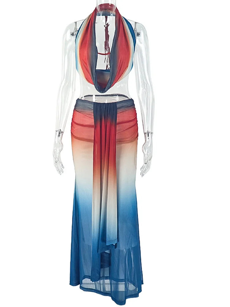 Kricesseen Sexy Gradient Halter Neck Mesh Ruched Ombre Two Pieces Dress Summer Sheer Mesh Long Straps Skirt Set Swimsuits Set