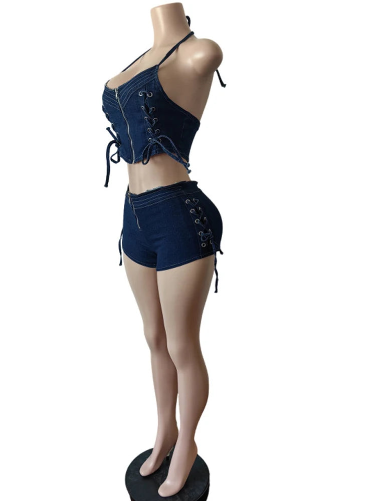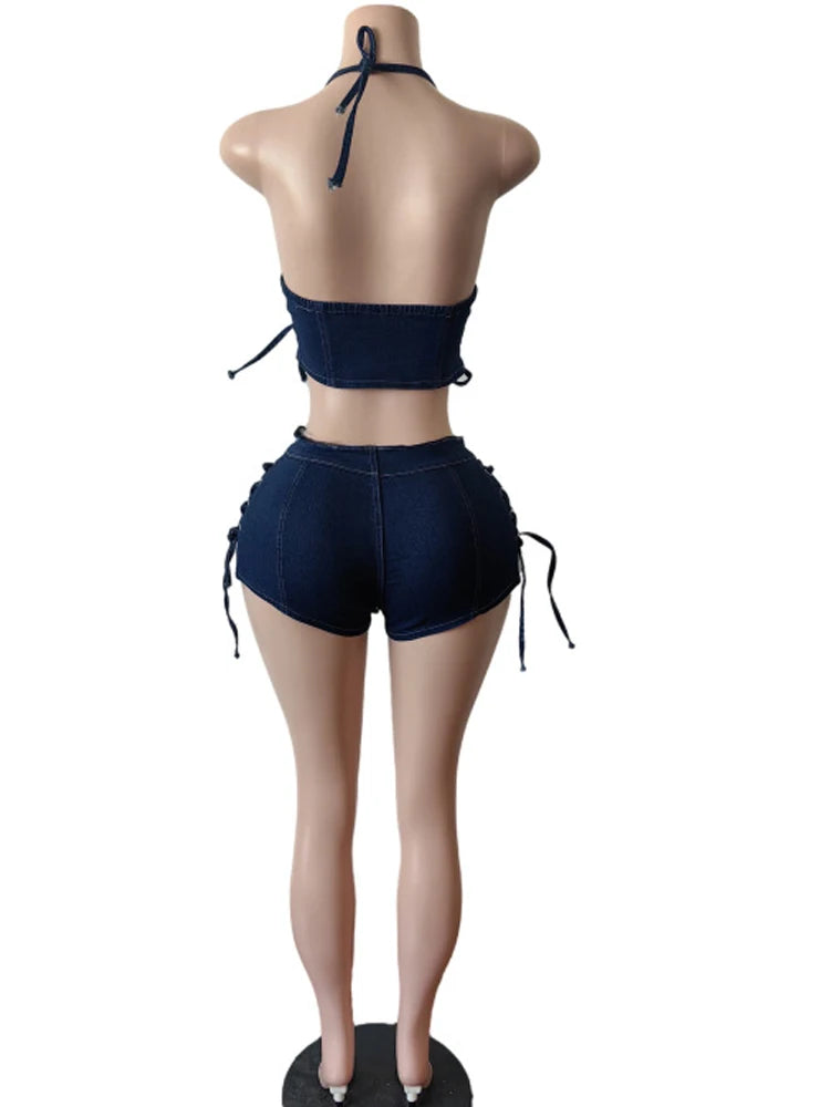 Character: Sexy Lace Up Denim Bustier Top And Matching Denim Set