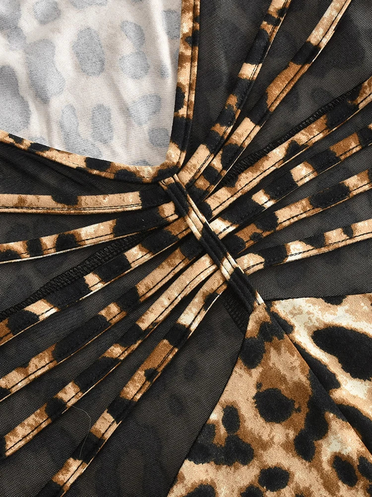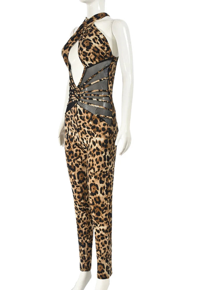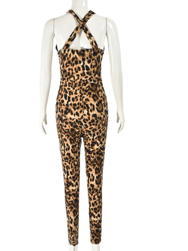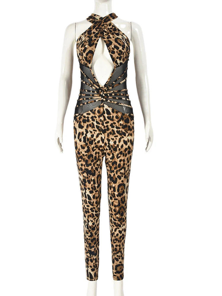 Kricesseen Sexy Leopard Hollow Out Details Skinny Jumpsuits Women Print Backless Halter Fitted Rompers Clubwear Outfits