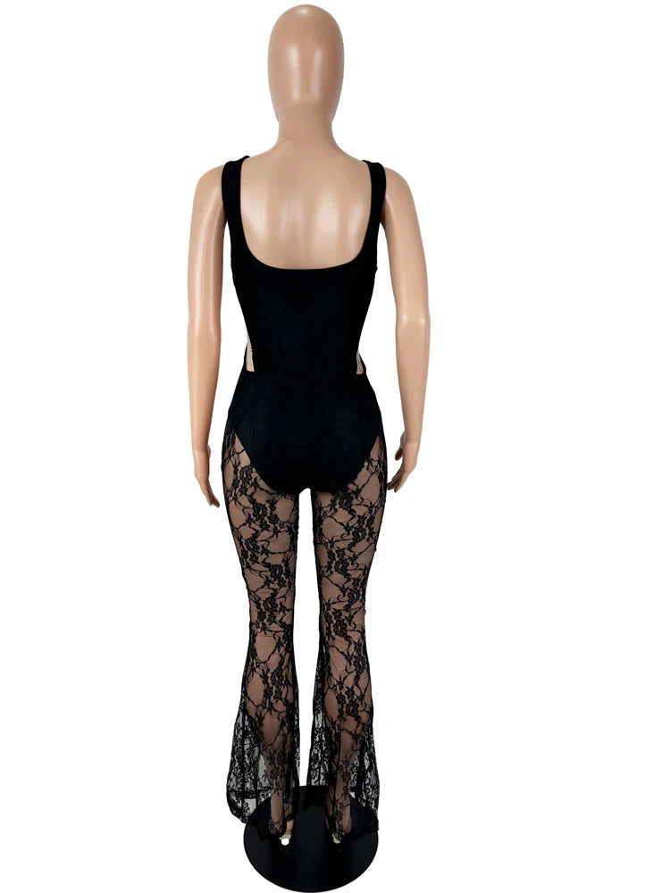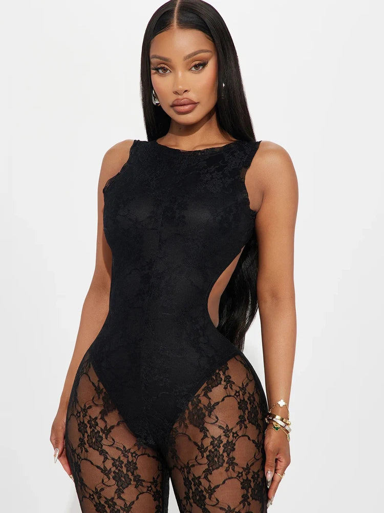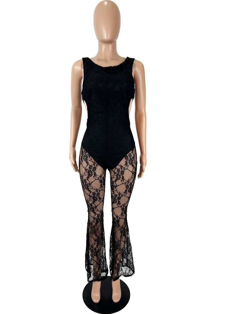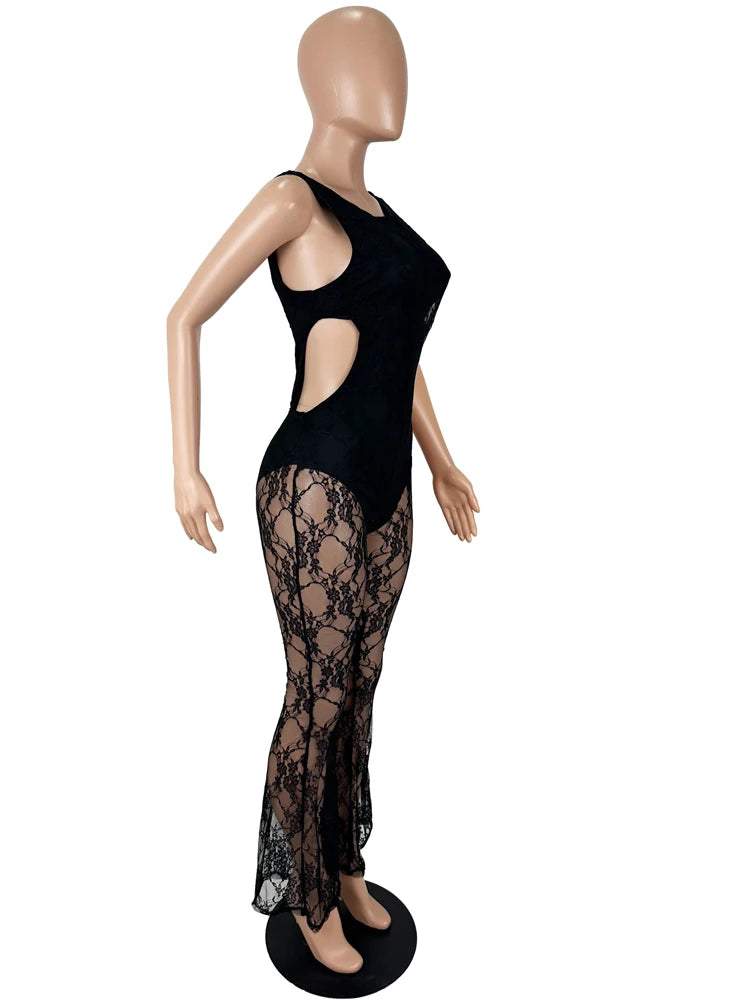 Character: Women's Cut-Out See-Through Sheer Lace Jumpsuits