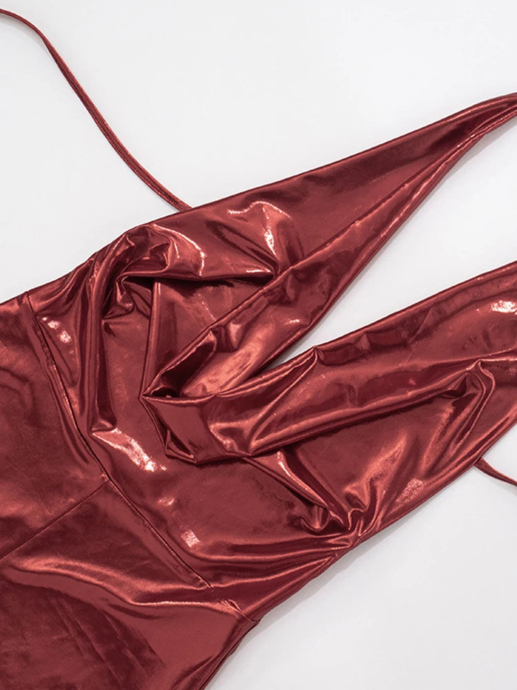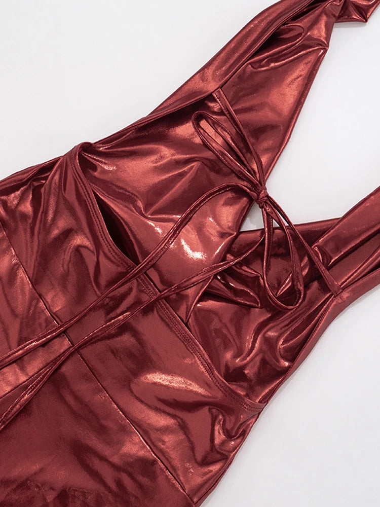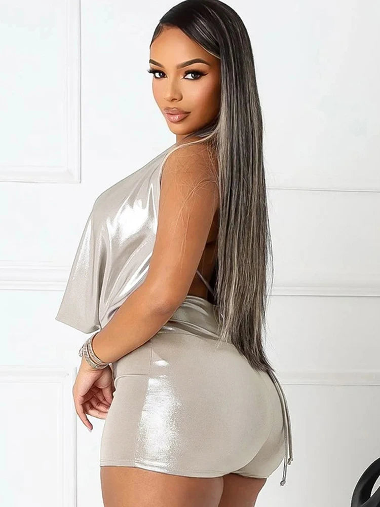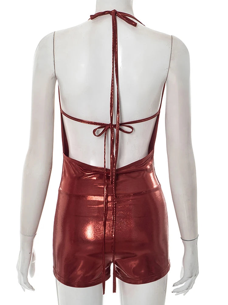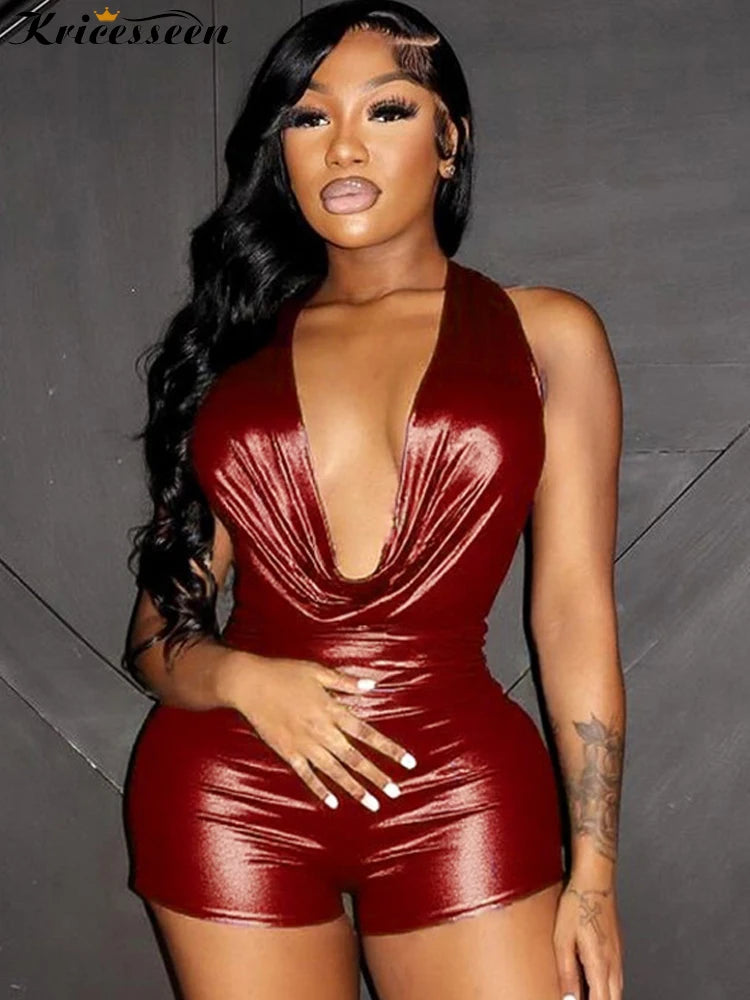Kricesseen Women's Glitter Halter Neck Draped Metallic Rompers Glam Shiny Backless Leather Playsuits Night Out Overalls Clubwear