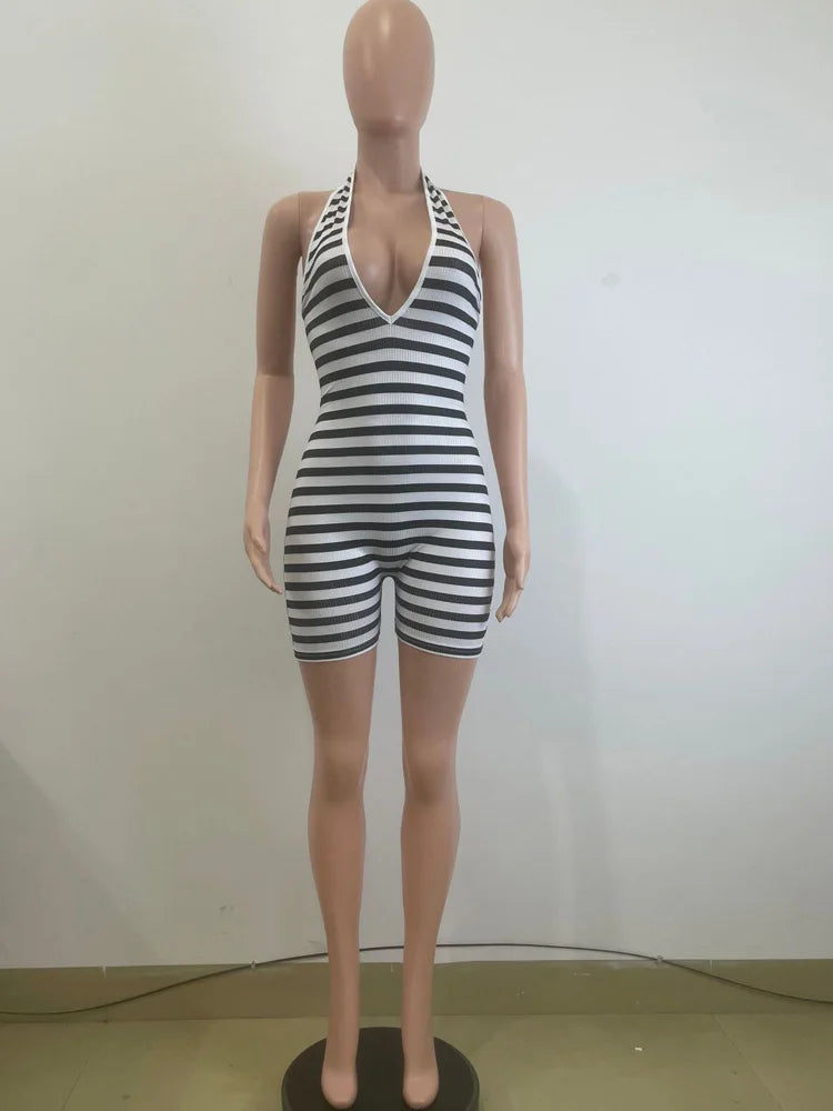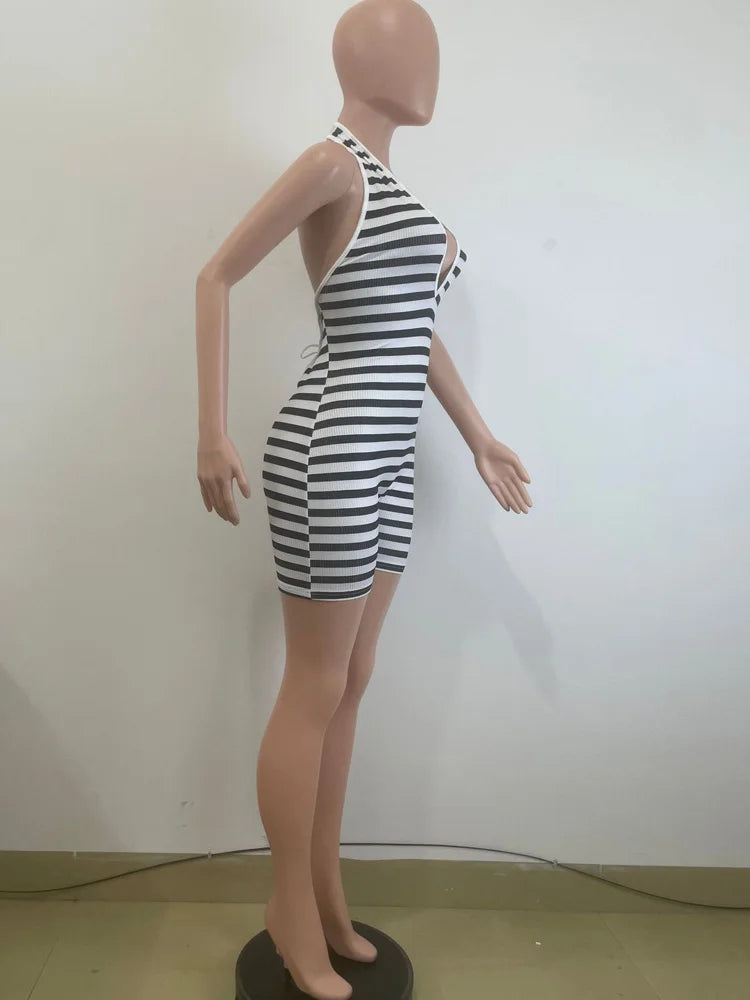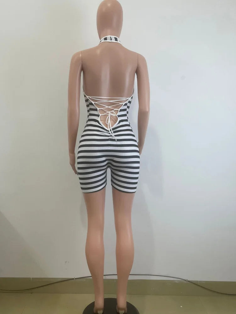 Kricesseen Women's Halter V Neck Backless Striped Playsuits Rompers Sexy Tie-Back Bandage Rompers Night Club Overalls Clubwear