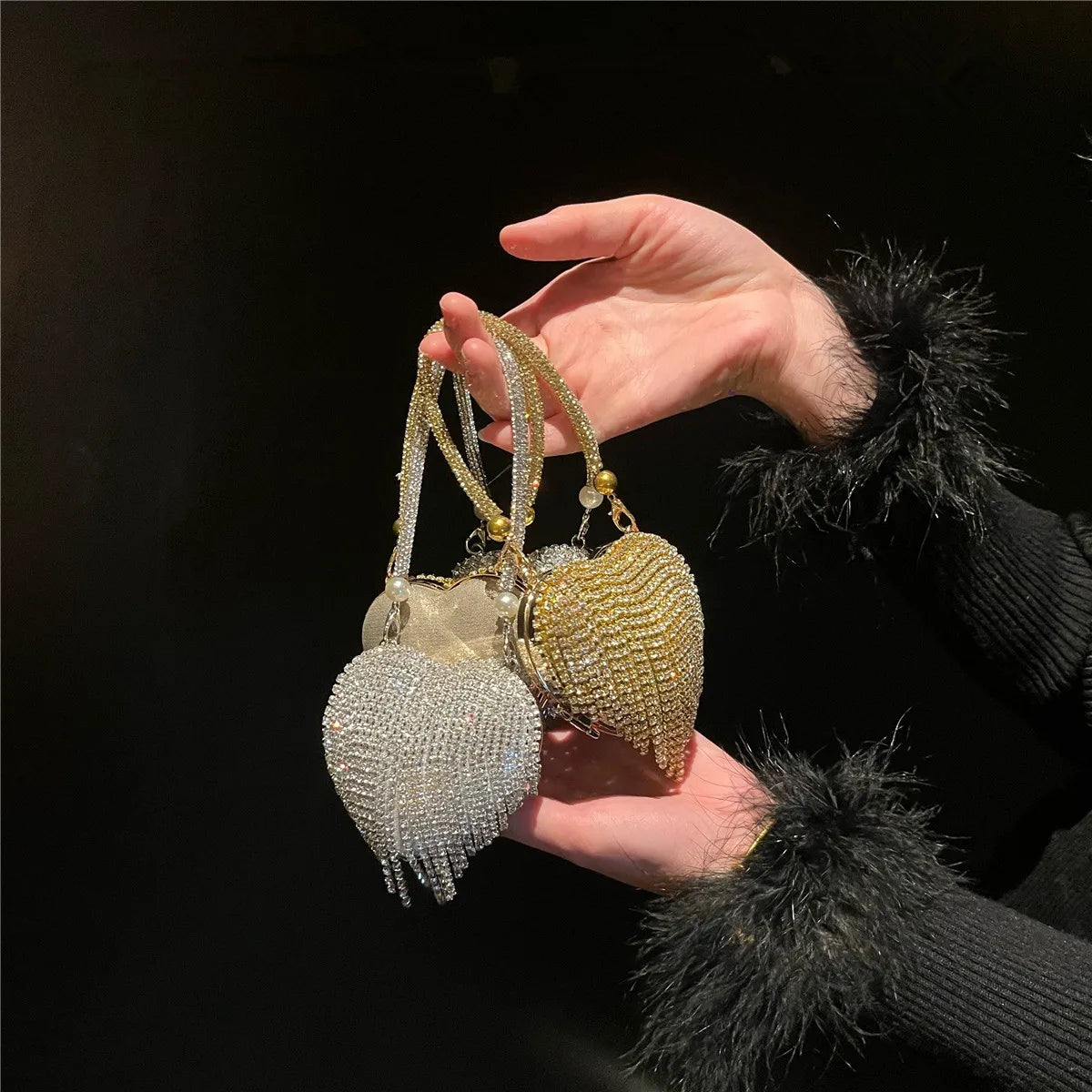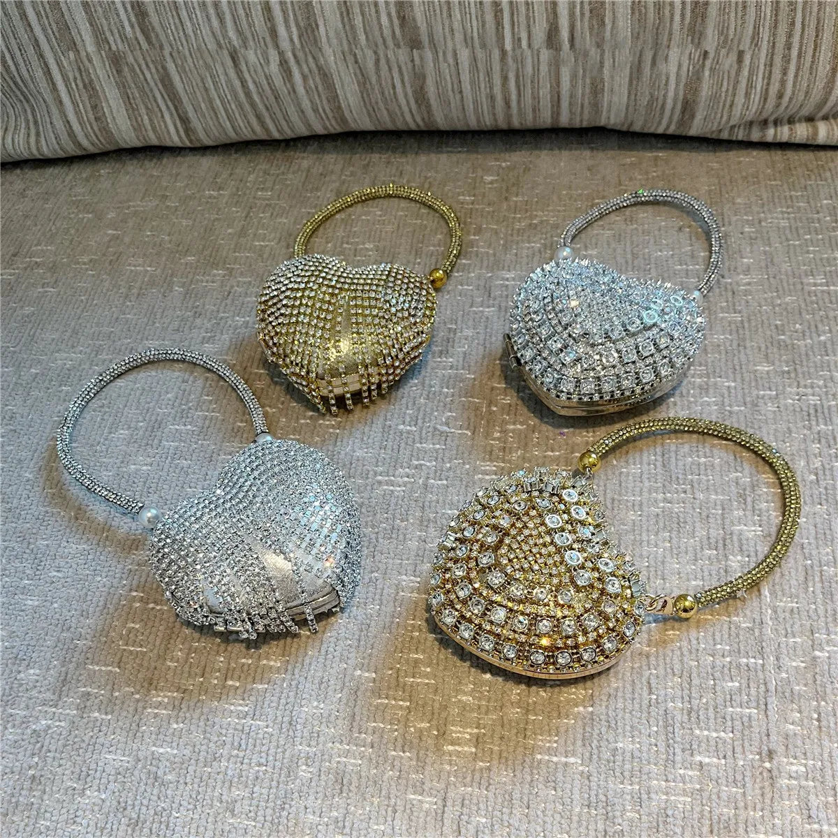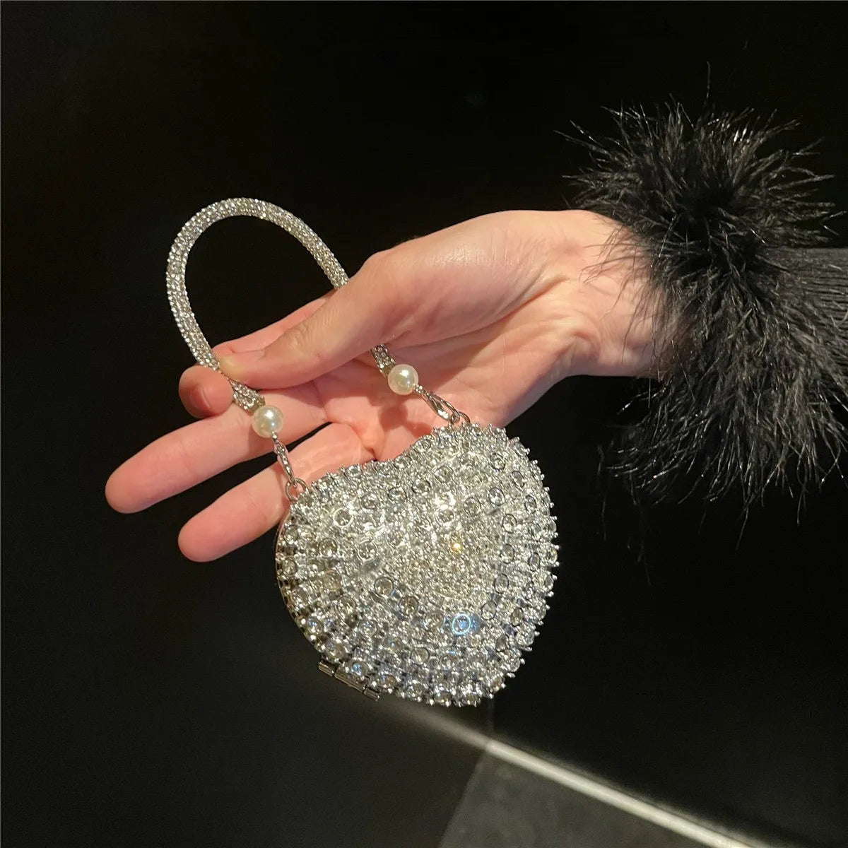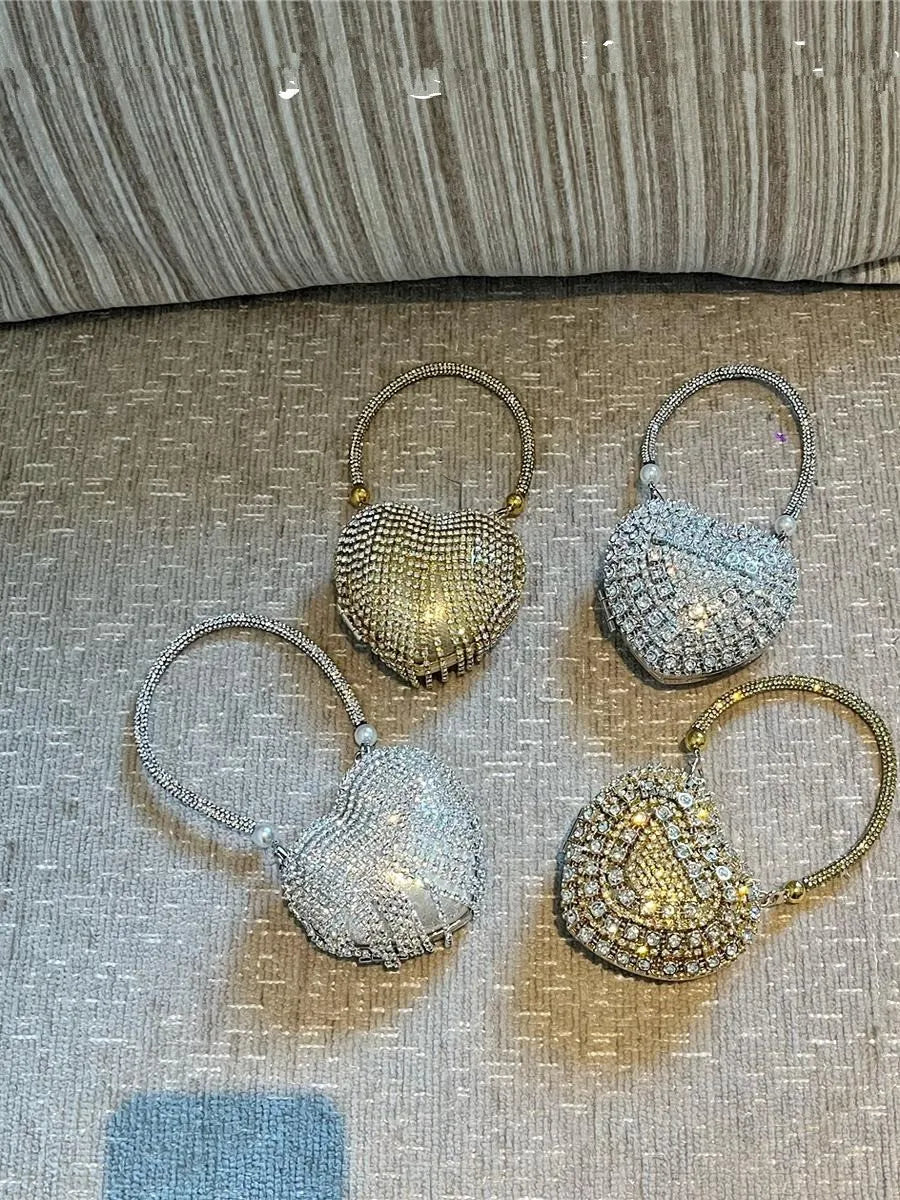 Luxury Small Bling Heart Shape Diamond Evening Clutch Rhinestones Purse Ladies Fashion Bag Designer for Women Chain Shoulder Bag