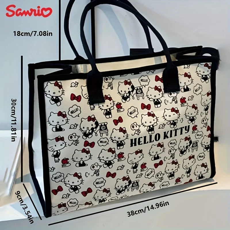 MINISO Sanrio Hello Kitty Canvas Handbag Large Capacity Zipper Shoulder Bag Lightweight Cute Fashion Weaving Tote Bag