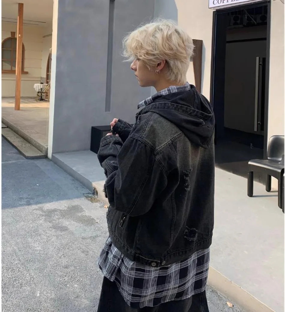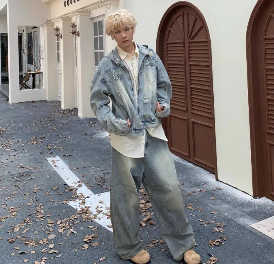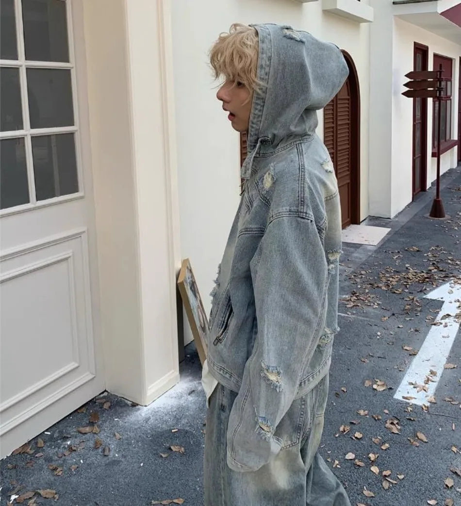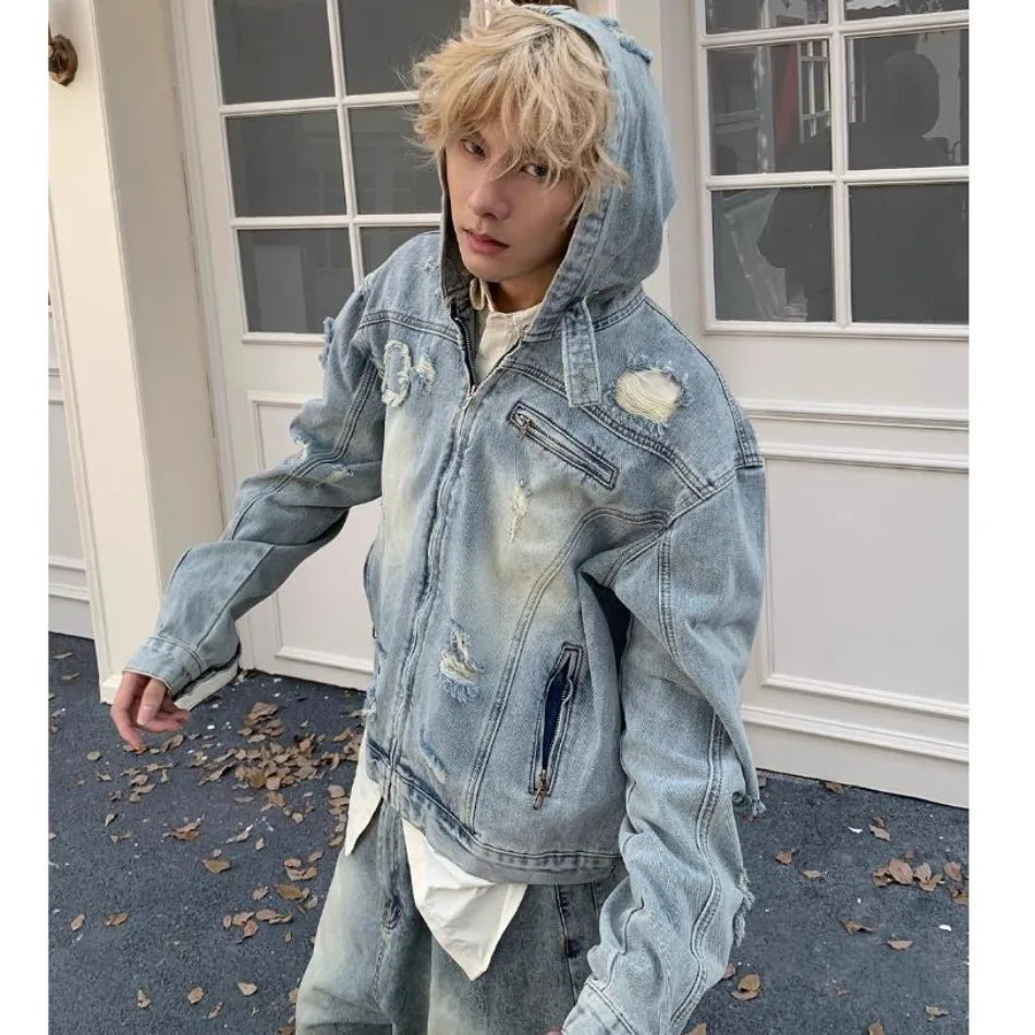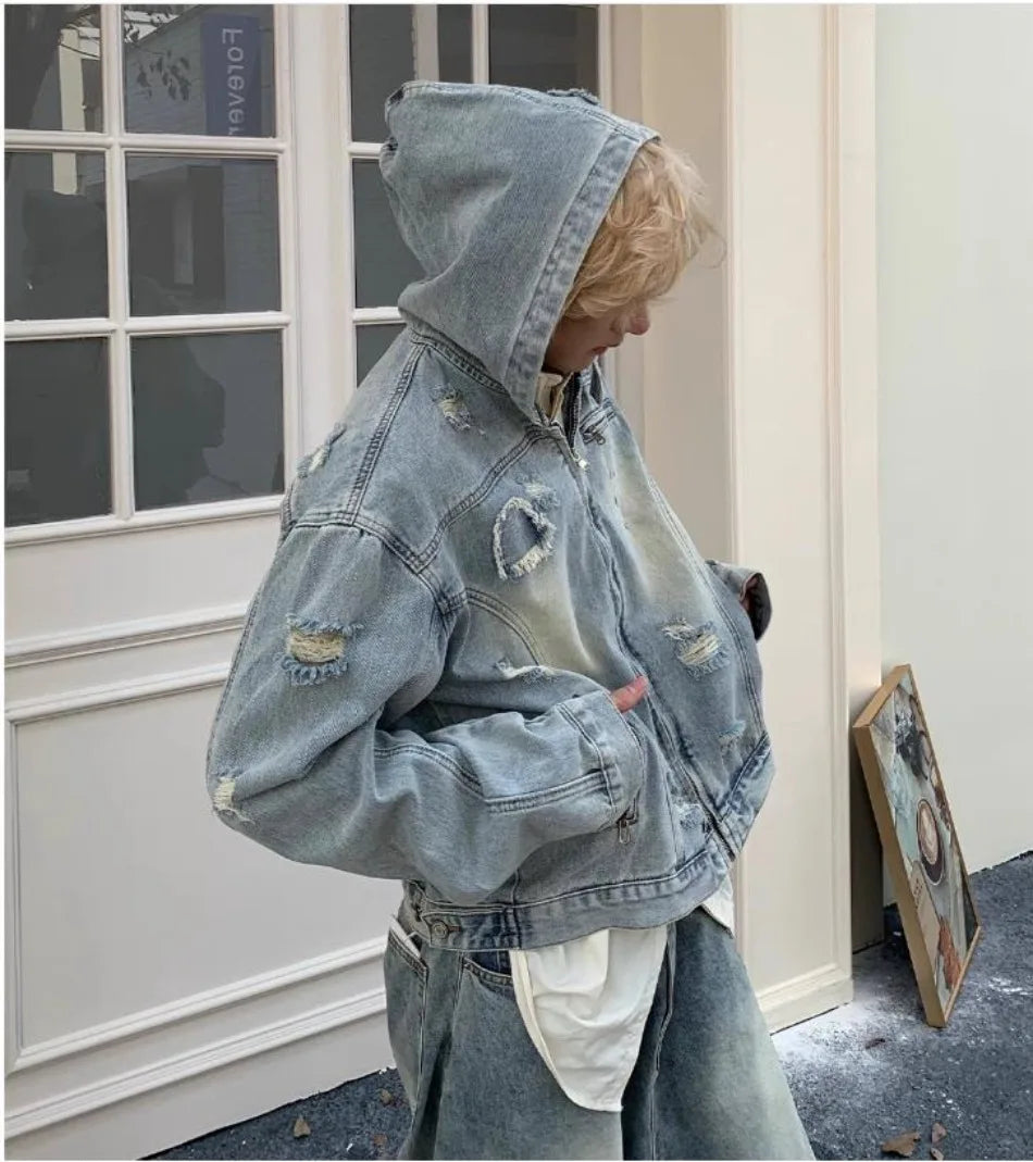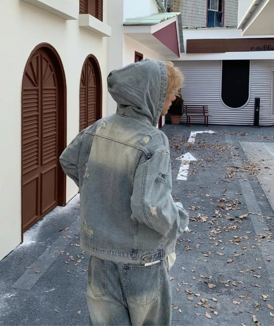 New Hooded Mens Denim Jacket 2024 American Retro High Street Loose Couple Tops Hip Hop Streetwear Trendy Washed Cowboy Coats